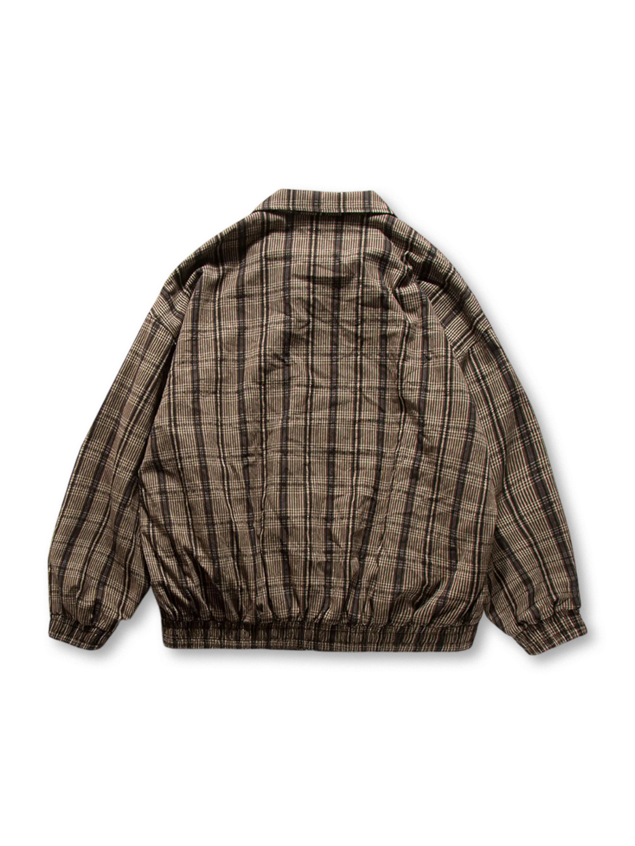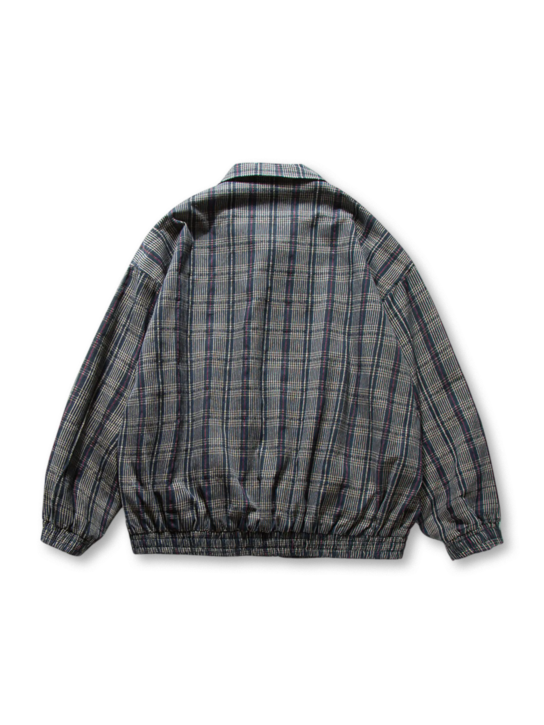 レトロなチェック柄が目を引く一着で、襟付きデザインとワーク感を意識したカバーオール風ディテールが特徴。裾と袖口にゴムを配し、ふんわりとしたボリュームのあるシルエットを演出。100%コットン生地を使用し、春秋のライトアウターとしても活躍します。デニムやチノパンなど、さまざまなボトムスとの相性も良く、日常からアウトドアまで幅広いコーディネートに対応可能。