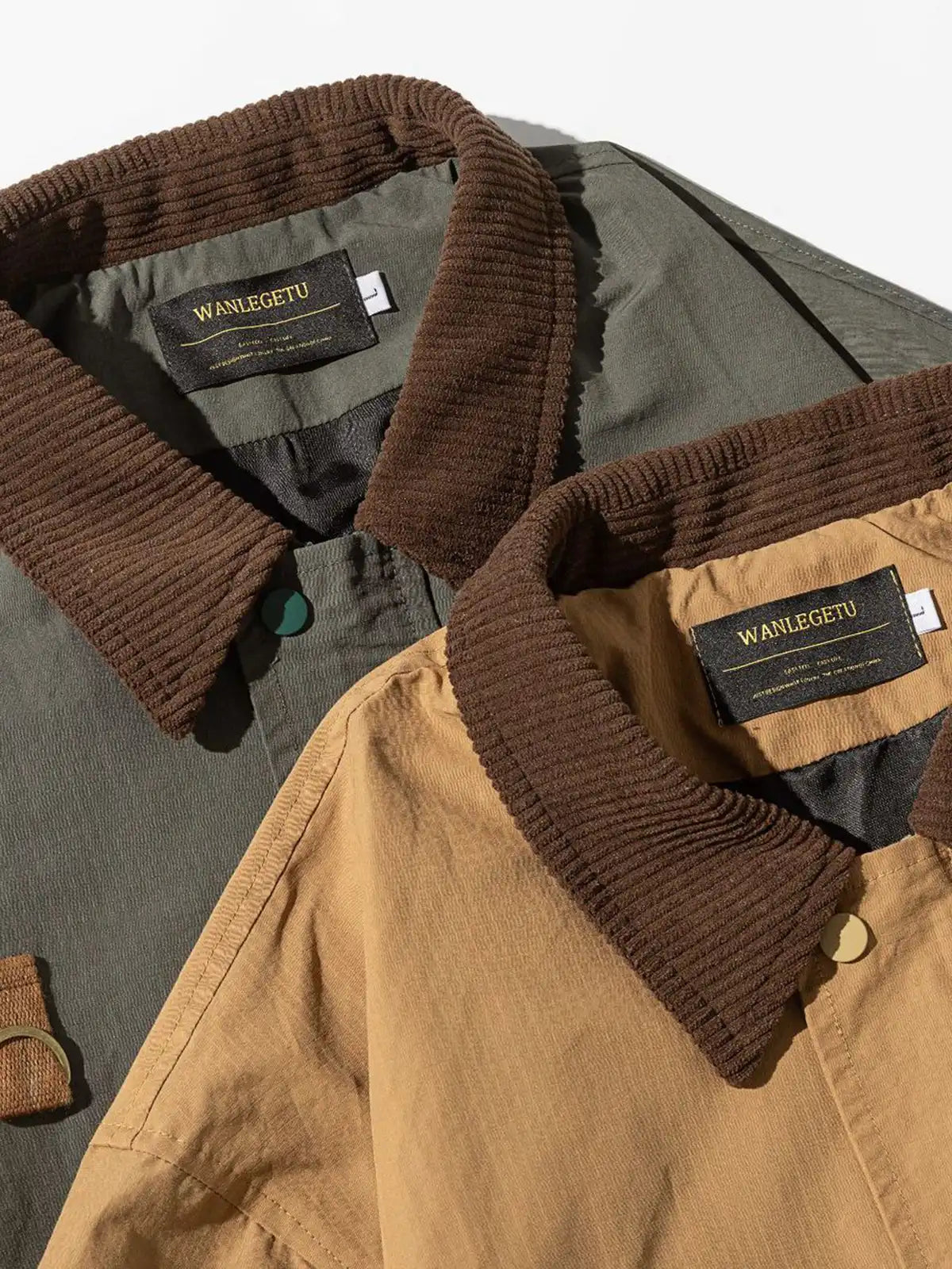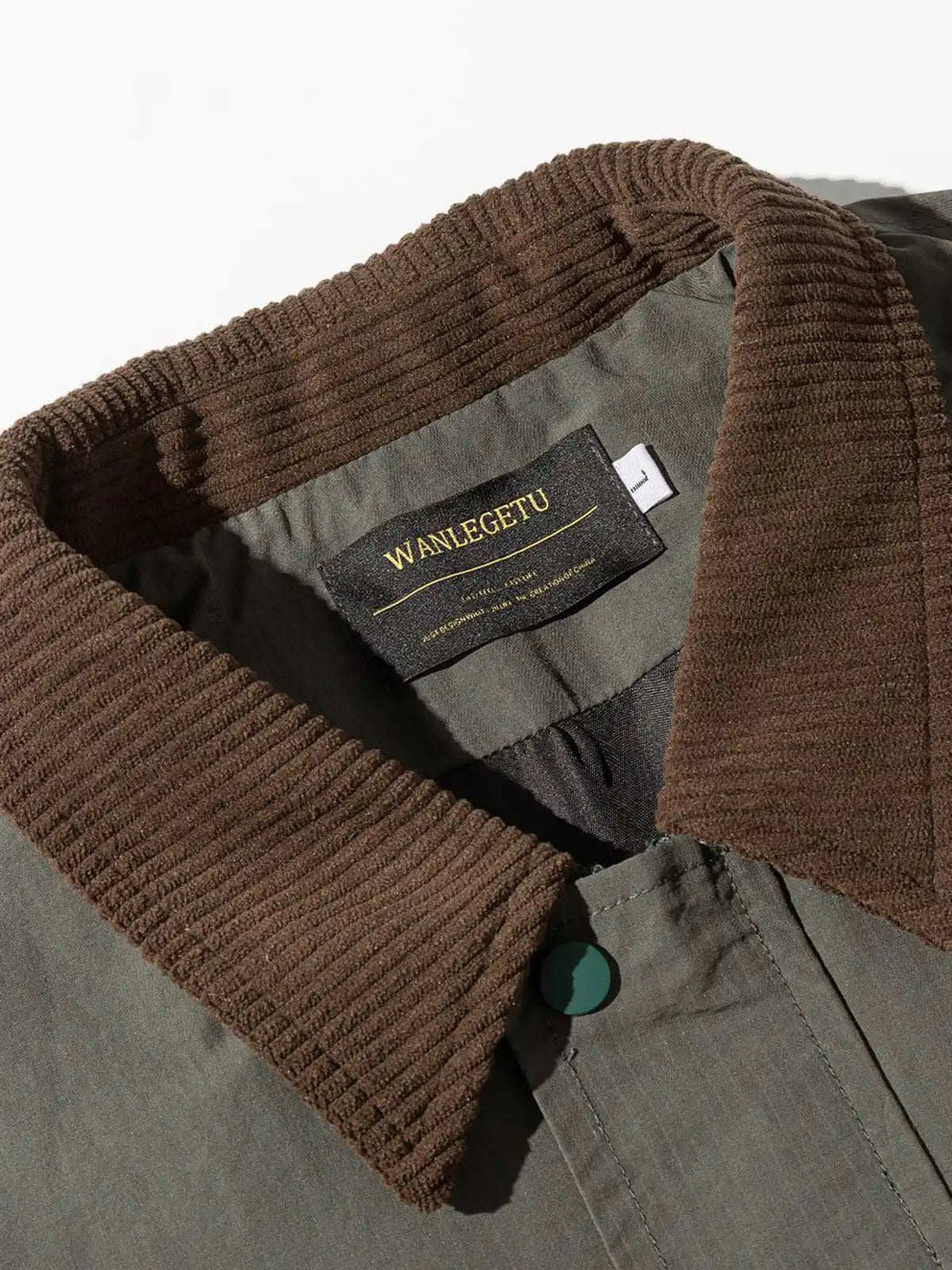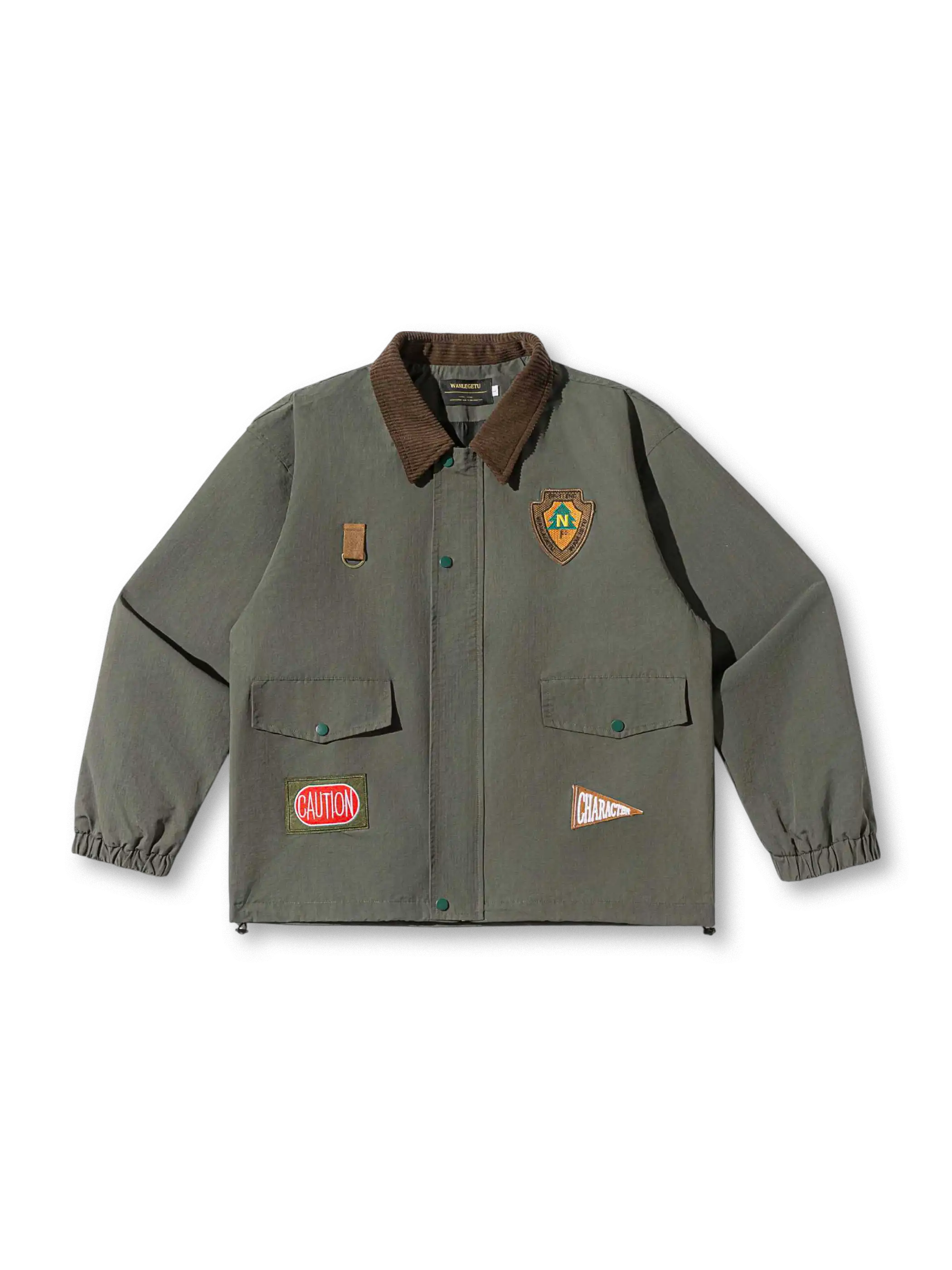 襟部分にコーデュロイをあしらい、複数のワッペンがアクセントになった、ゆったりシルエットのハンティングスタイルジャケット。