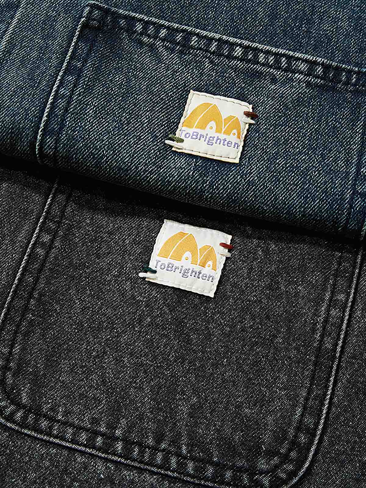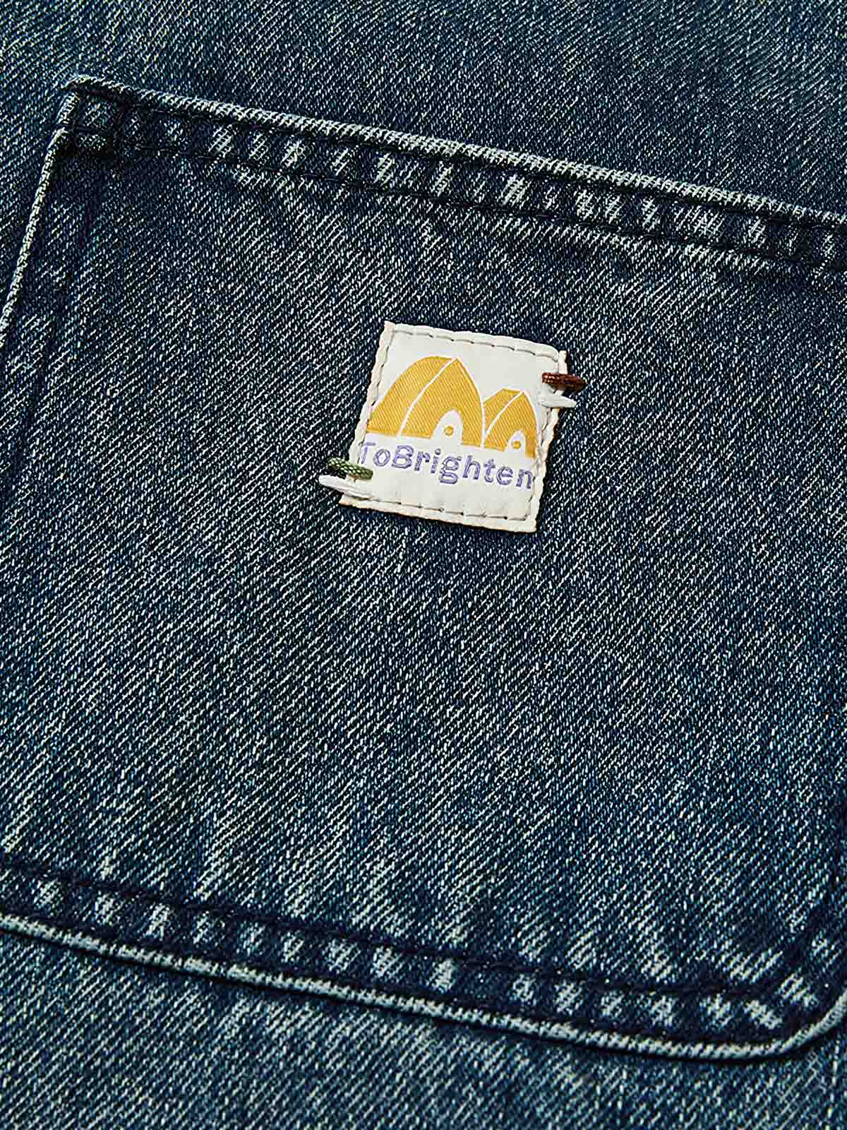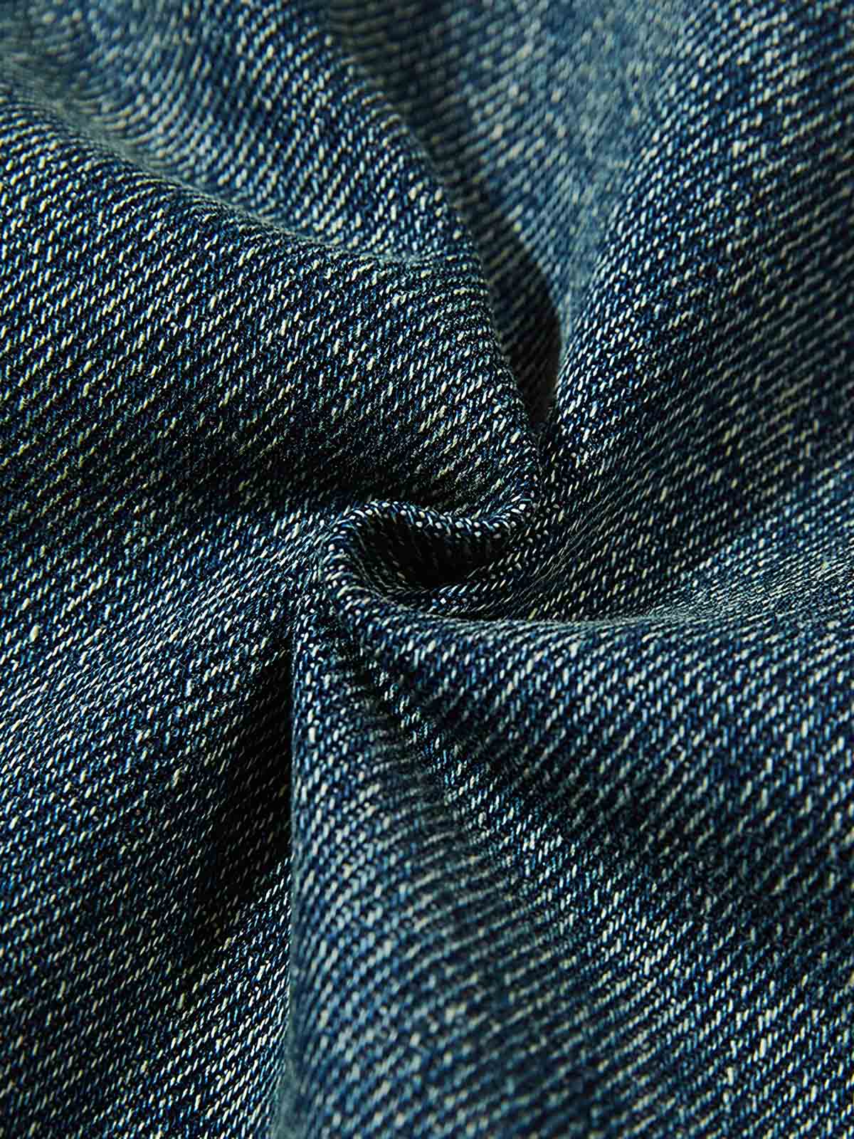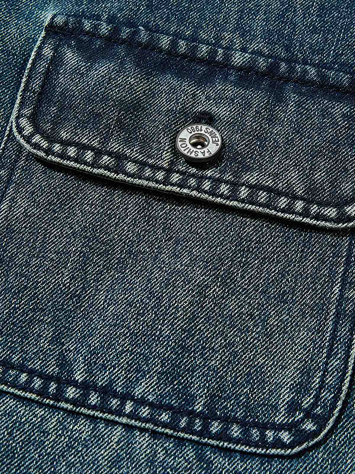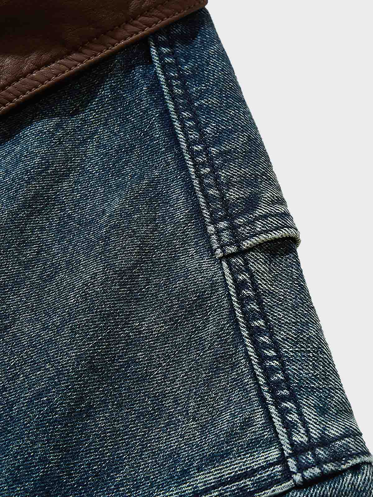 耐久性のあるデニム生地と、肌触りの良いレザーを組み合わせており、見た目の美しさだけでなく実用性も兼ね備えています。フロントボタンと複数のポケットが機能的なアクセントになっています。