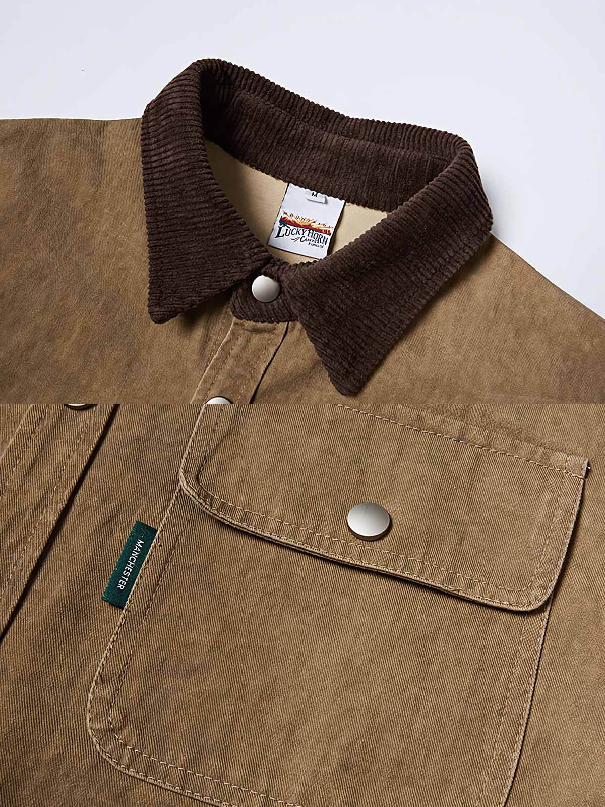 このジャケットの製造工程は、細部にまでこだわっています。伝統的なダブルポケットデザインと精緻な縫製技術は、実用性を高めるとともに、職人精神を表現しています。コーデュロイとデニムの素材の組み合わせは、異なる質感のコントラストを見せるとともに、素材の伝統的な工芸への敬意と革新を体現しています。