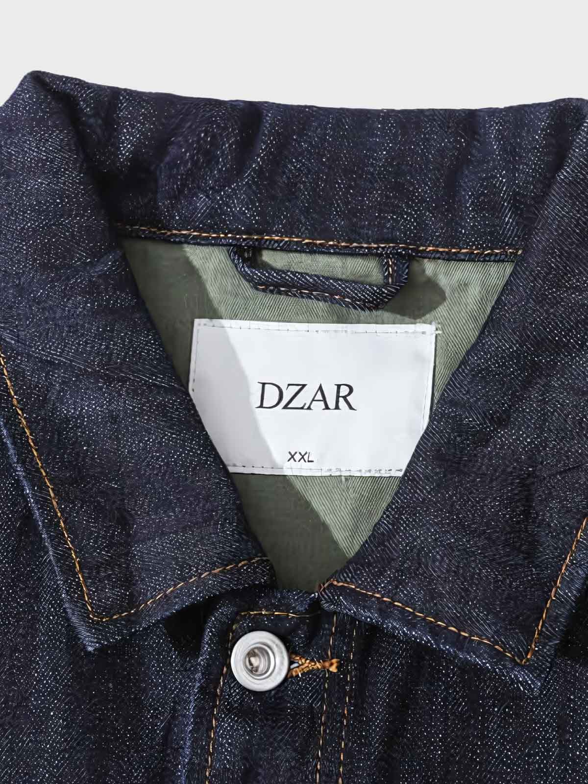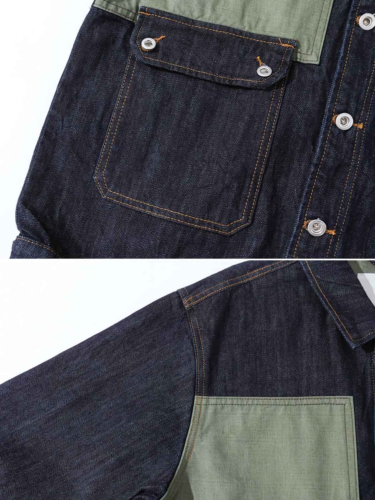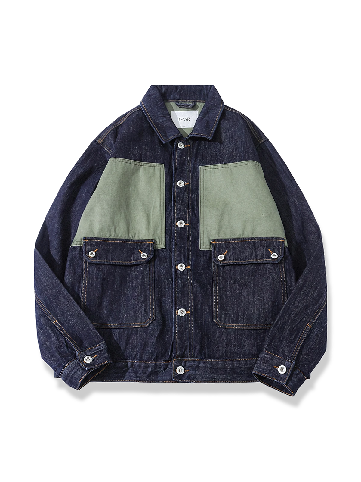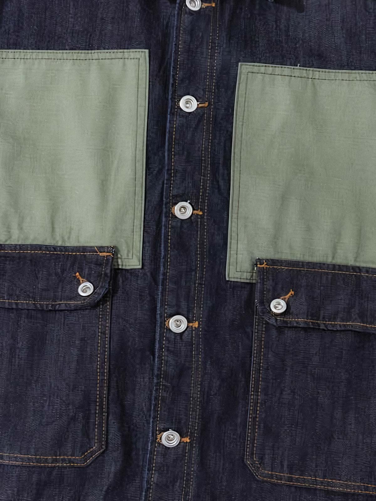 ジャケットのデニム素材は、高品質のコットン生地を使用し、特殊な加工技術により、デニムのクラシックな質感を保ちつつ、柔らかさも兼ね備え、快適な着心地を実現しています。パッチワークされたライトグリーンのポケットは、衣服に色のアクセントを加え、ポケットとボタンのディテールはワークウェアスタイルを強調し、全体の実用性とファッション性を向上させています。