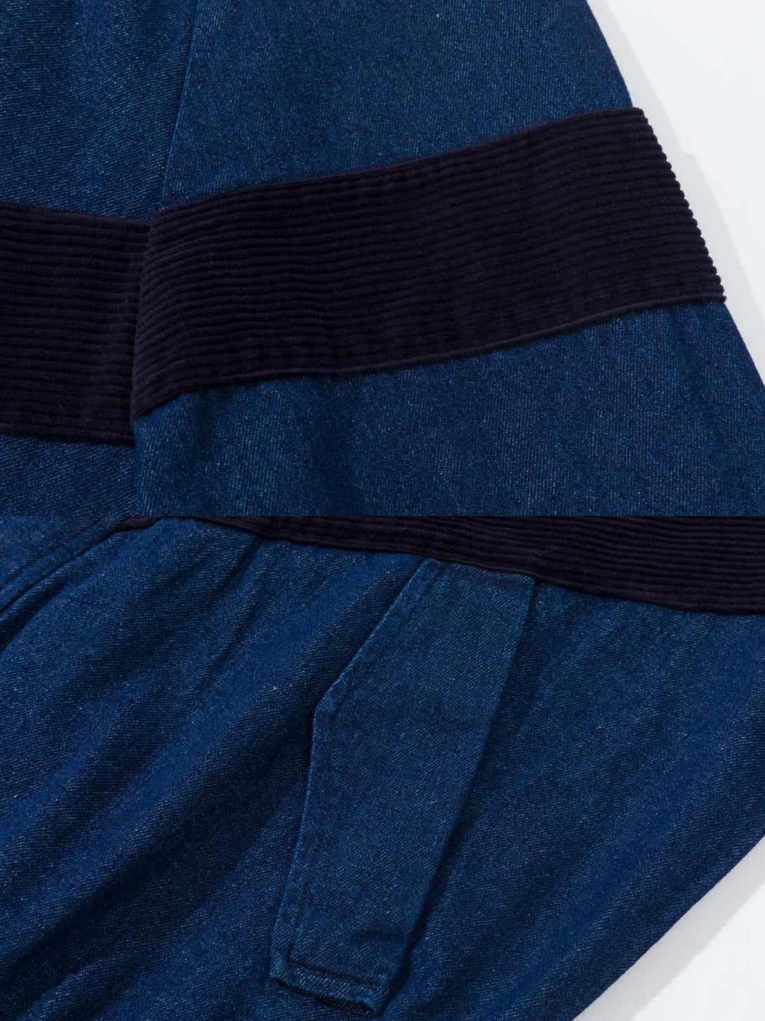 スタンドカラーとコーデュロイパッチワークの組み合わせが、ヴィンテージワークスタイルとカジュアルな印象を兼ね備えたデザインを実現。