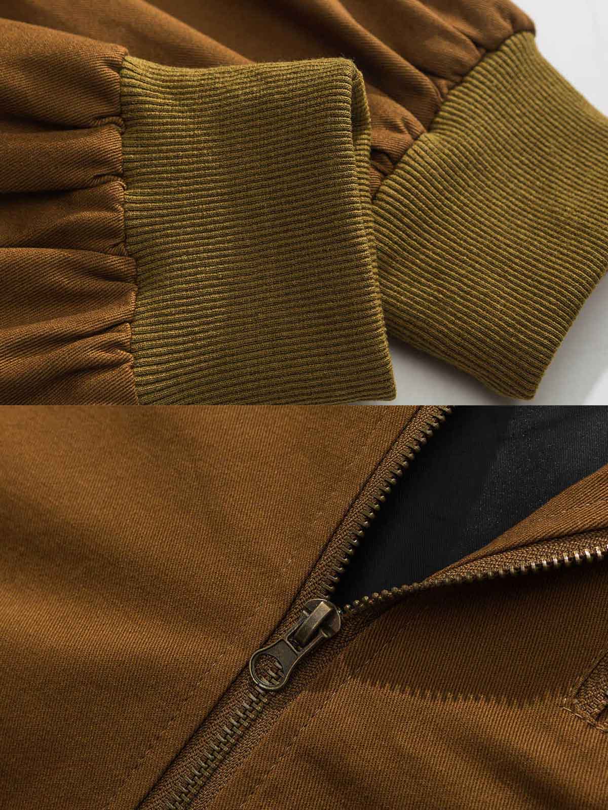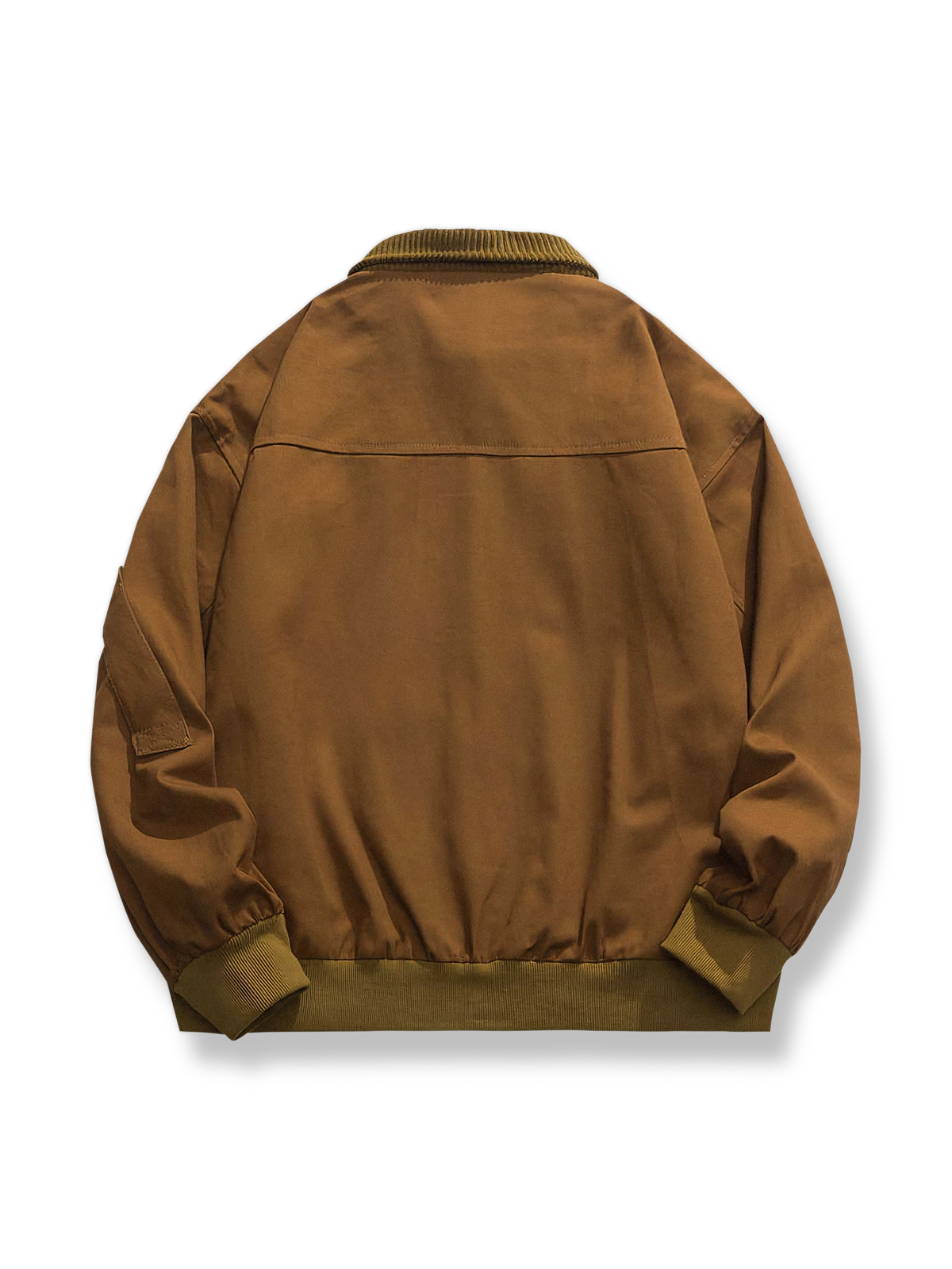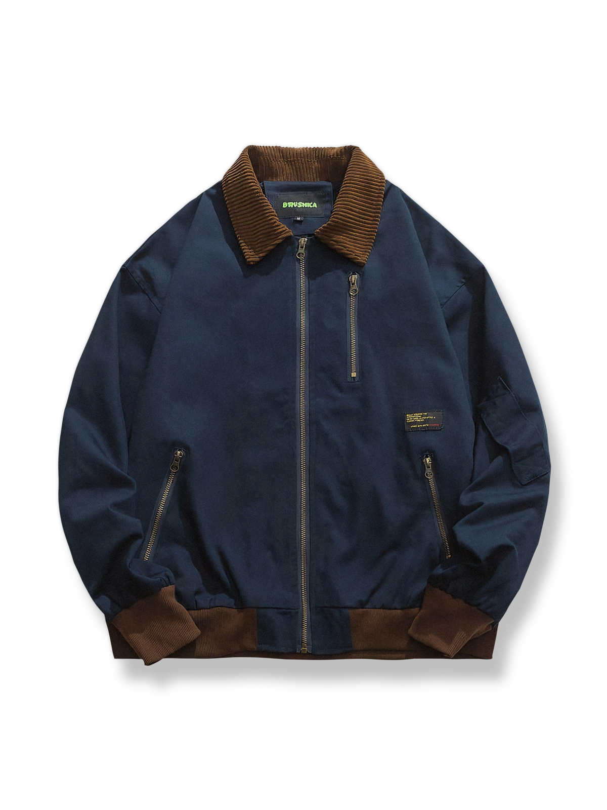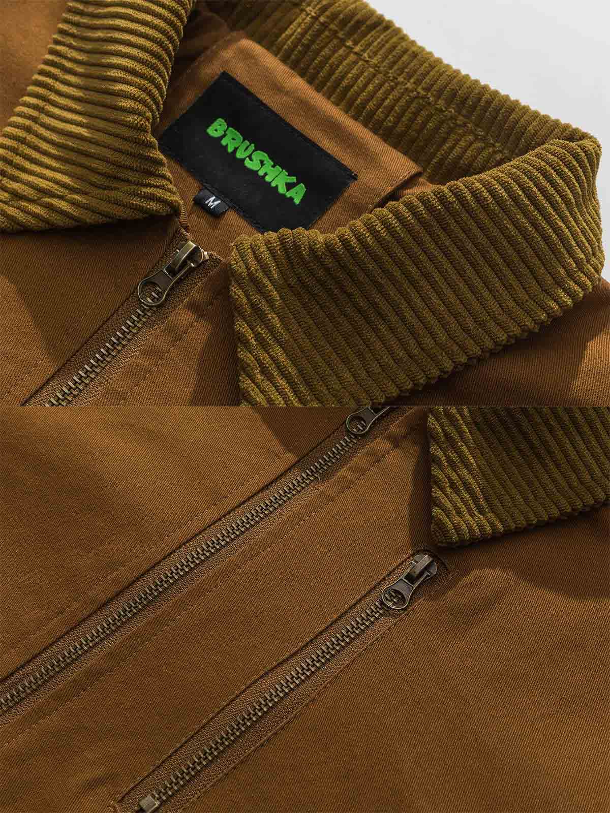 ジャケットは、異なる色合いのコーデュロイ素材で構成された翻领が特徴で、豊かなテクスチャと暖かみをプラスしています。フロントのジップクロージャーや、プラクティカルなフロントポケットが機能性を高めています。