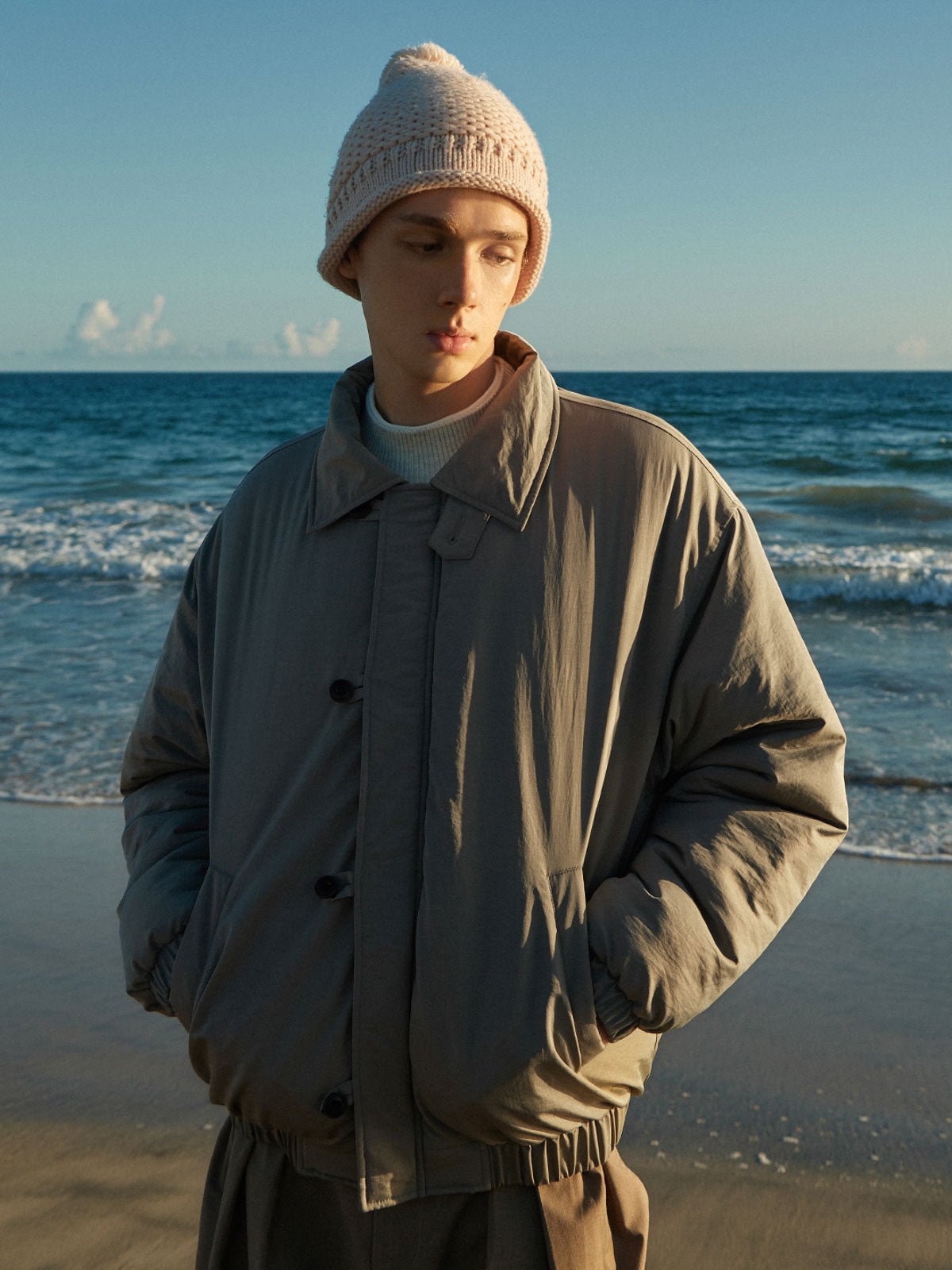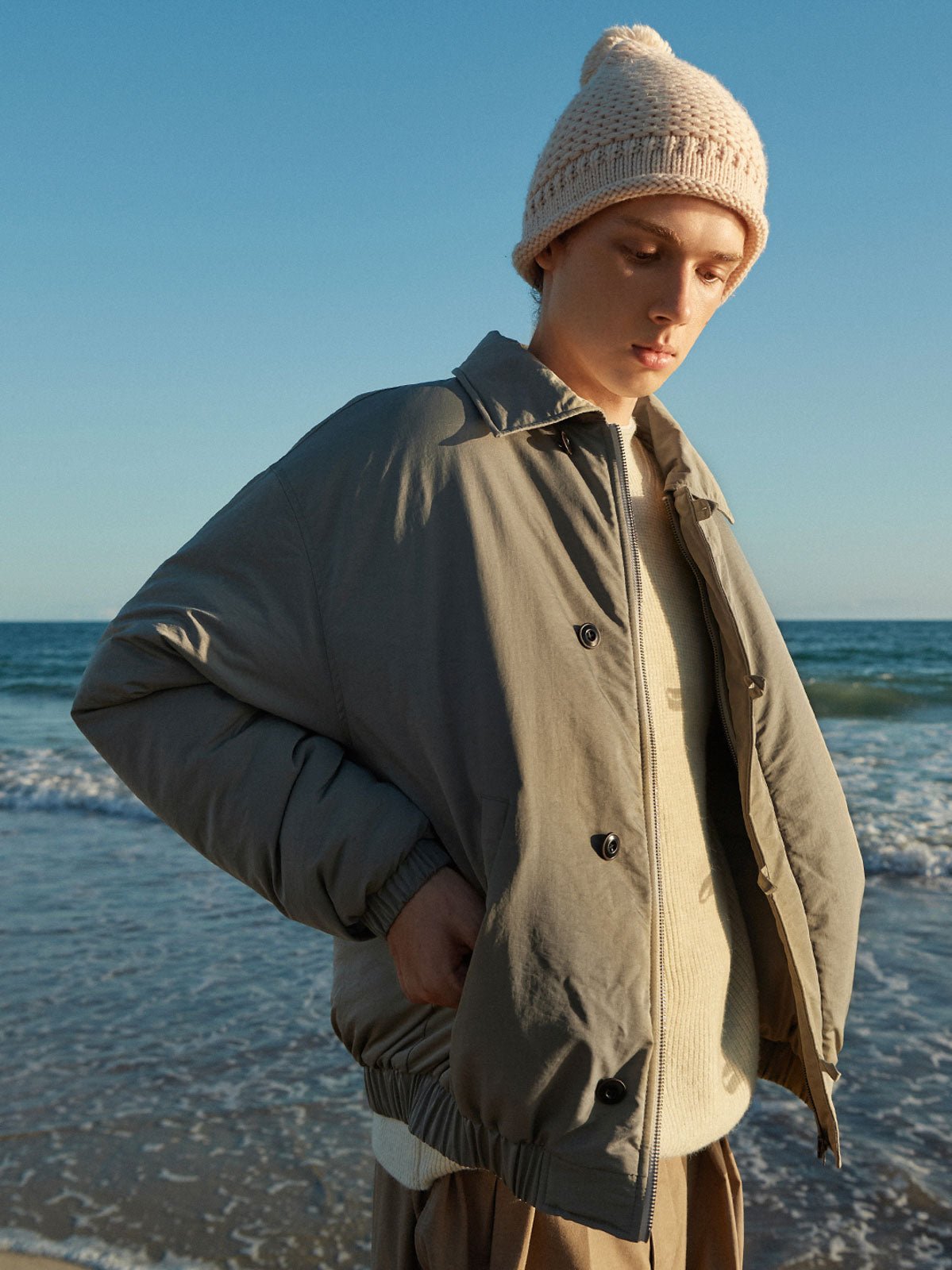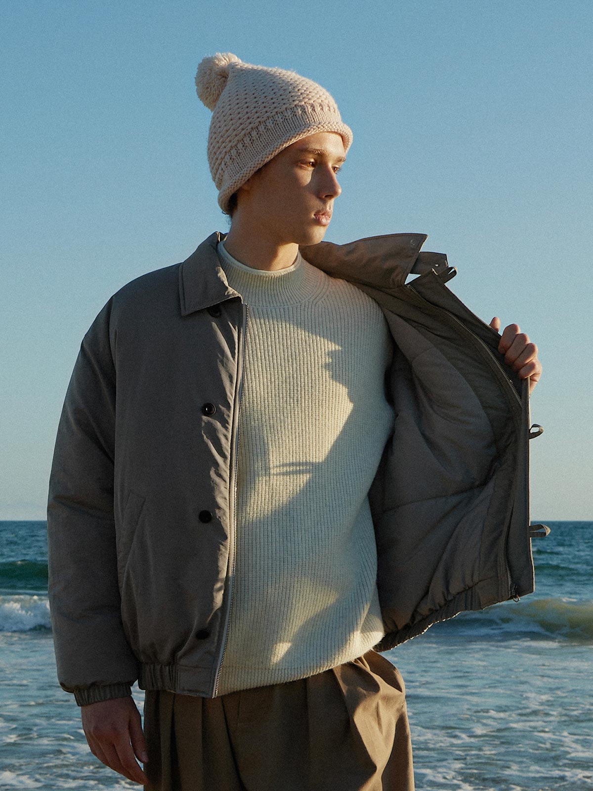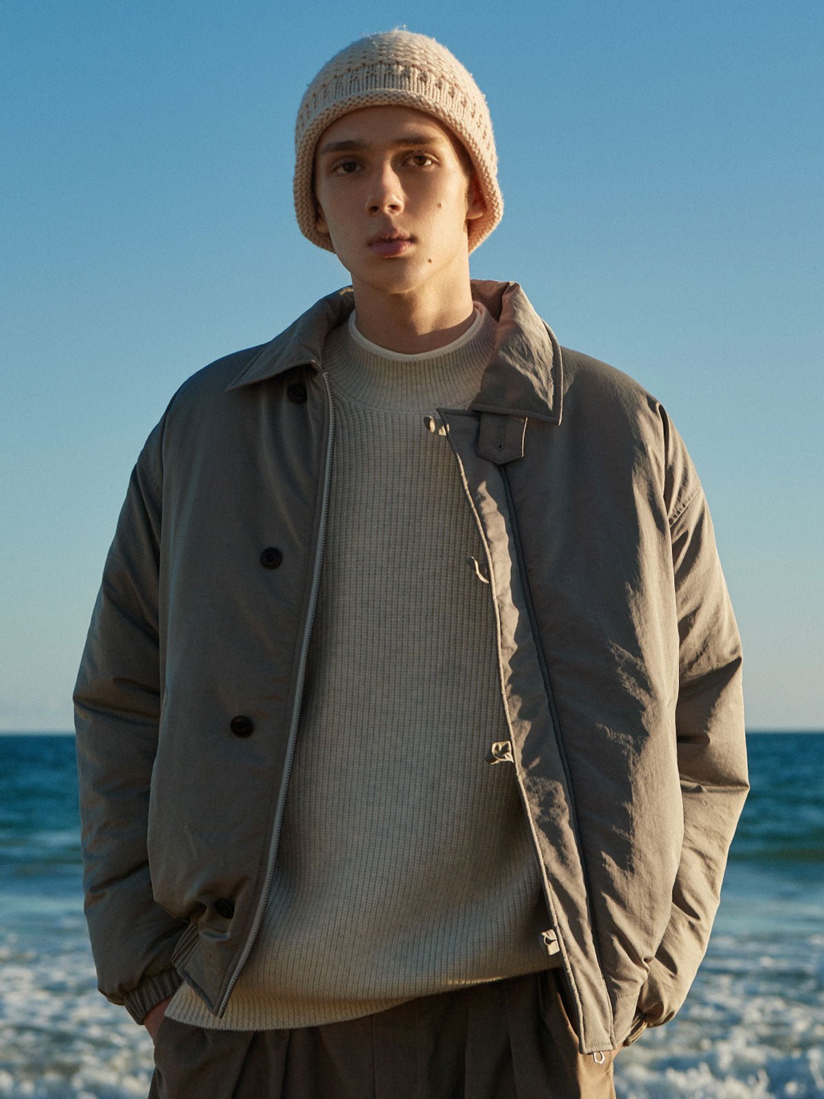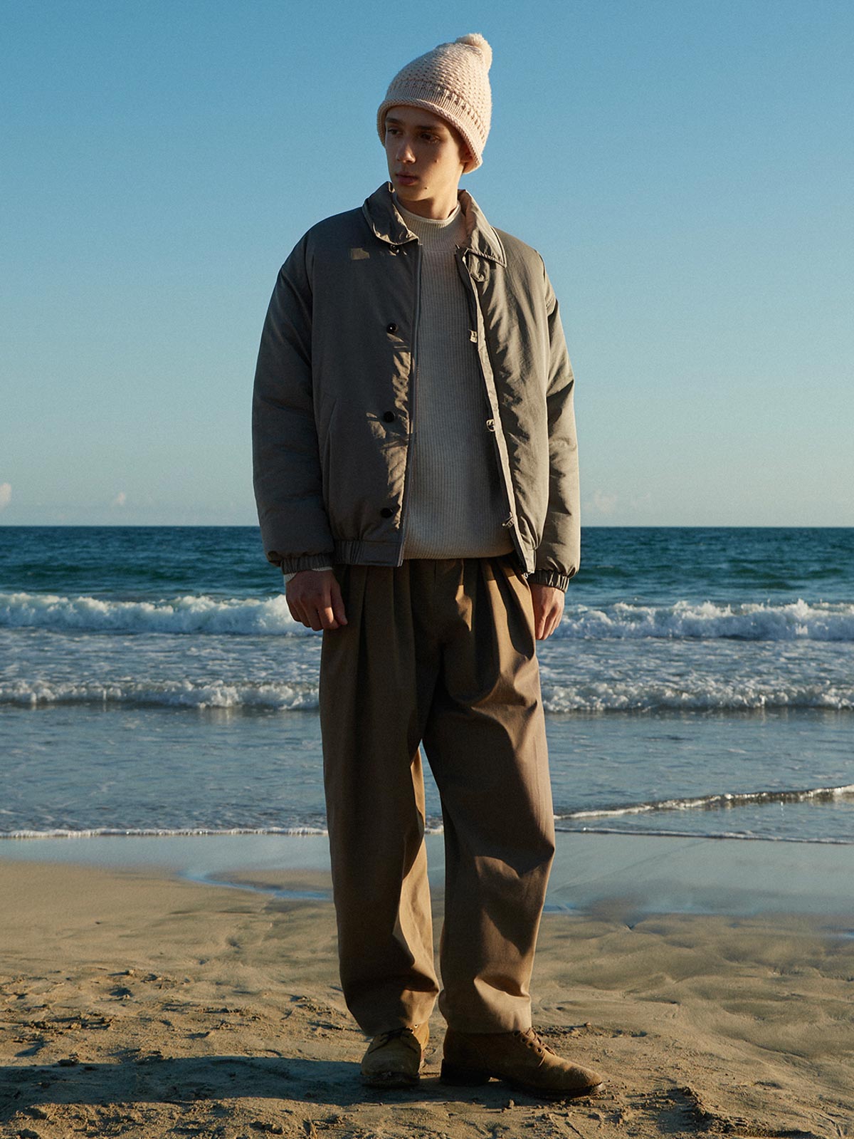 このジャケットは、フレンチワークウェアのデザインと保温性を兼ね備えたアウターウェアを組み合わせています。シンプルでありながらエレガントなスタイルを体現しています。
