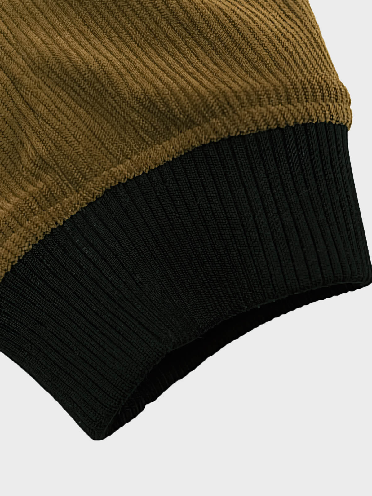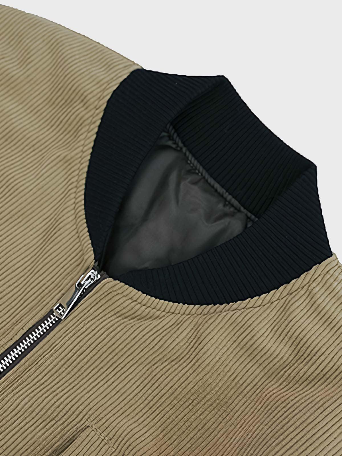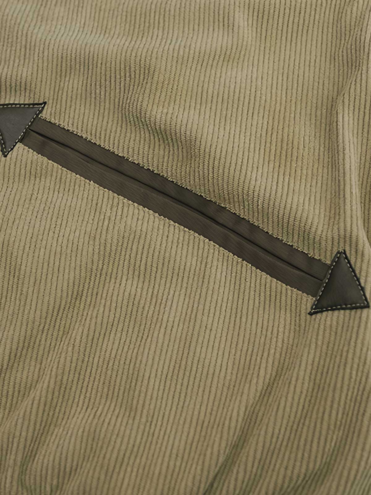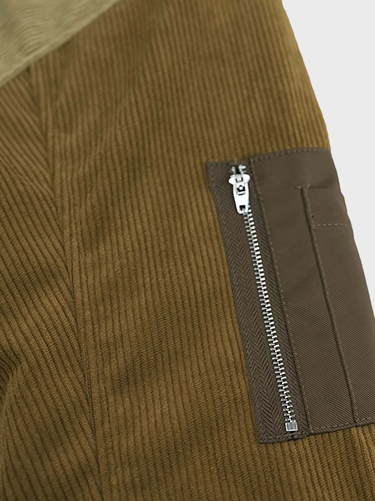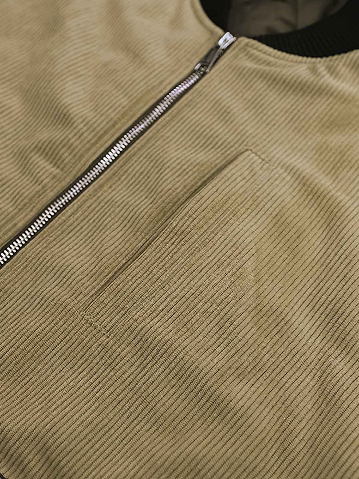 ジャケットのコーデュロイ素材は、繊細な質感と視覚的な深みを与えています。メラードカラーの対比デザインは視覚的な興味を加え、ジッパーポケットや肩の装飾ストラップなどのディテールは、実用性を向上させつつ、レトロなスタイルを強調しています。