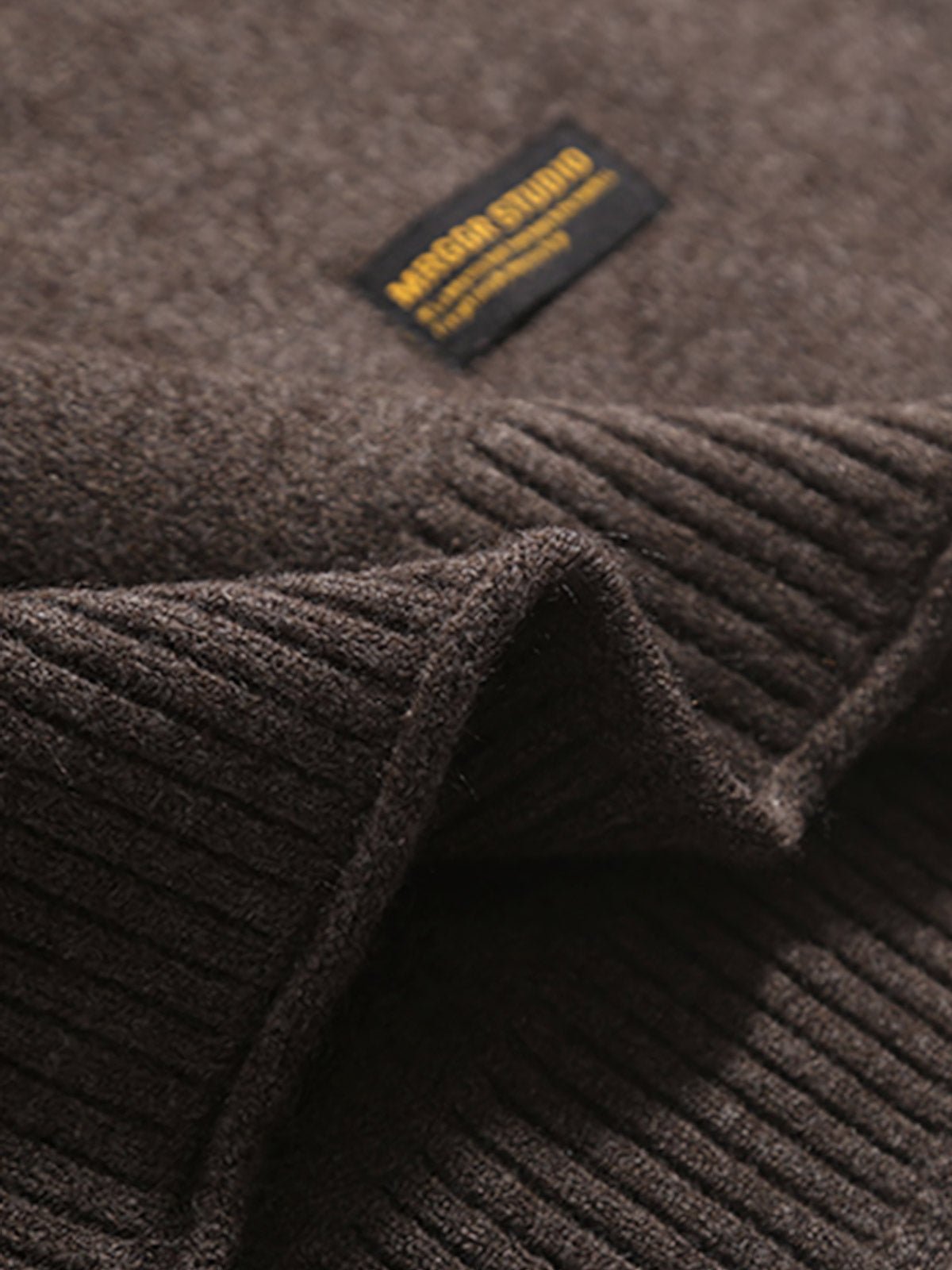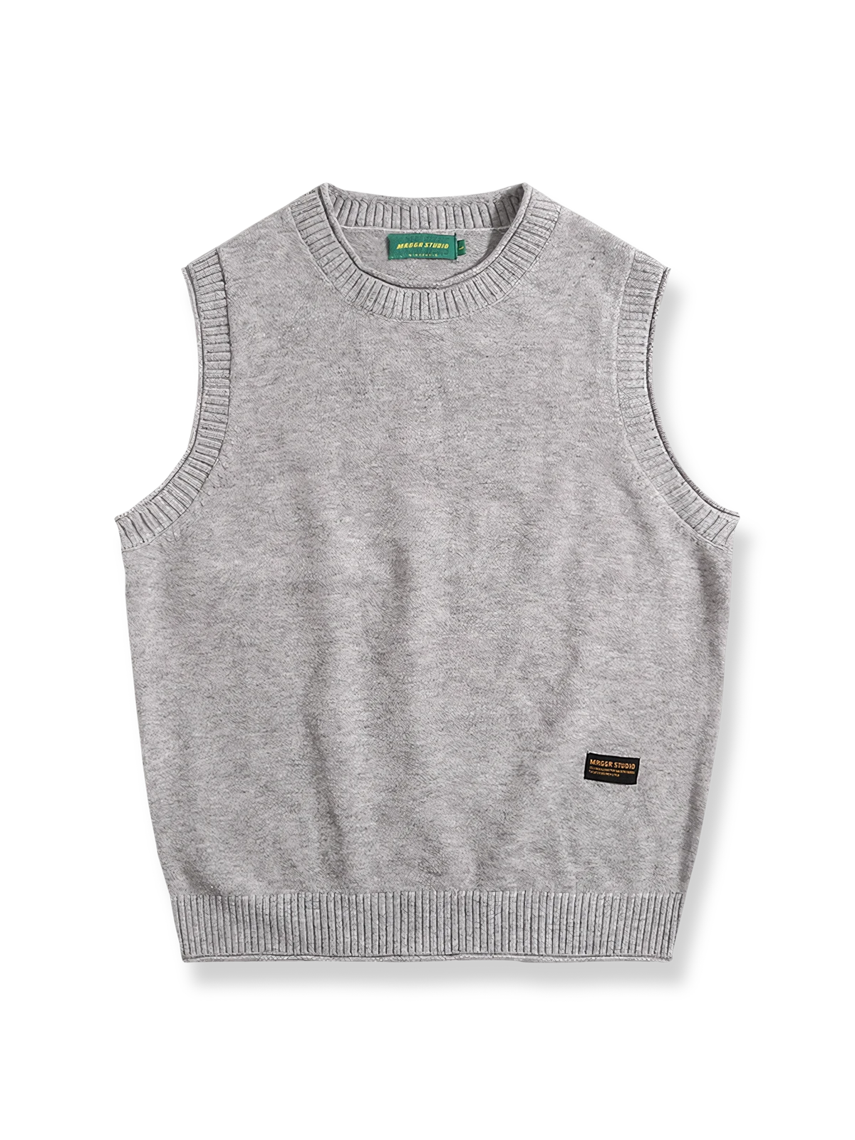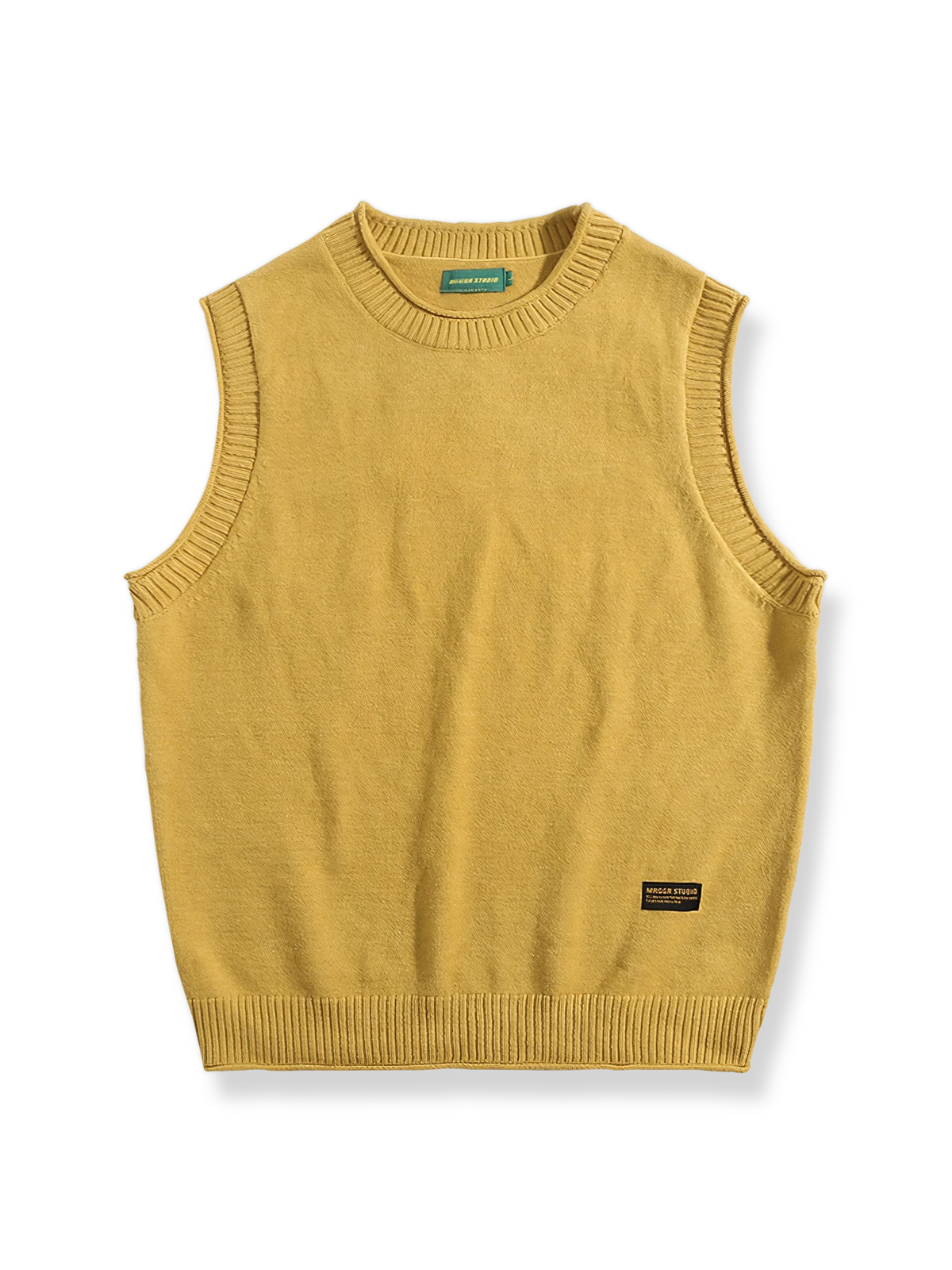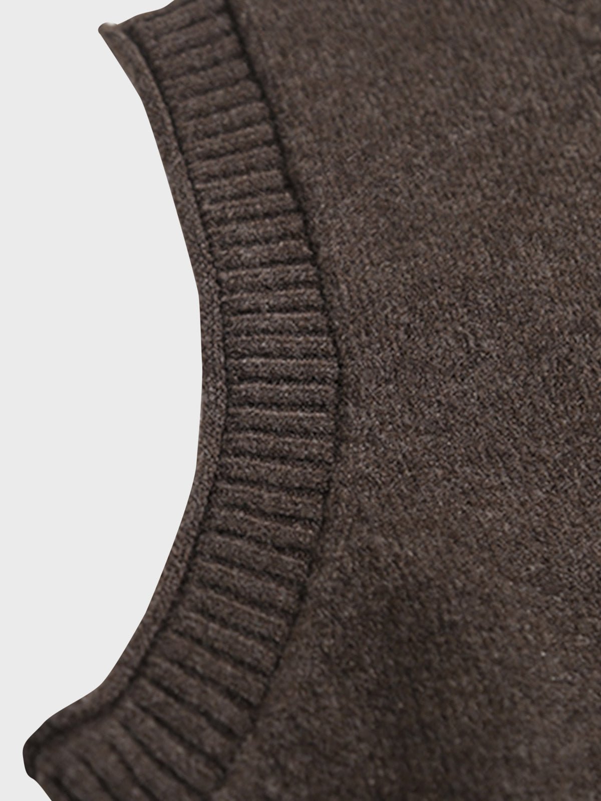このニットベストは、伝統的なリブ編みの裾を採用し、クラシックなメンズウェアの落ち着きと細部への注意を反映しています。歴史的に、このデザインはフォーマルウェアとカジュアルウェアの中間に位置する過渡的な服装で、追加の暖かさを提供しながら全体の洗練さを損なわない特徴があります。