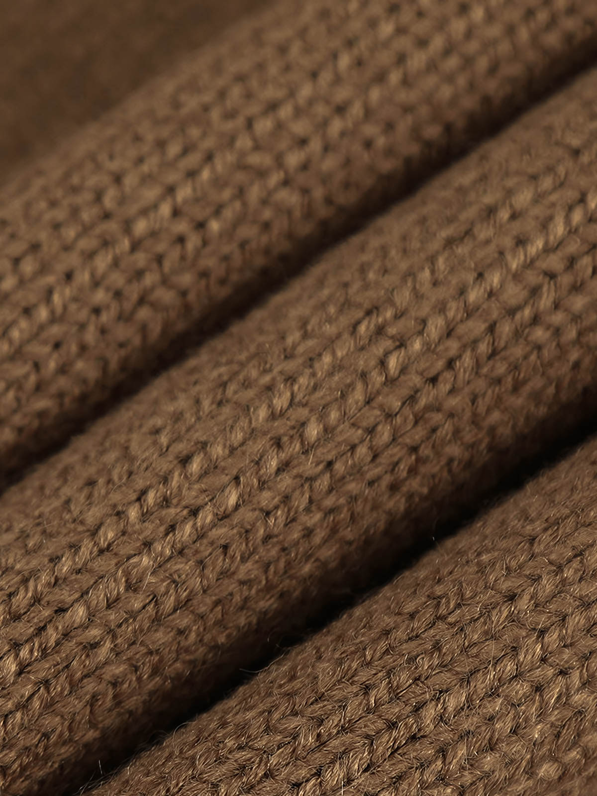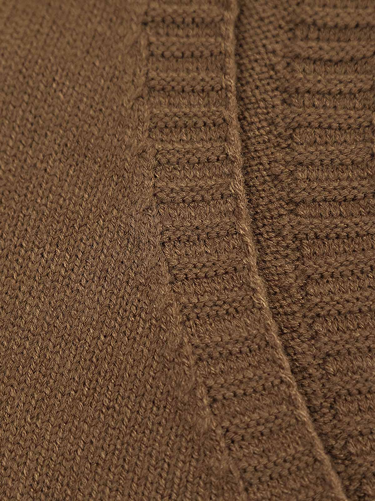 ベストの素材と編み方は、保温性と快適さを提供しながら、軽やかさも保っています。細かいリブ編みの裾とネックラインは、装飾効果を加えるだけでなく、衣服の形を保つのにも役立ち、耐久性を高めています。