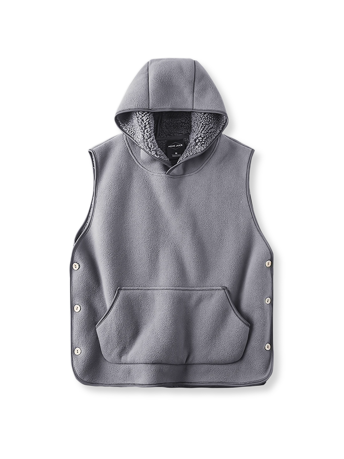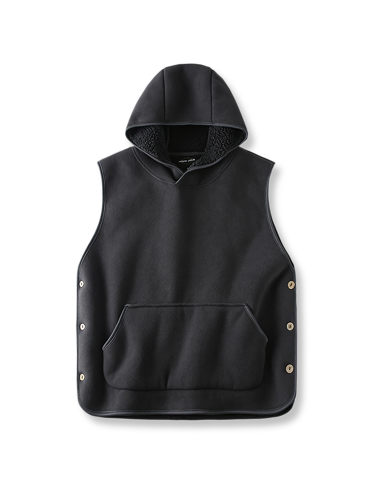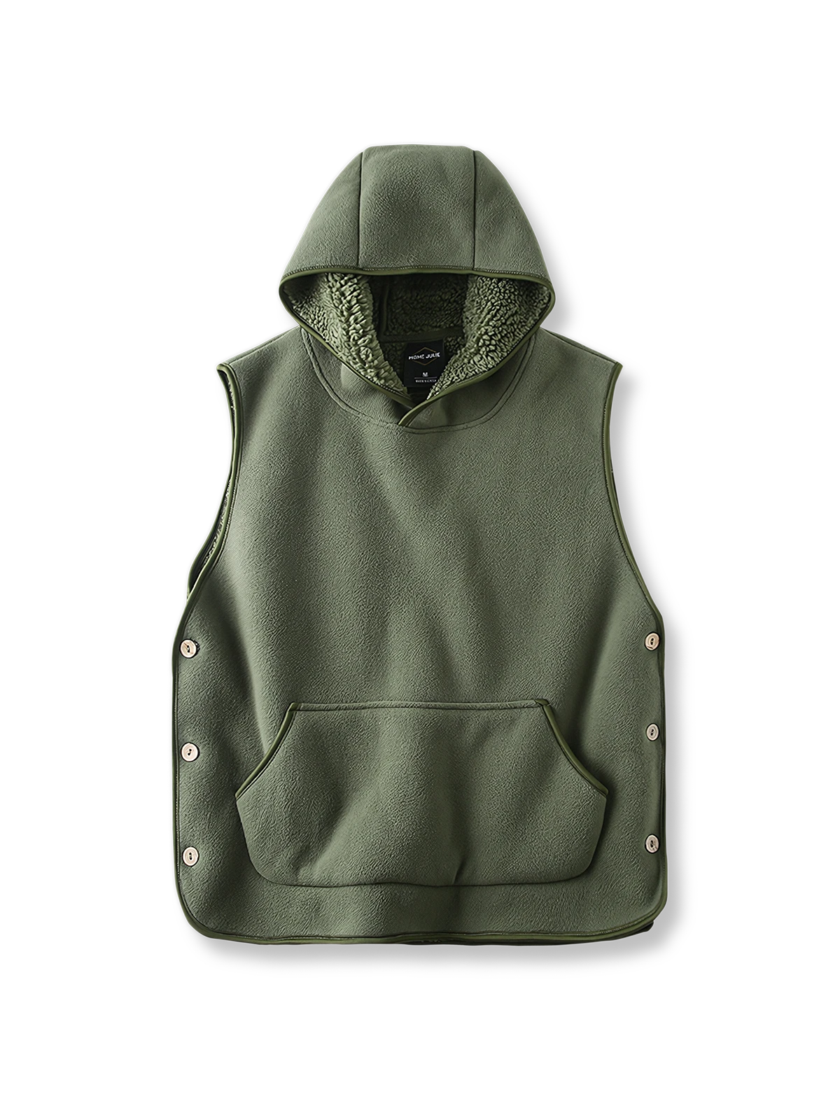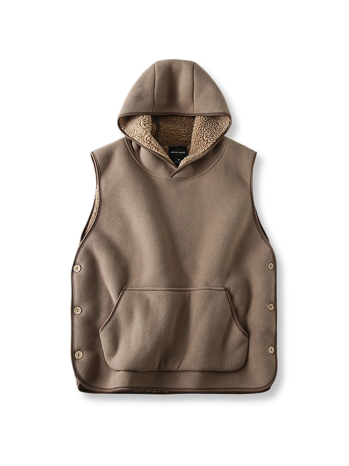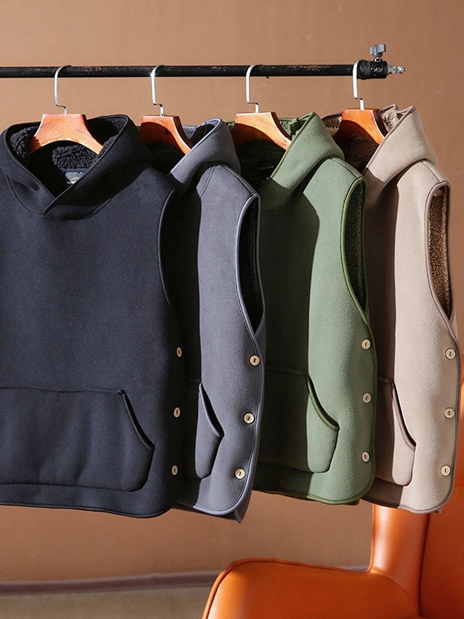 リラックス感あふれるフード付きのベストは、冬の重ね着に最適です。非常におしゃれなファッションアイテムです。