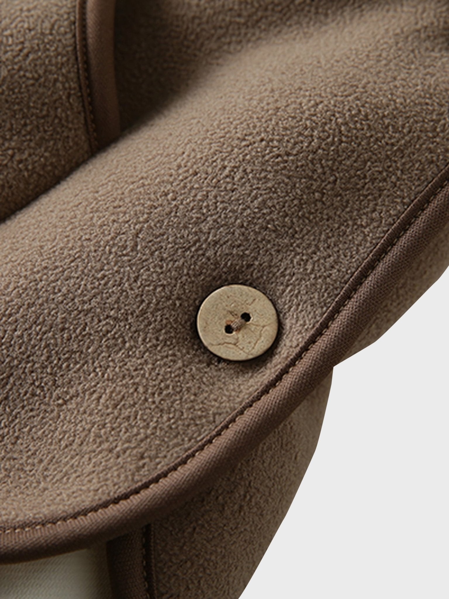 カンガルーポケットは見た目にも実用的で、両側にスリットが入り、木製のボタンが3つあり、デザイン性があります。帽子のつば、ポケットの口、裾にはすべて縁取りが施されています。