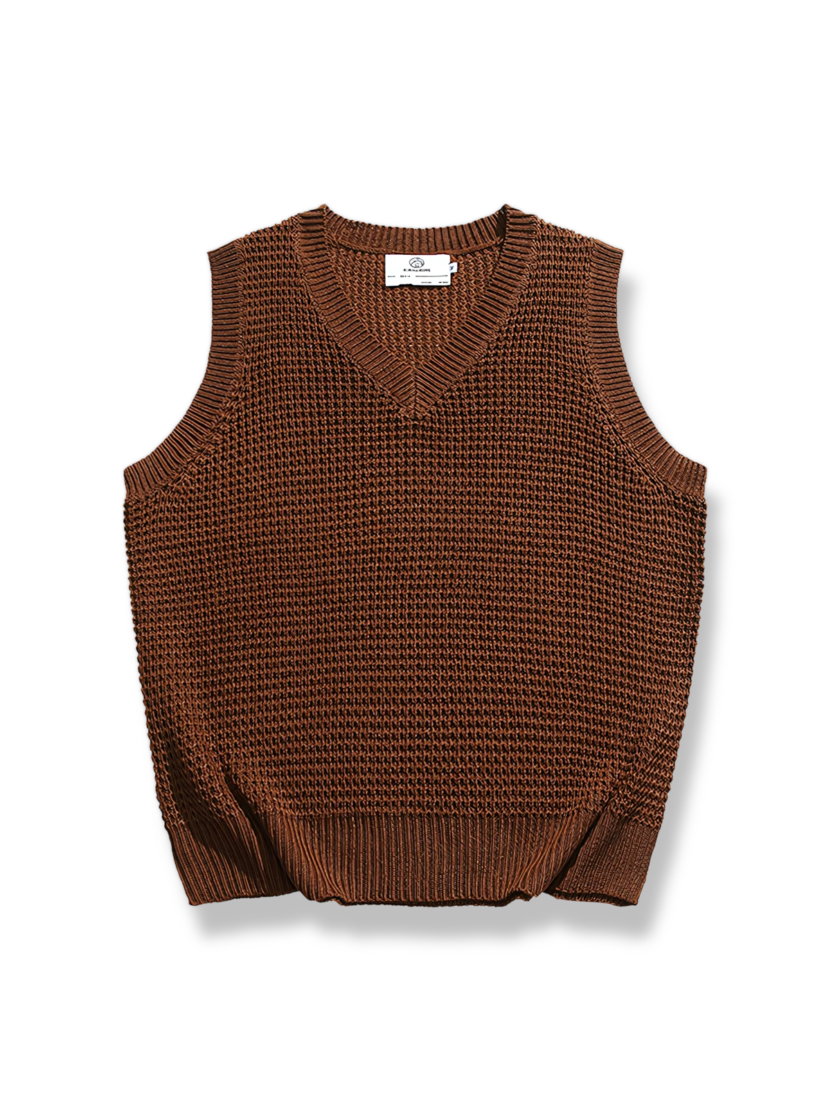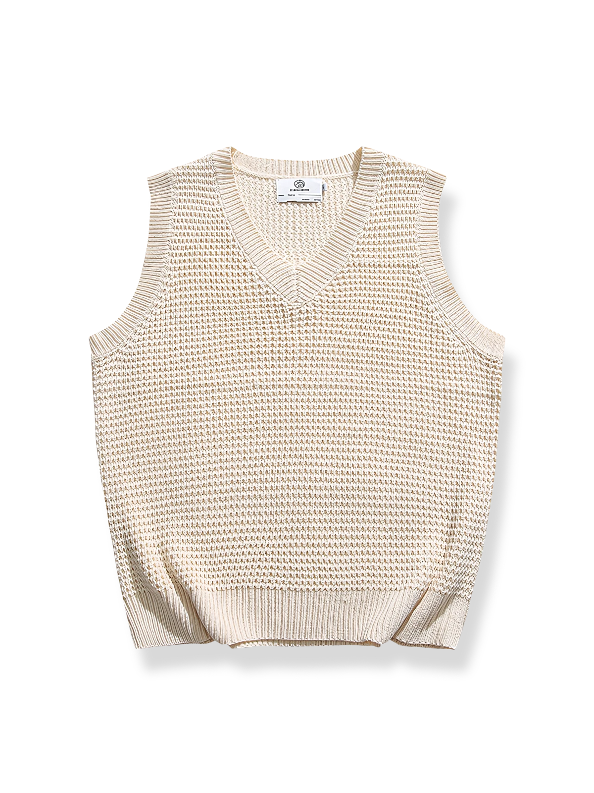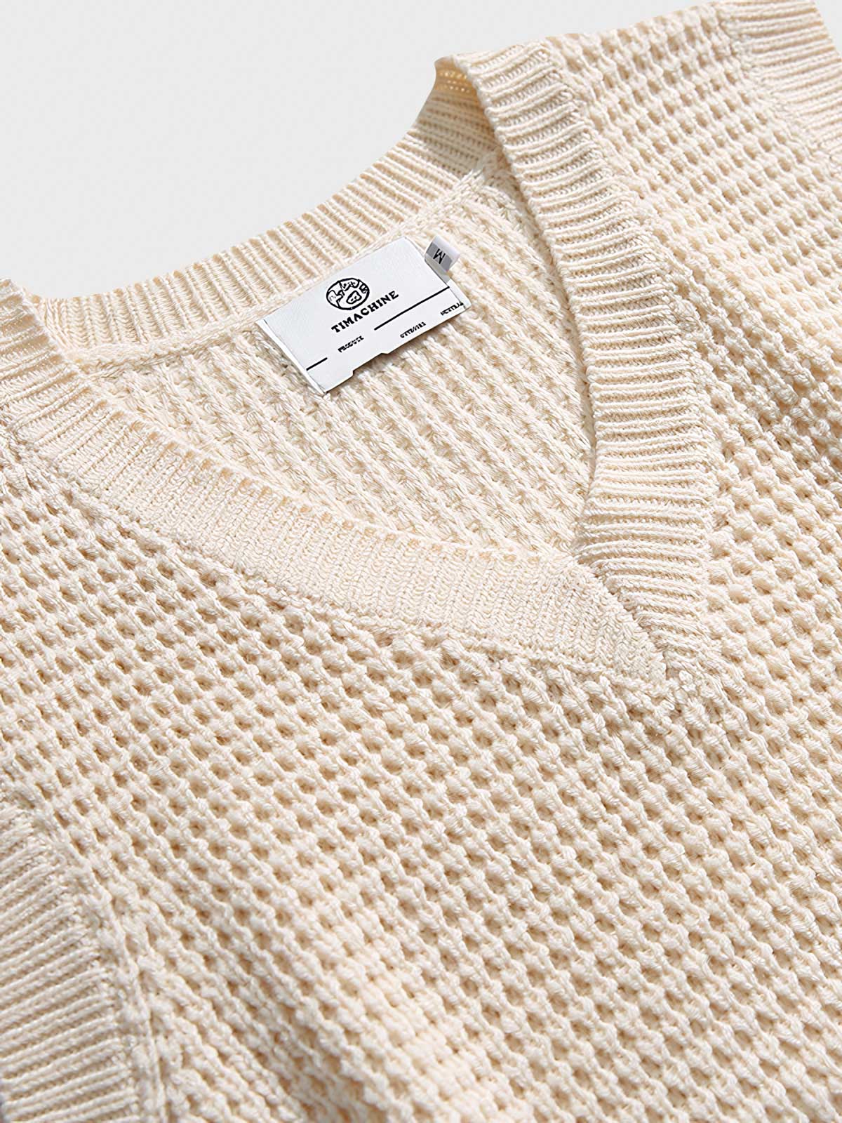 このベストのワッフル編みは、細部の豊かさを加えるとともに、レトロなタッチと視覚的効果をもたらします。ベストの裾と襟元の繊細な仕上げは、品質とディテールへのこだわりを強調しています。