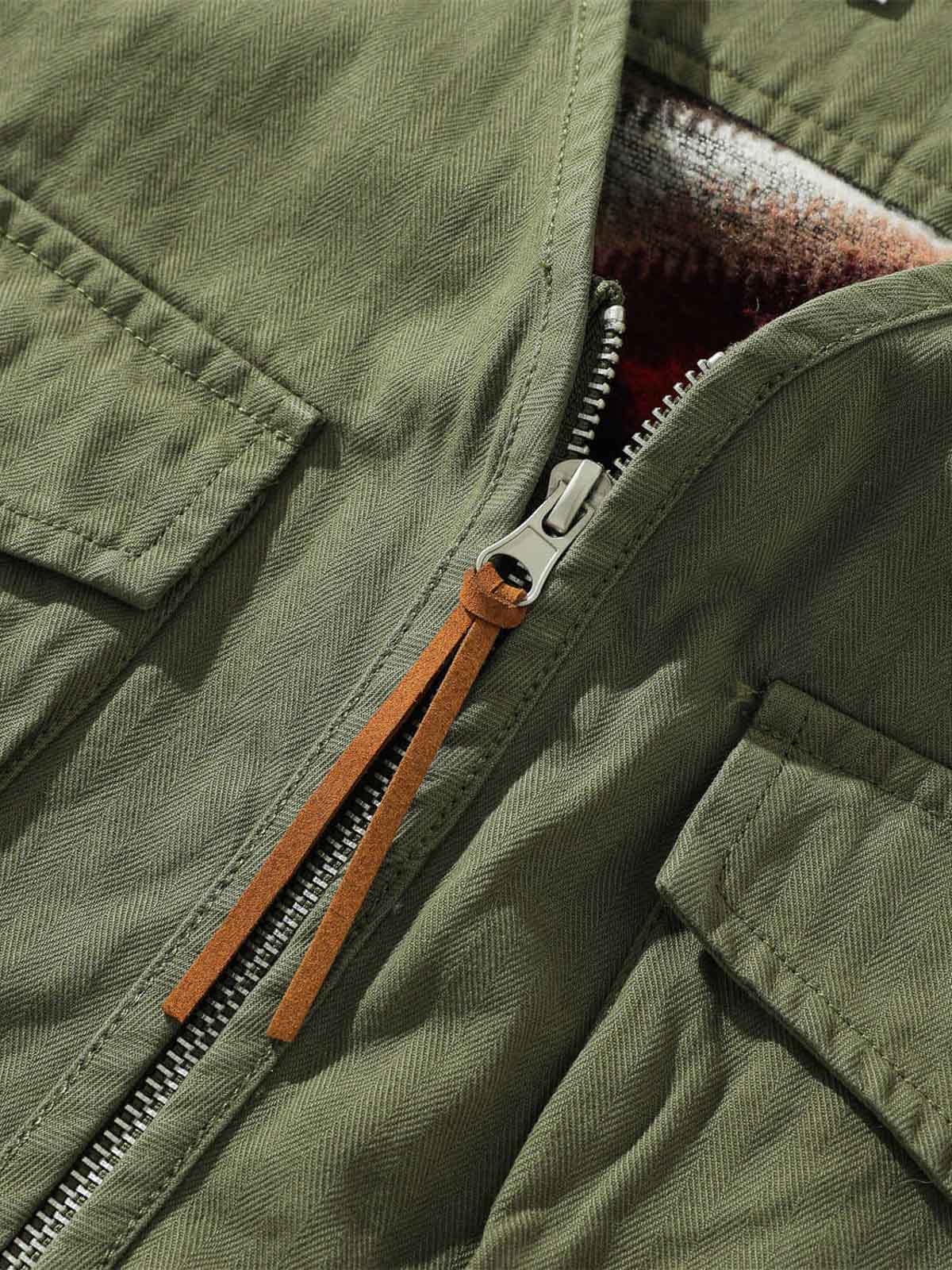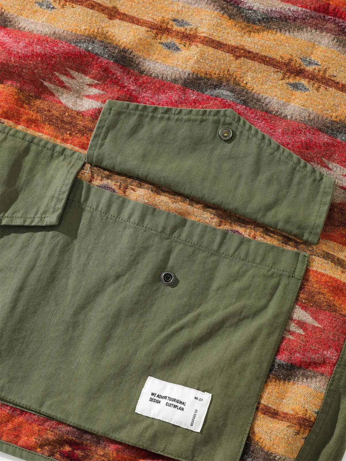 耐久性に優れたワークウェア素材を使用し、カラフルな民族風のパターンとの切り替えで、ユニークな視覚効果を創り出しています。ポケットのディテールは、服の実用性を高め、小物を携帯するのに便利です。