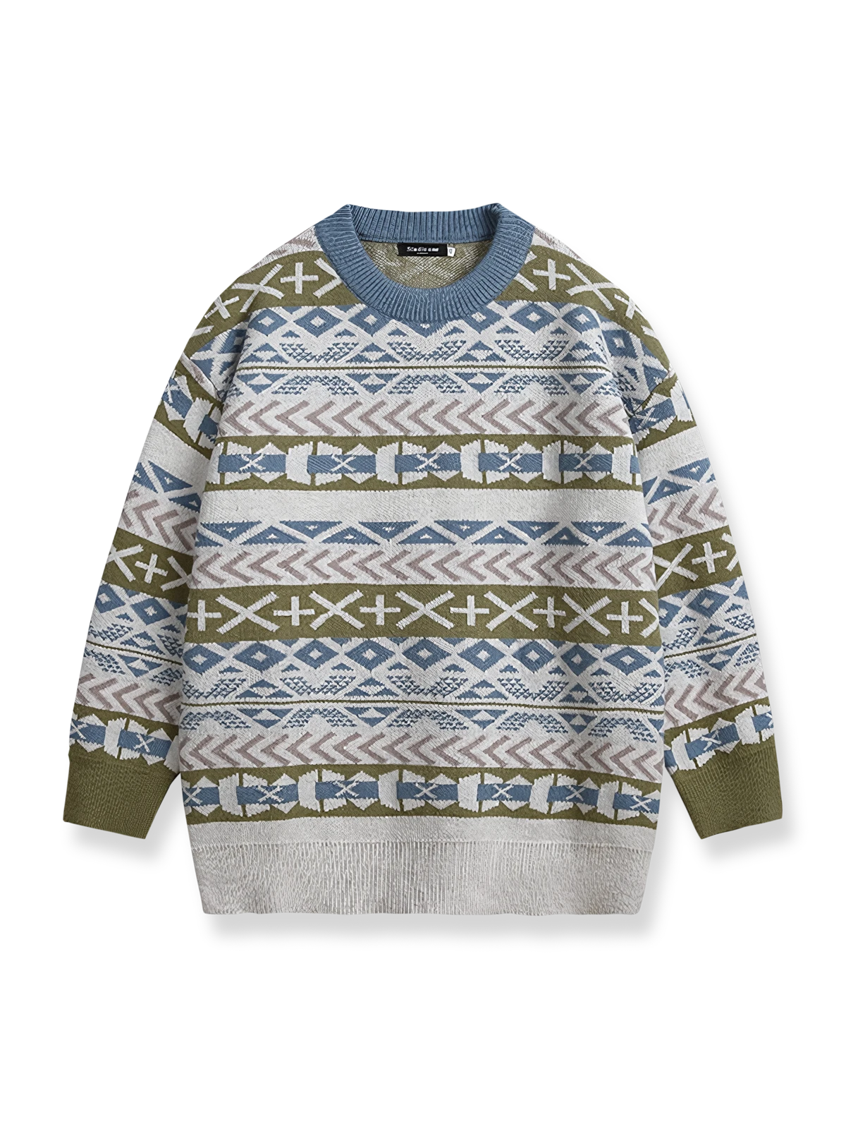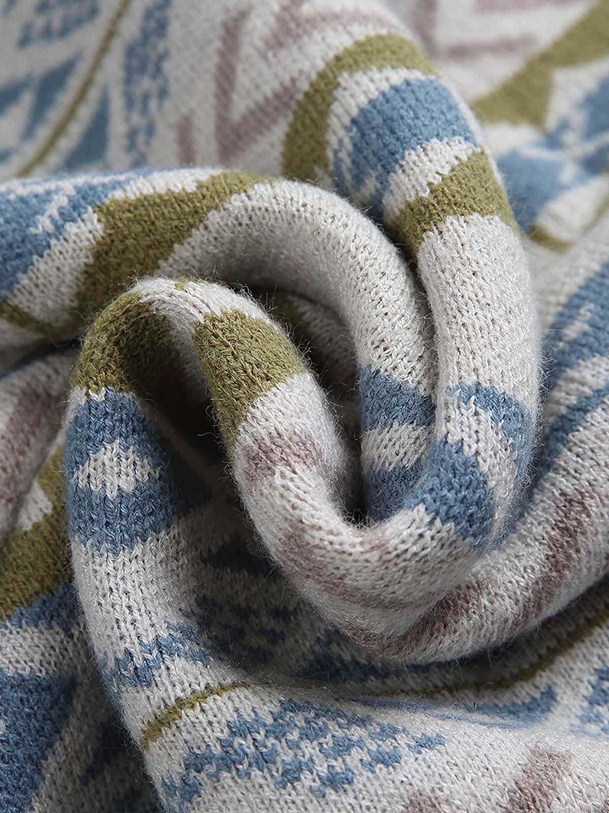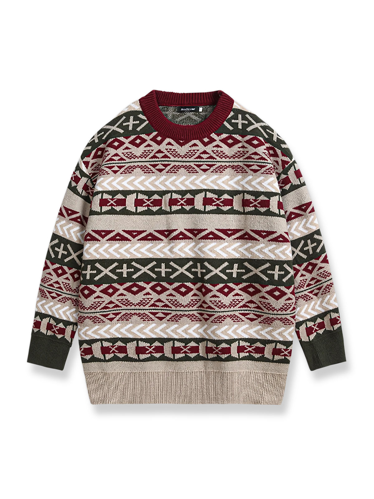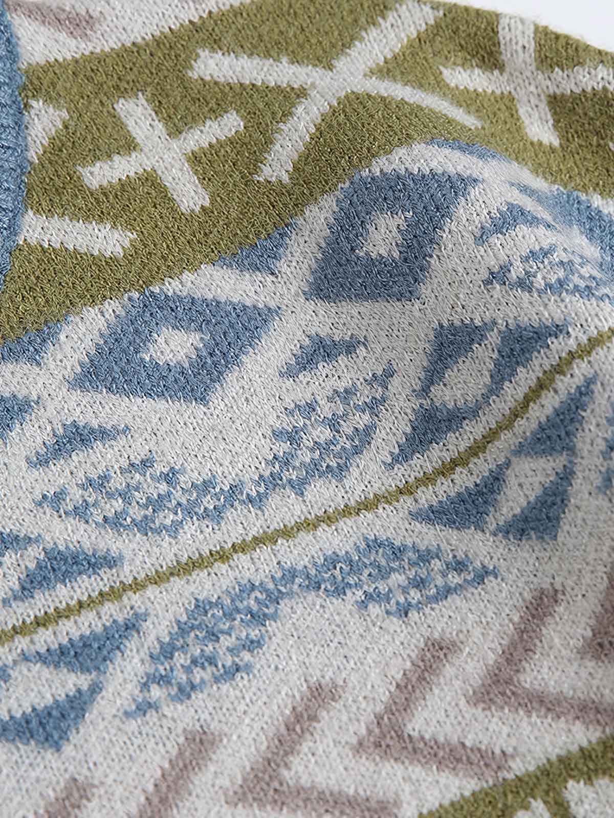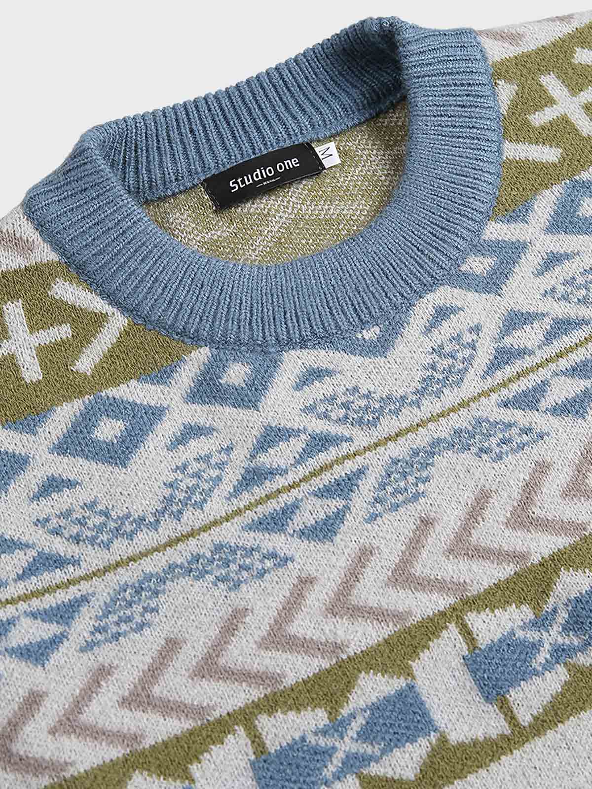 このニットセーターは、鮮やかな民族風スタイルを持ち、伝統的なジャカード技術を使用して複雑な模様と色彩を形成しています。このデザインは、民族伝統の衣装に由来しており、幾何学模様とパターンを使用しています。
