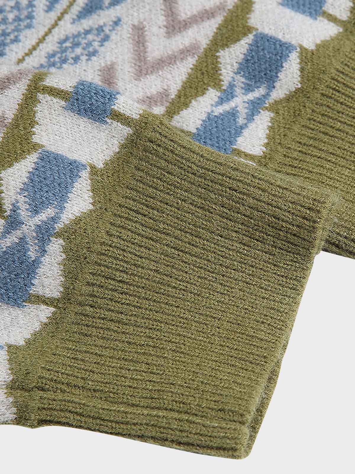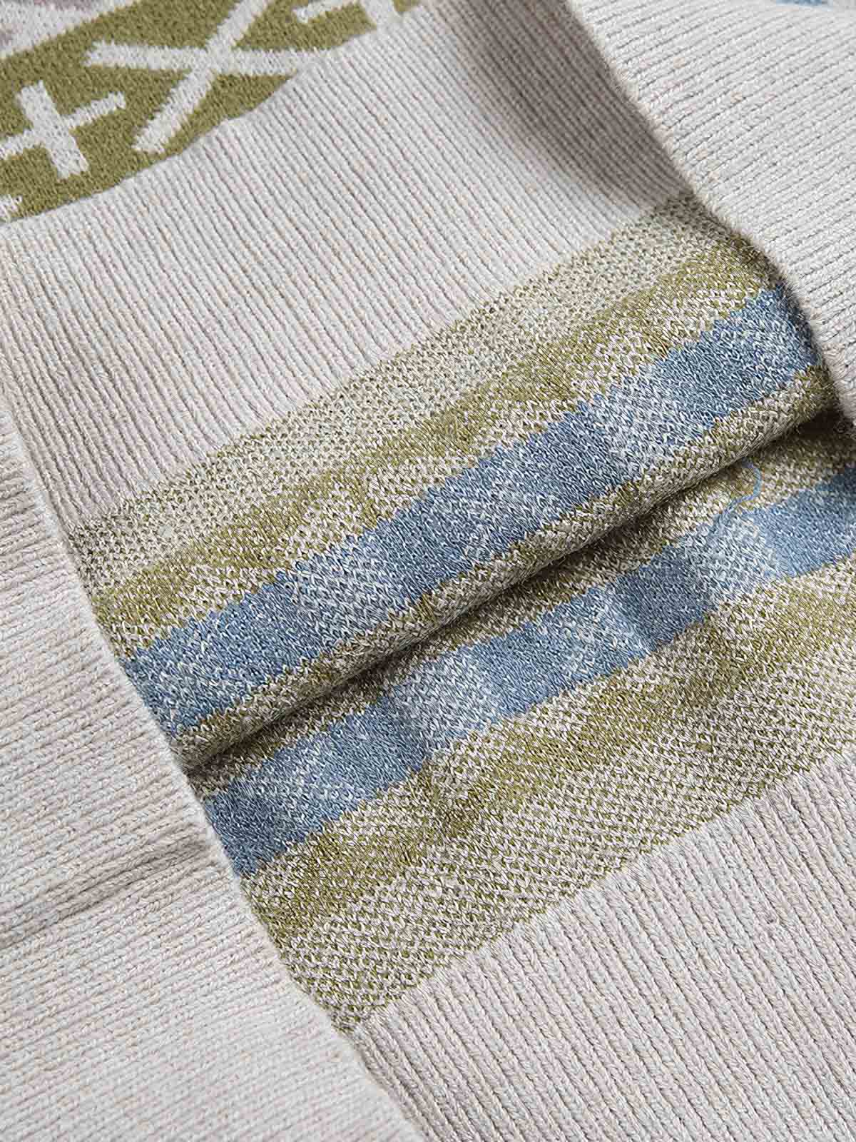 このパターン豊かなニットは、シンプルなボトムス、との組み合わせがおすすめで、全体の視覚的なバランスを取ります。靴選びでは、シンプルなカジュアルシューズや白いスニーカーが良い選択です。また、ニットのパターンは帽子やスカーフなどのアクセサリーの色や模様と調和させることで、統一感のある全体のスタイルを作り出すことができます。