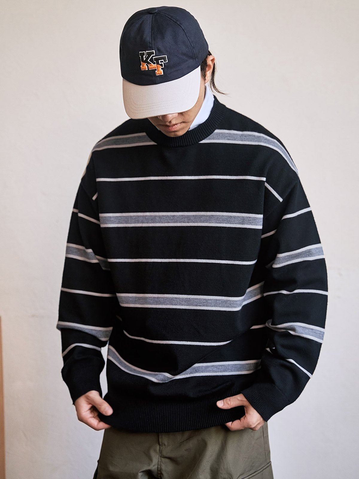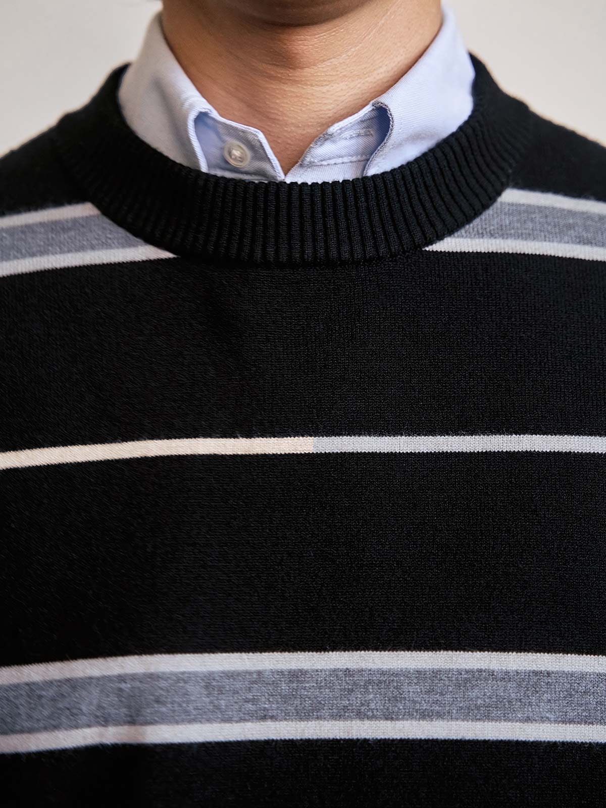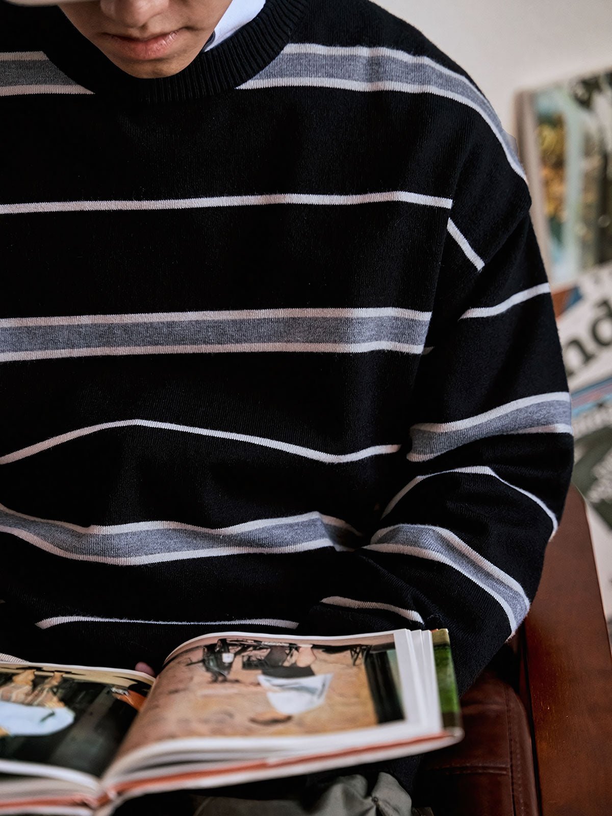 このストライプのクルーネックセーターは、クラシックな海軍スタイルのデザインを採用しており、その歴史は19世紀のフランス海軍の制服に遡ります。船員と水兵を区別するためにこのような服装がデザインされました。ストライプは基本色と対照的な明るい色で、繊細な光沢のある線が交じり、視覚的な層と現代感を加えています。