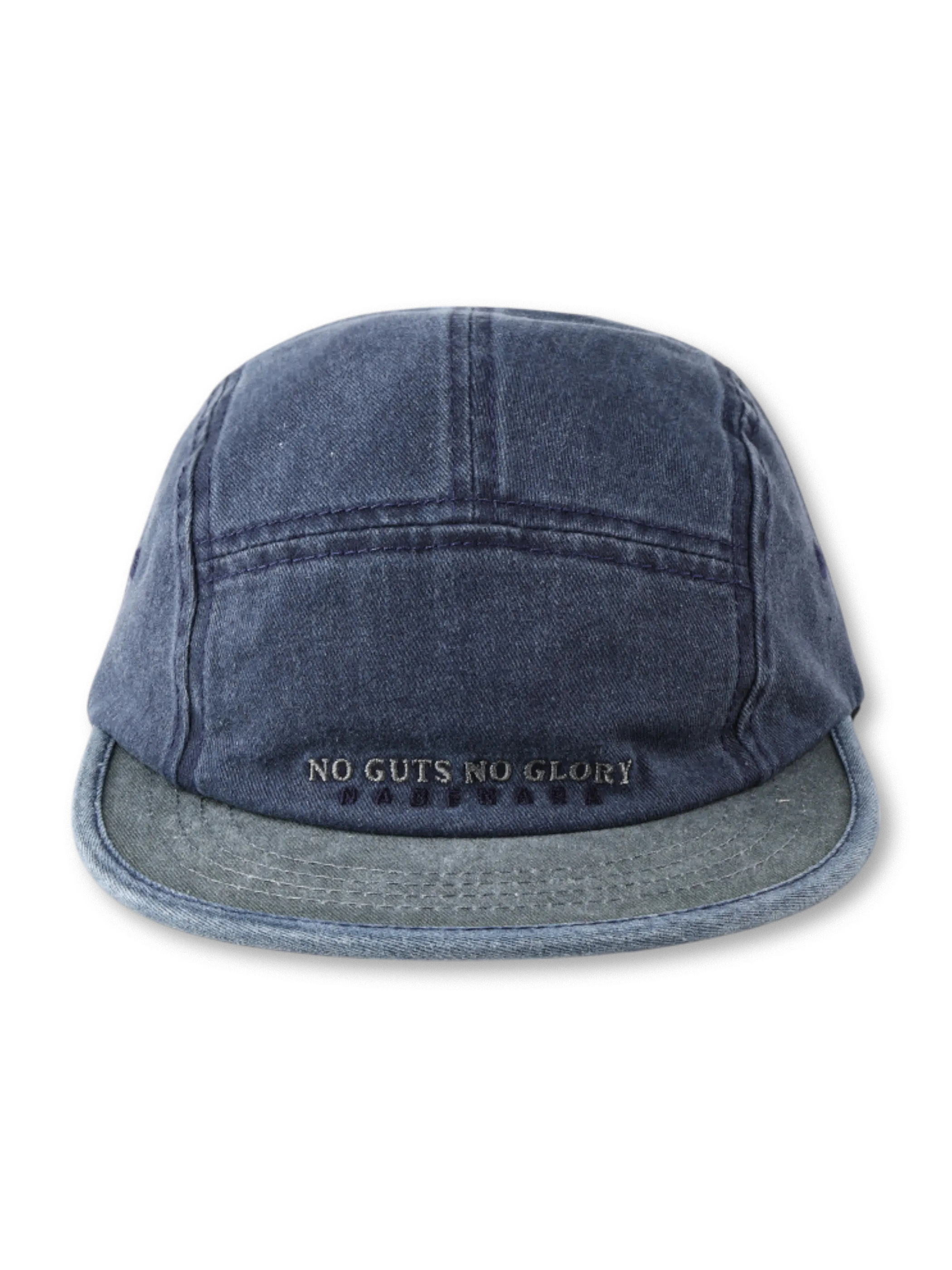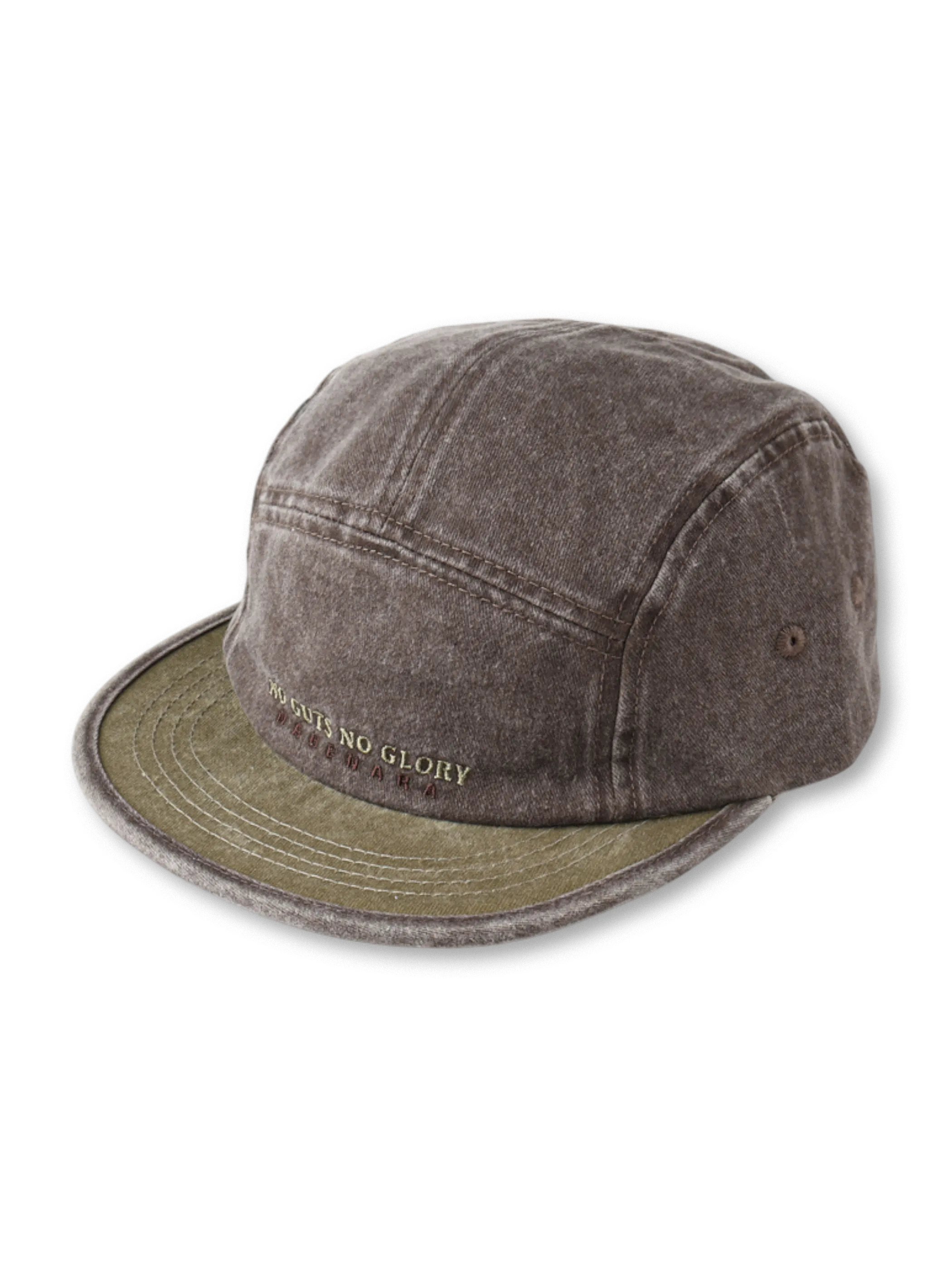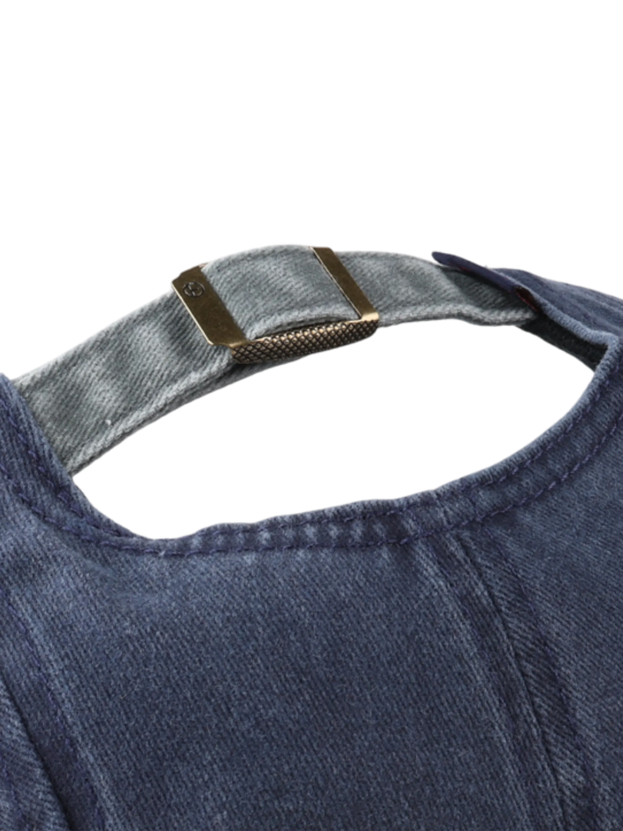 ヴィンテージ風ショートブリムと水洗い加工デニム生地を組み合わせ、工装の機能性とストリート感を両立した五枚構成キャップです。