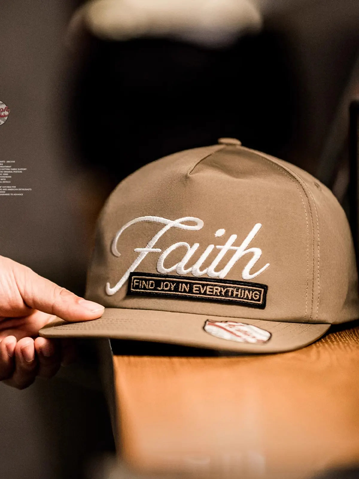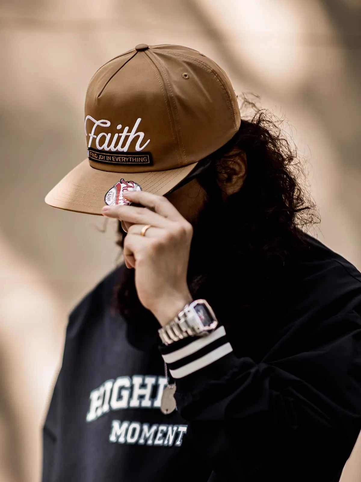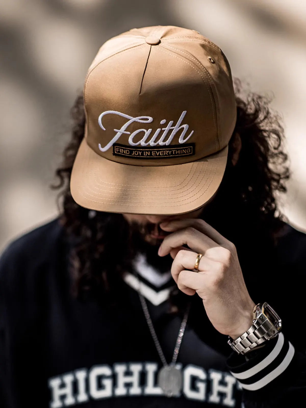 このベースボールキャップは19世紀の米国野球文化をイメージし、クラシックな6パネルのスナップバック仕様で安定した形状を保ちながら、刺繍ロゴと立体ワッペンで独特の表情を演出します。フロントには「Faith」の刺繍が際立ち、「Find Joy In Everything」というメッセージを組み合わせ、ストリートヒップホップの精神を強調しつつ、個性的なデザインを完成させました。100%コットンを使用し、程よいハリ感と通気性を兼ね備え、季節を問わず快適な着用感を提供します。浅くない被り心地と6.7cmのつばがしっかりと日差しを遮り、頭囲は57~60cmに調整可能。ショートパンツやスウェットパンツ、デニムとの相性も良く、ヴィンテージからスポーティまで様々なスタイリングに対応可能な万能キャップです。