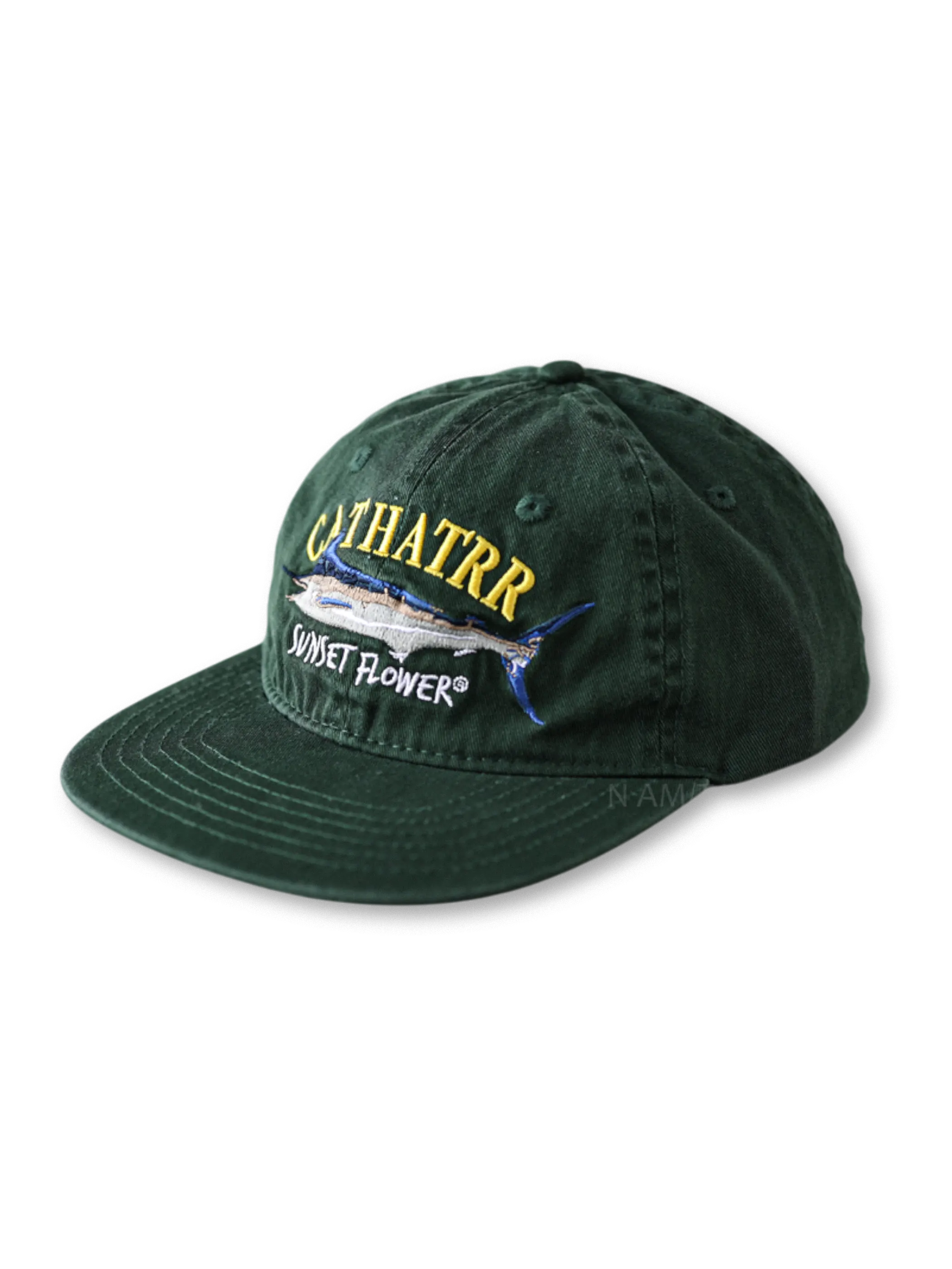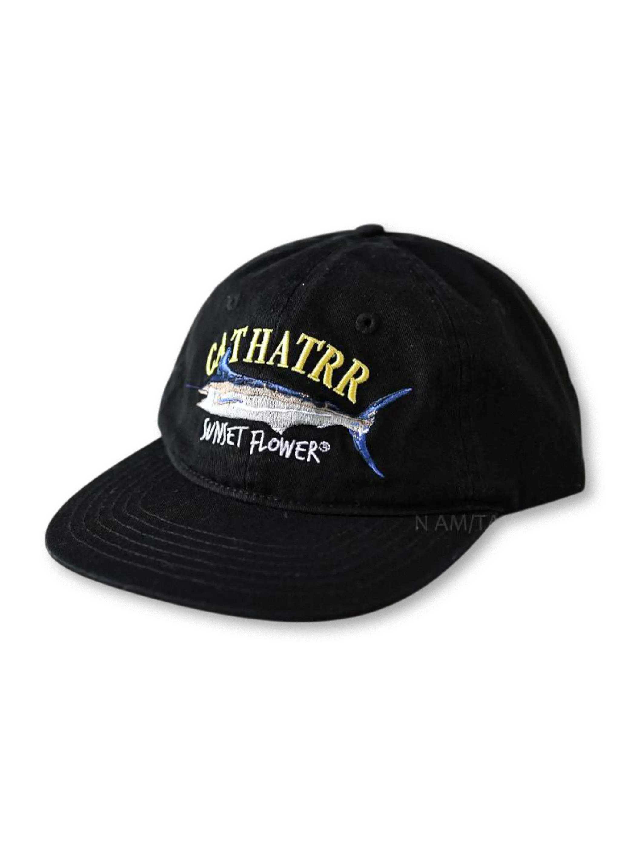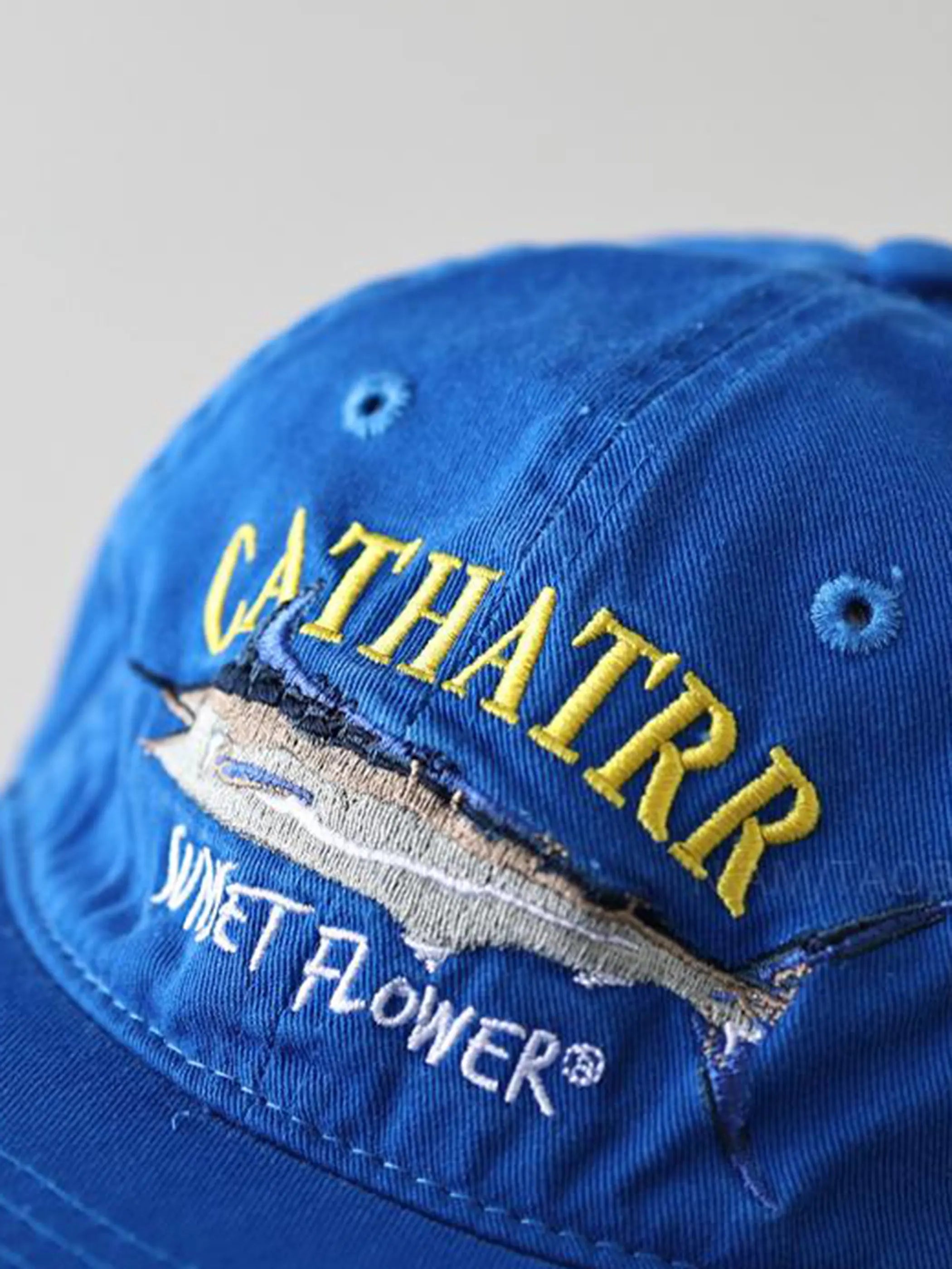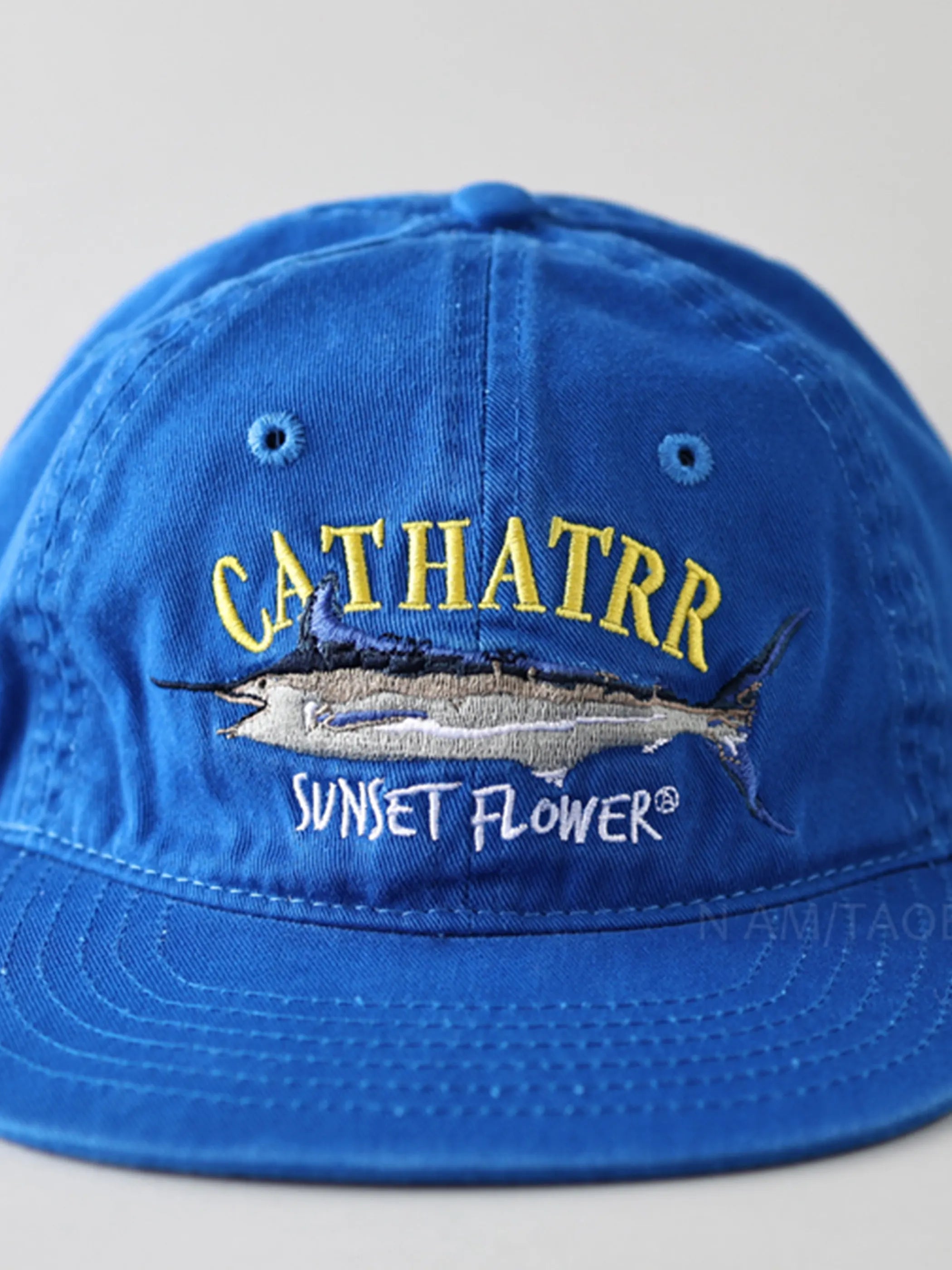 鮮やかなブルーと生き生きとした金槌魚刺繍が特徴的で、ストリートの活力と海の文化を融合させたファッショナブルなフラットブリムキャップ。