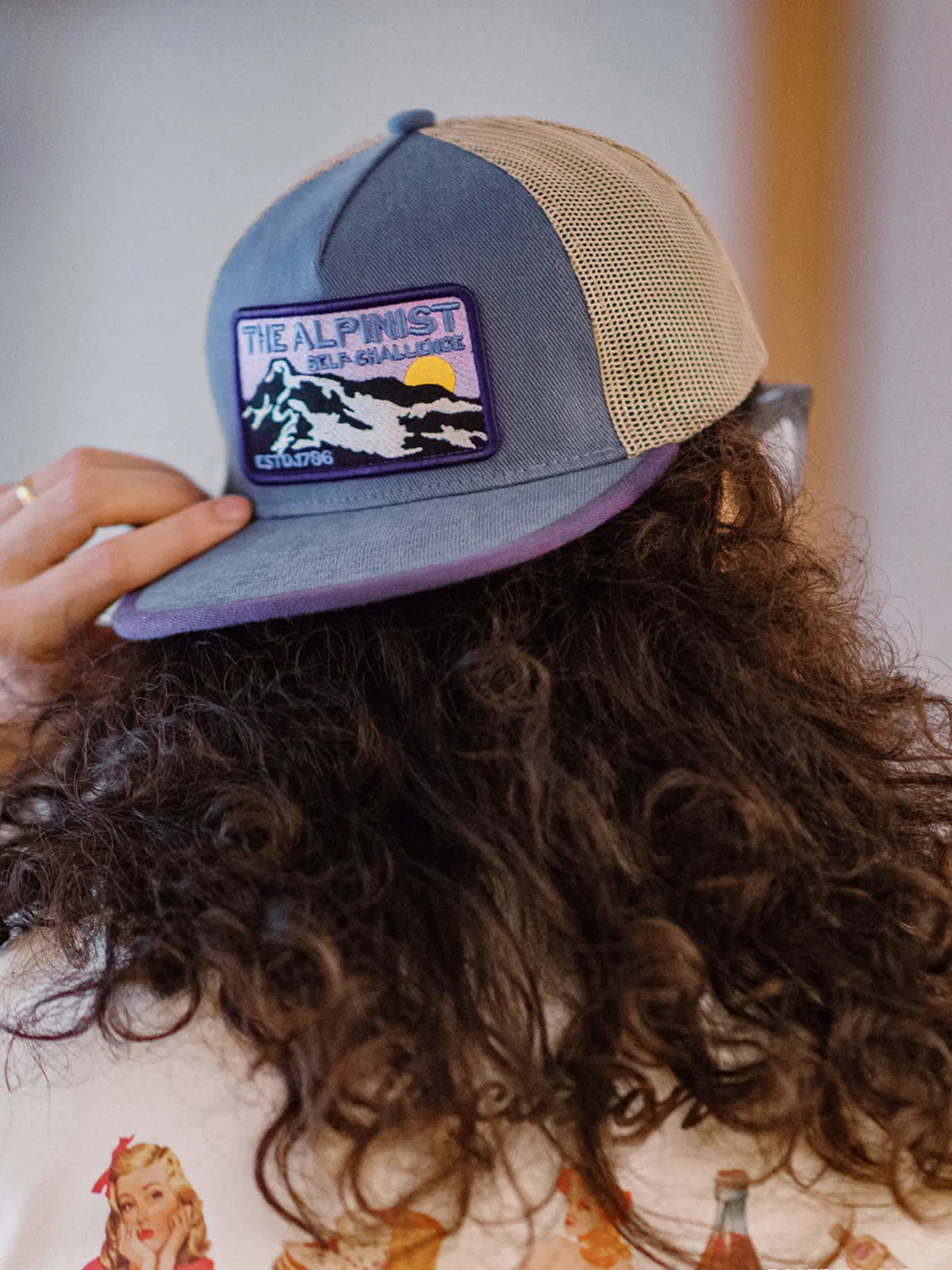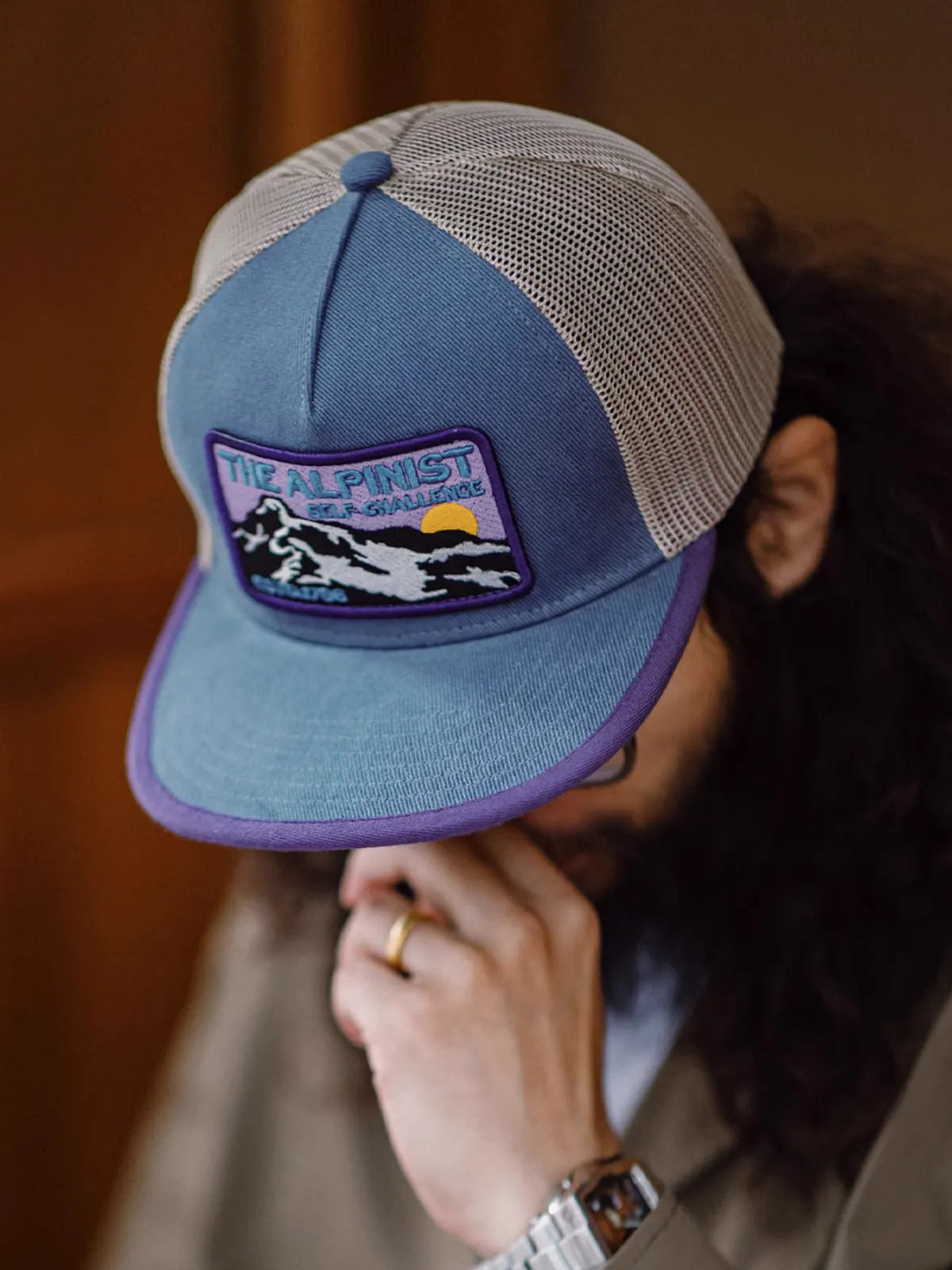このキャップは、登山家をテーマにした刺繍パッチとコットン×メッシュのコンビネーションが際立つ、ヴィンテージ感溢れる平ツバデザインです。