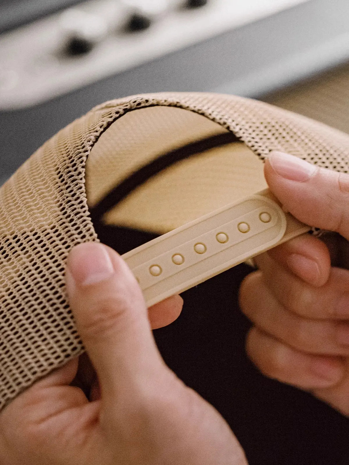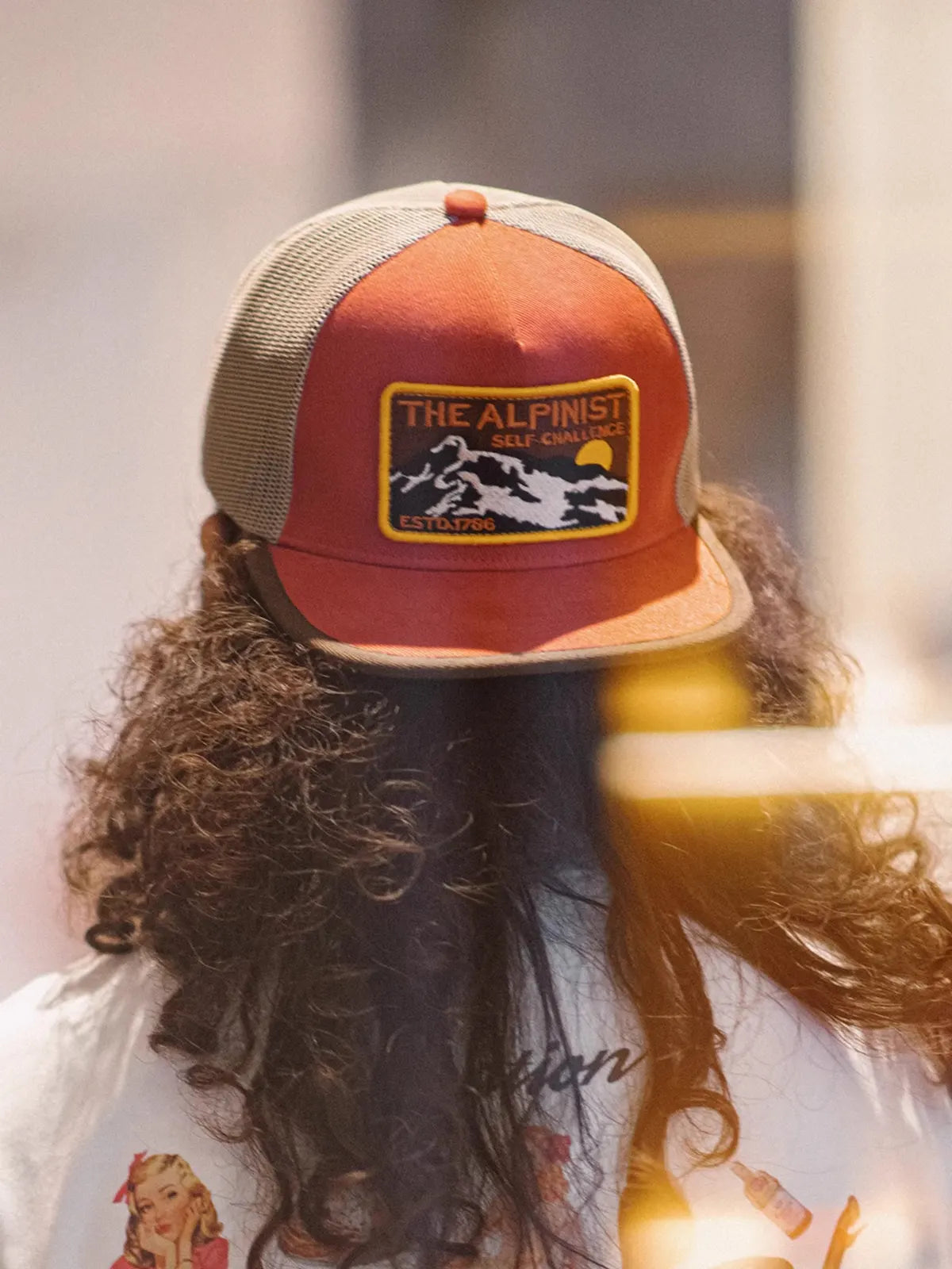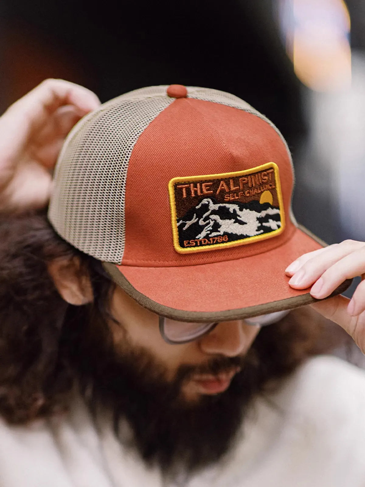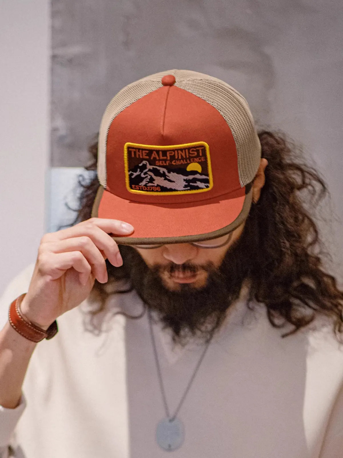 コットンキャンバスとメッシュ素材を切り替えた6パネル構造で、通気性と耐久性を両立。フロントの「THE ALPINIST SELF-CHALLENGE」刺繍パッチは、雪山や夕陽など複数のモチーフを組み合わせており、挑戦心を表現したデザインが魅力です。スナップバック式のアジャスターで頭囲を56~61cmに調節可能。配色バリエーションの異なる2カラーが、カジュアルスタイルやアウトドアコーデをレトロに彩ります。