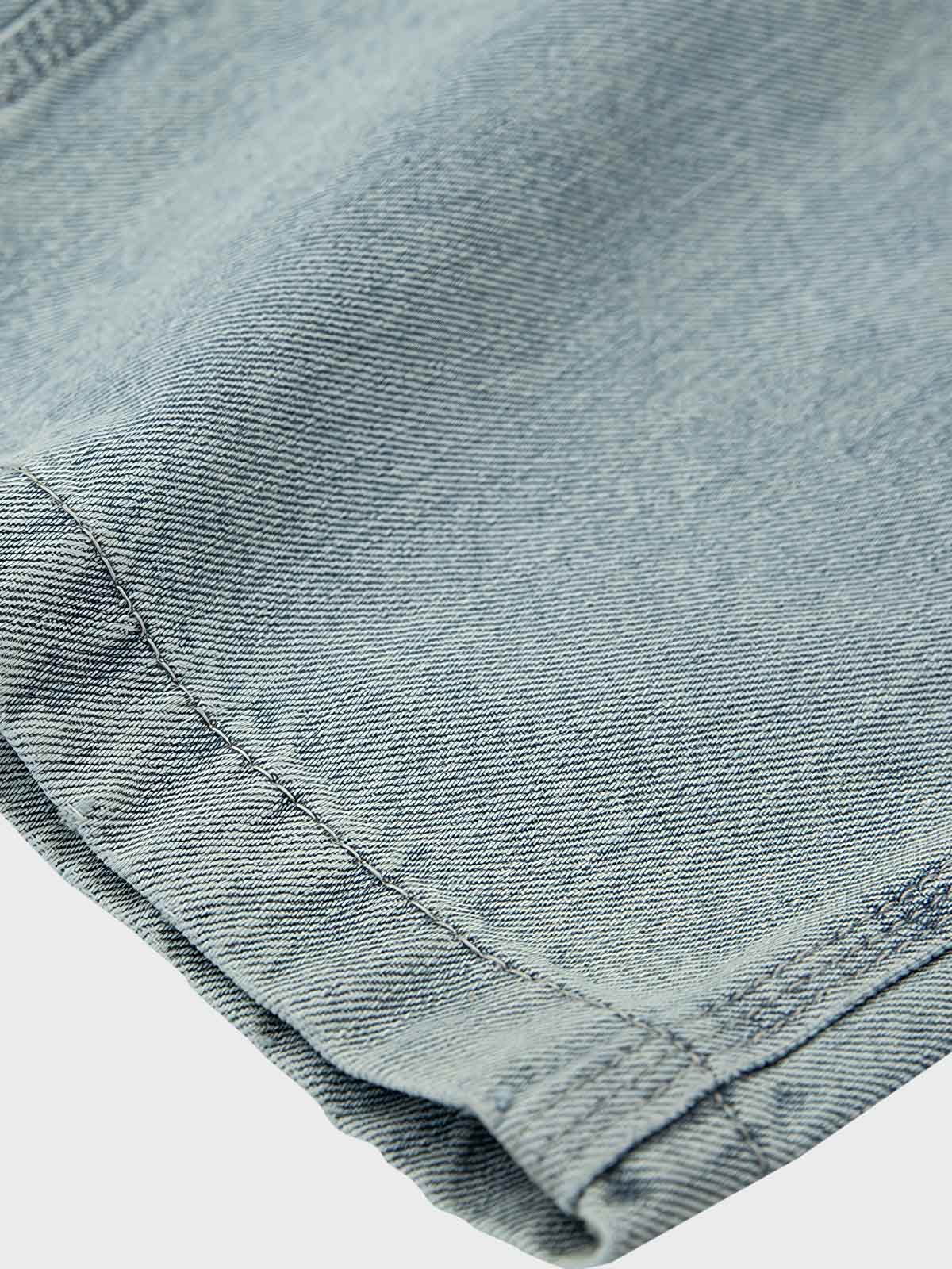 クラシックなライトブルーの色合いと非対称のパッチワークデザインが、ビンテージワークウェアのスタイルを現代的なファッションと伝統的な手工芸と融合させています。