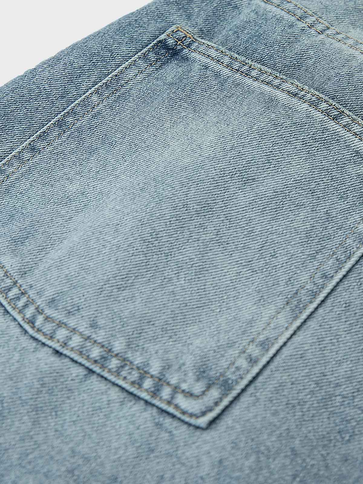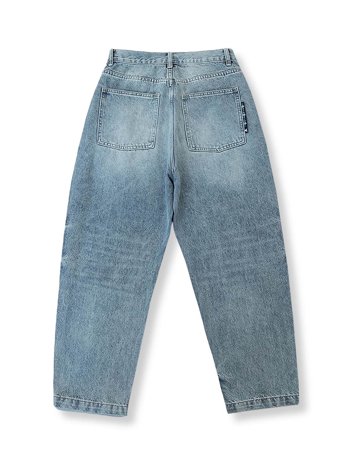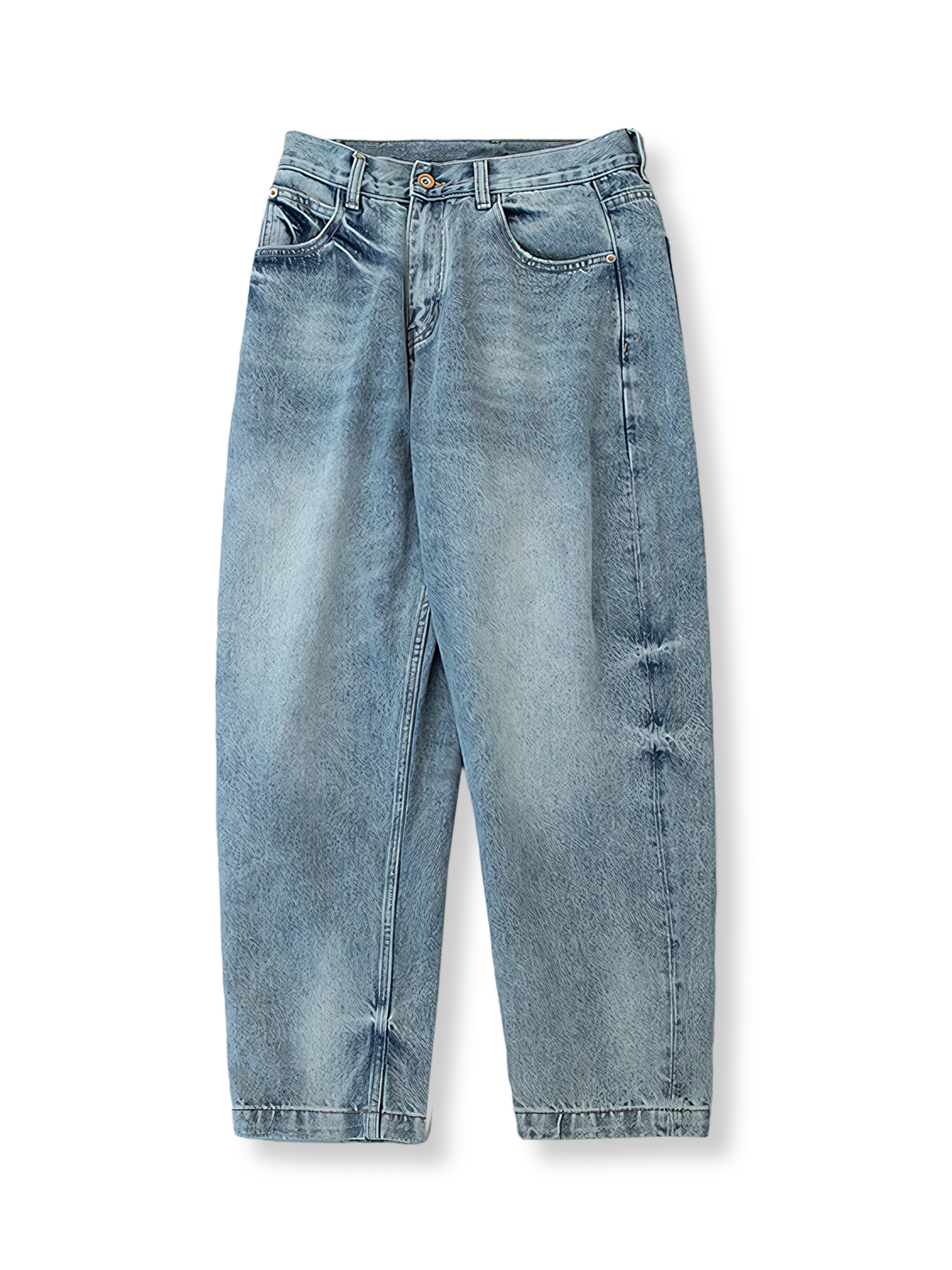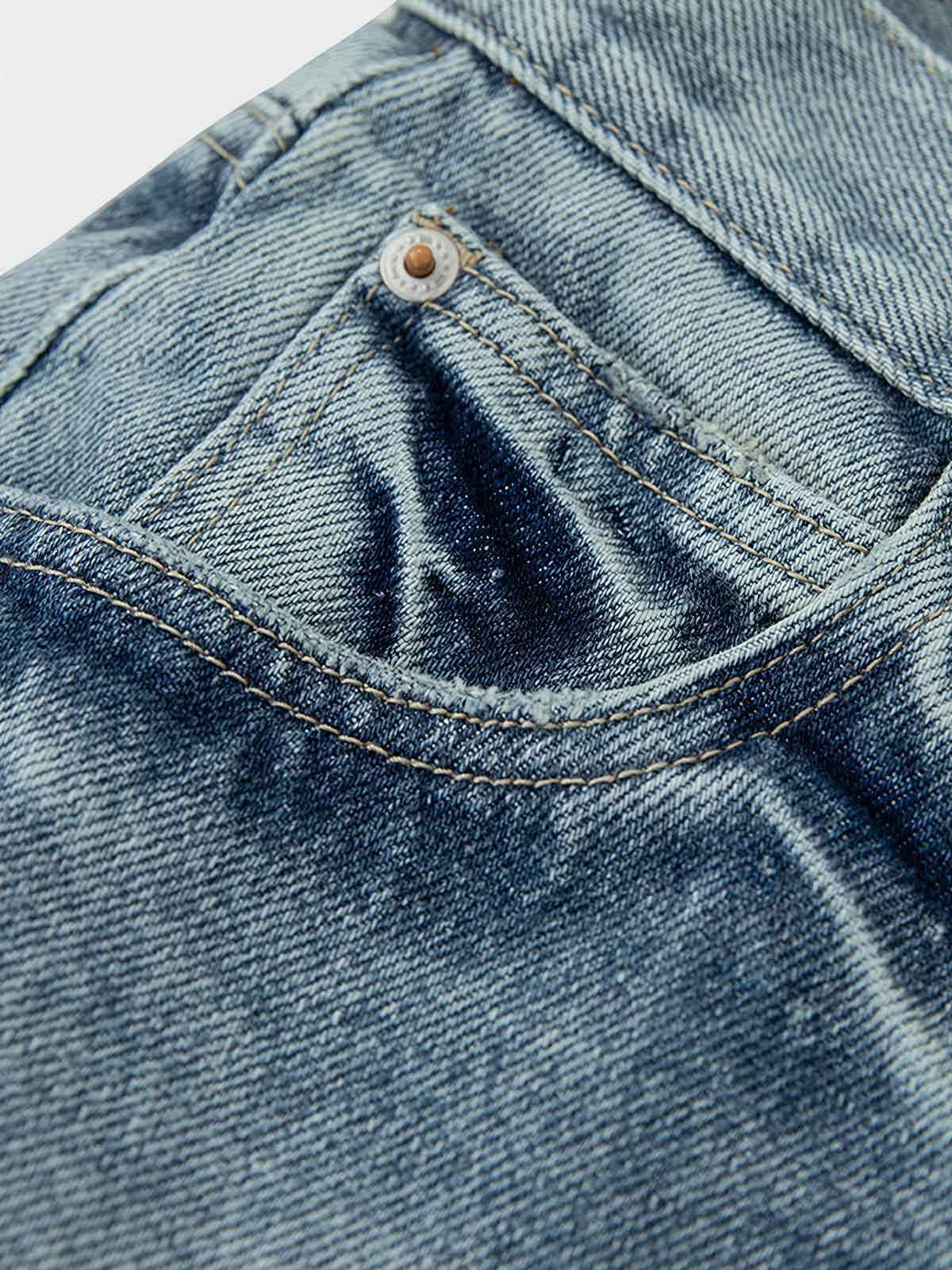 これは高級感のあるデニムストレートパンツで、リラックスしたワイドレッグのスタイルです。パンツの洗練されたプレスクリースは、カジュアルながらも高級感を演出し、さりげないエレガンスを提供します。ストレートのカットとワイドなレッグは流行に左右されないクラシックなスタイルを表現しています。