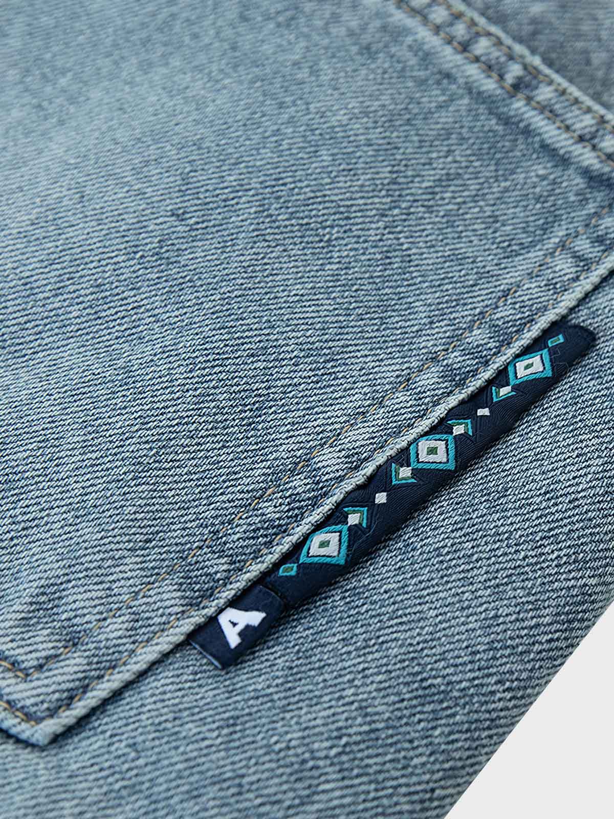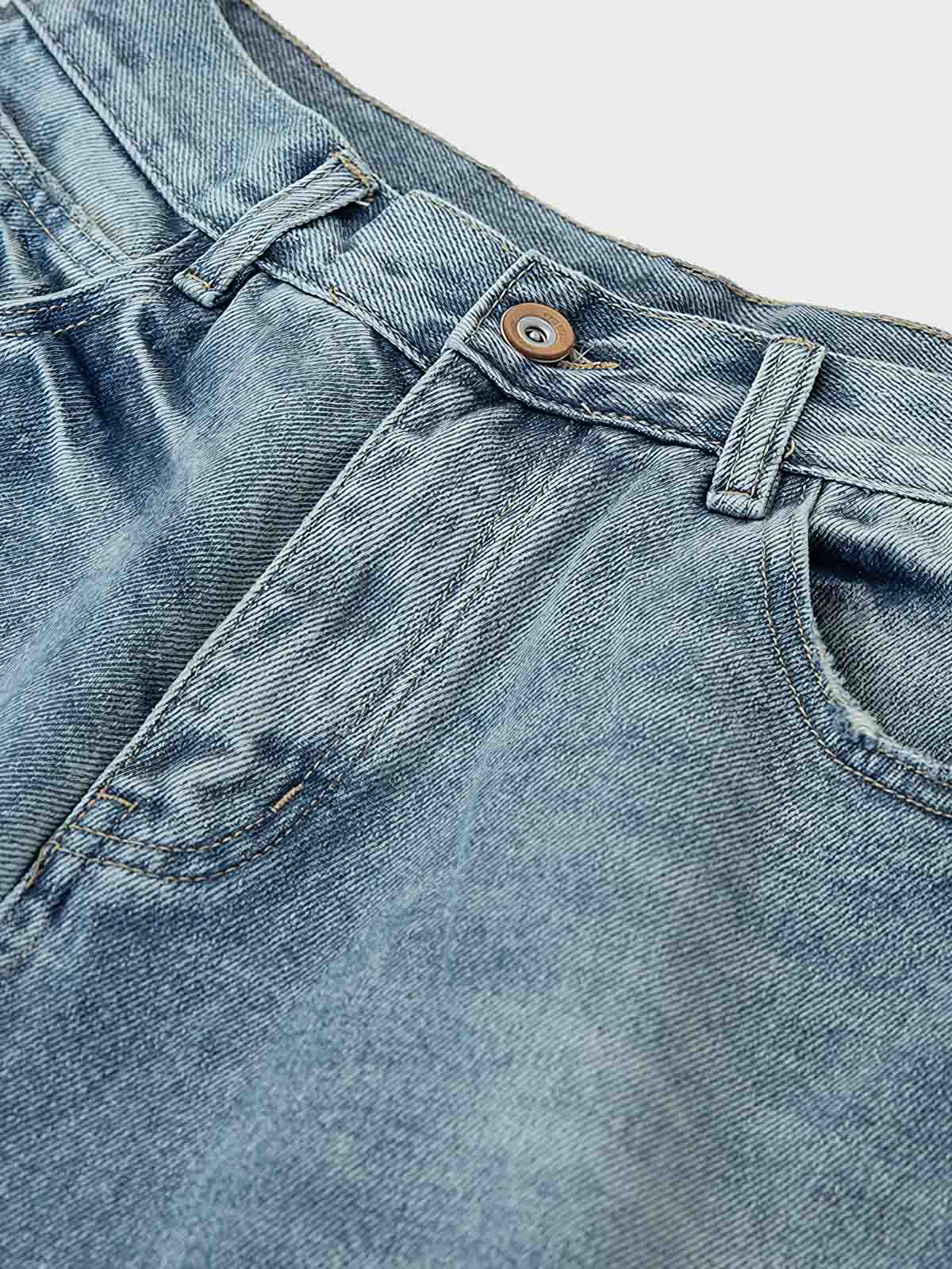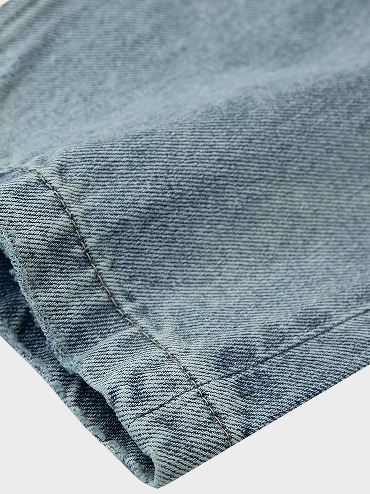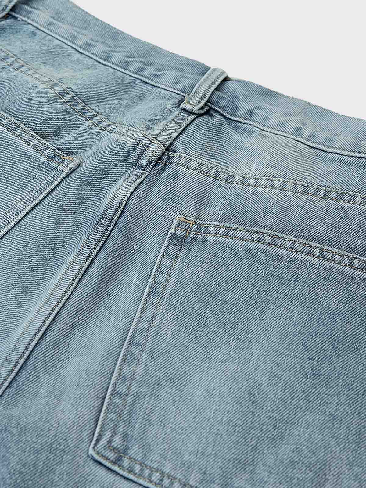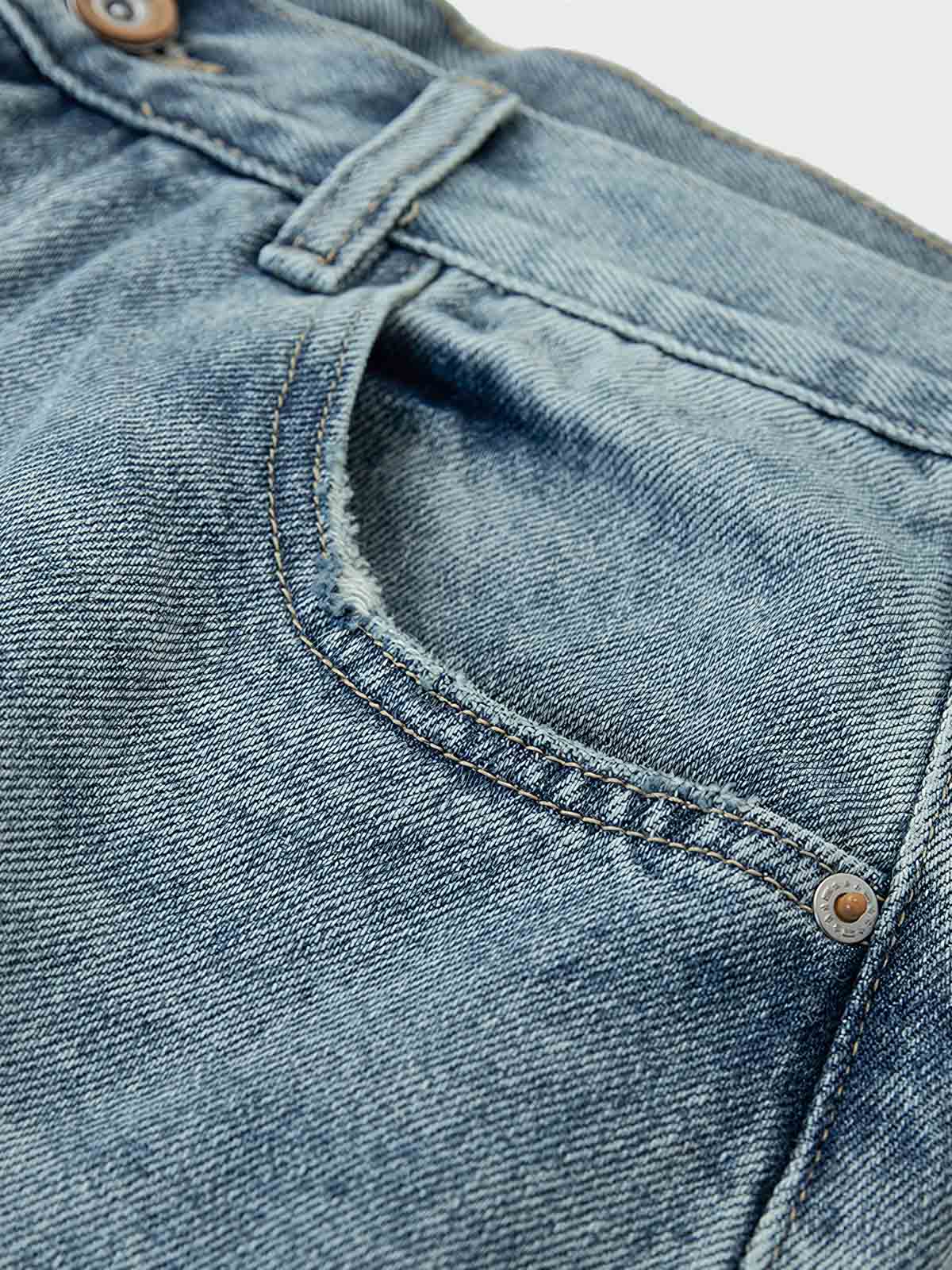 これは高級感のあるデニムストレートパンツで、リラックスしたワイドレッグのスタイルです。パンツの洗練されたプレスクリースは、カジュアルながらも高級感を演出し、さりげないエレガンスを提供します。ストレートのカットとワイドなレッグは流行に左右されないクラシックなスタイルを表現しています。