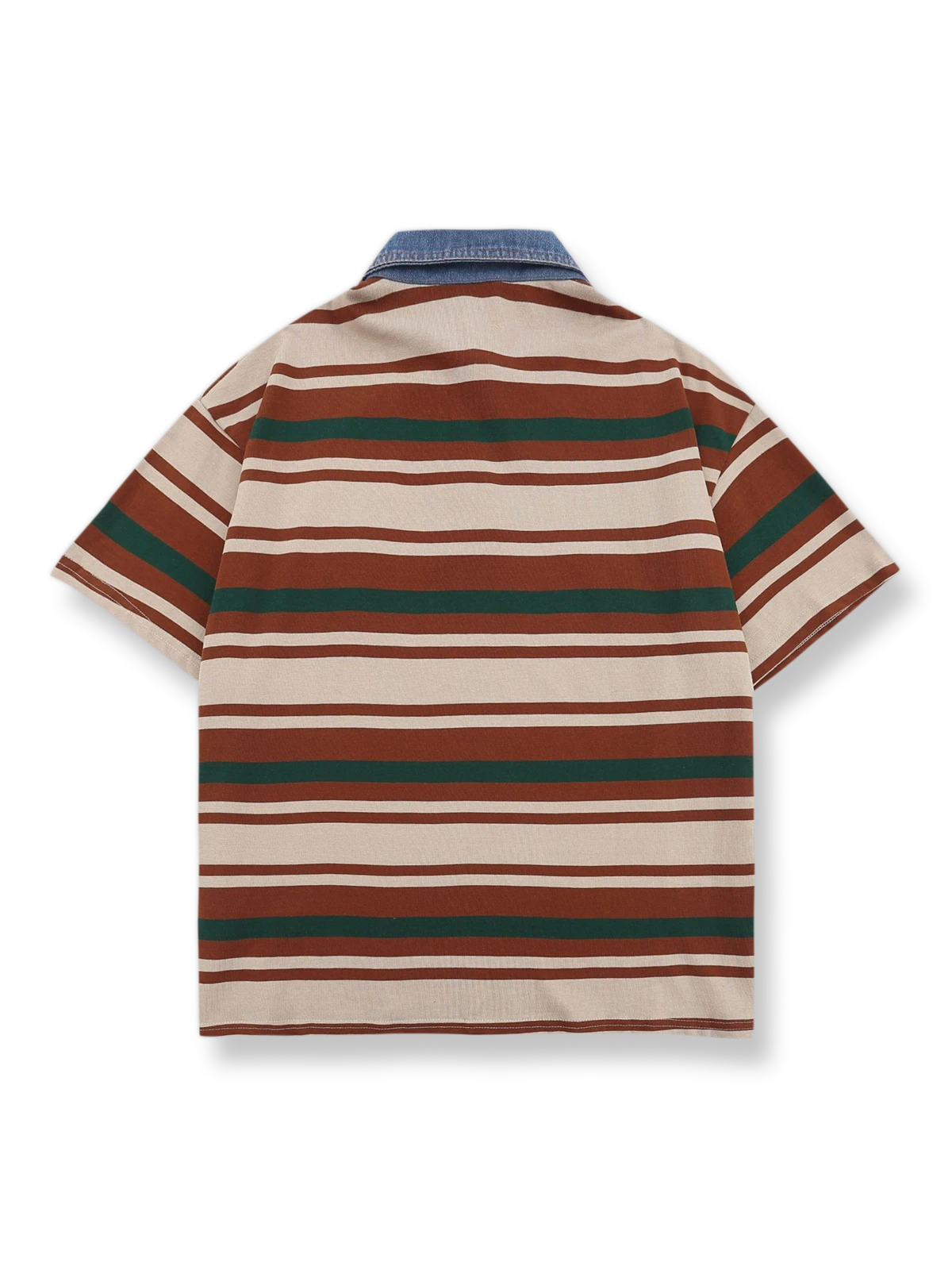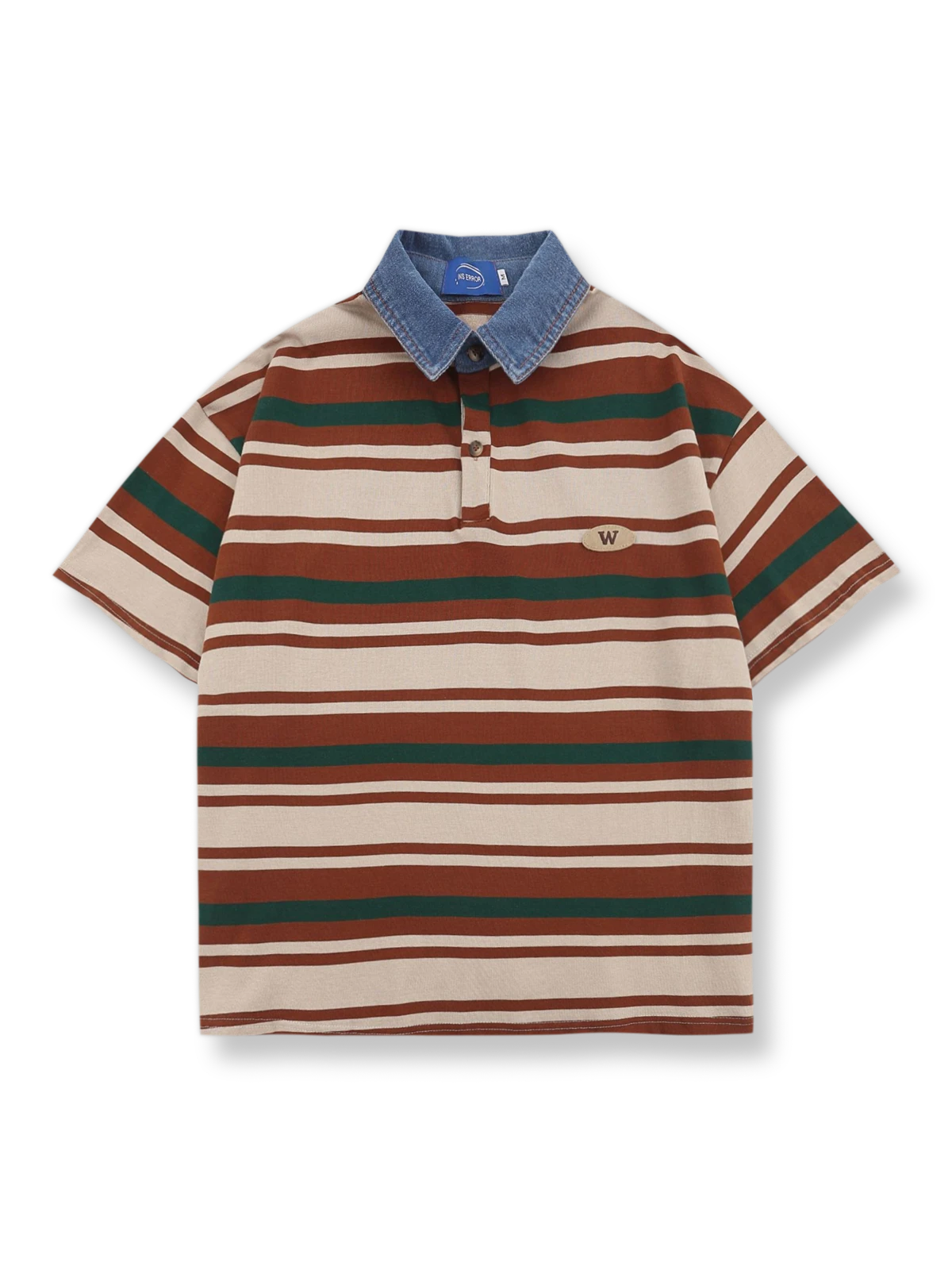 このポロシャツは、クラシックなポロシャツにレトロな要素を取り入れたデザインです。目を引くストライプ柄とデニムカラーを採用し、1970年代後半のカジュアルファッションの流行を反映しています。デニム衣類の実用性とカジュアルな精神から着想を得て、ストライプパターンと組み合わせることで、自然体でありながら洗練された生活態度を示しています。