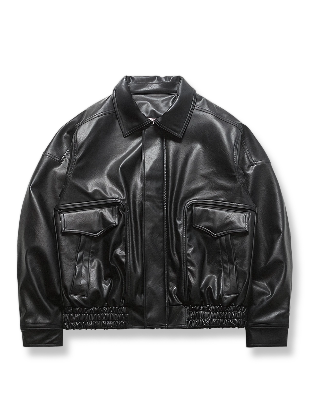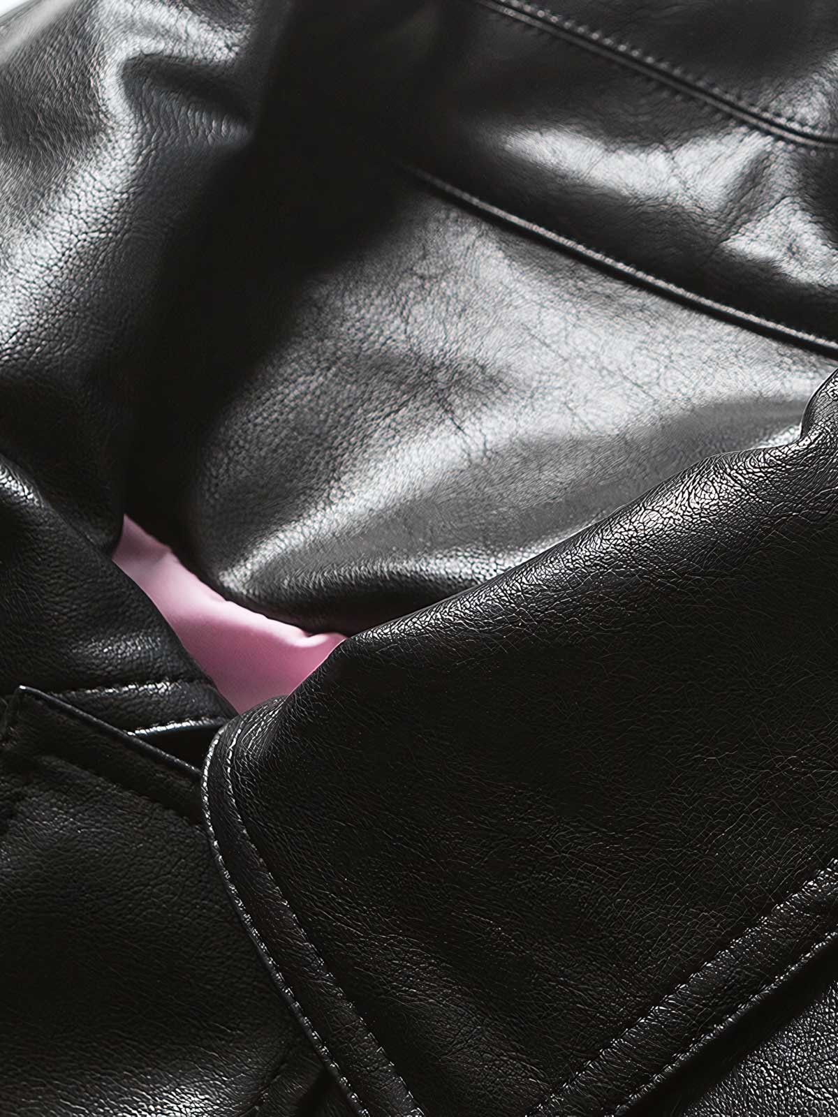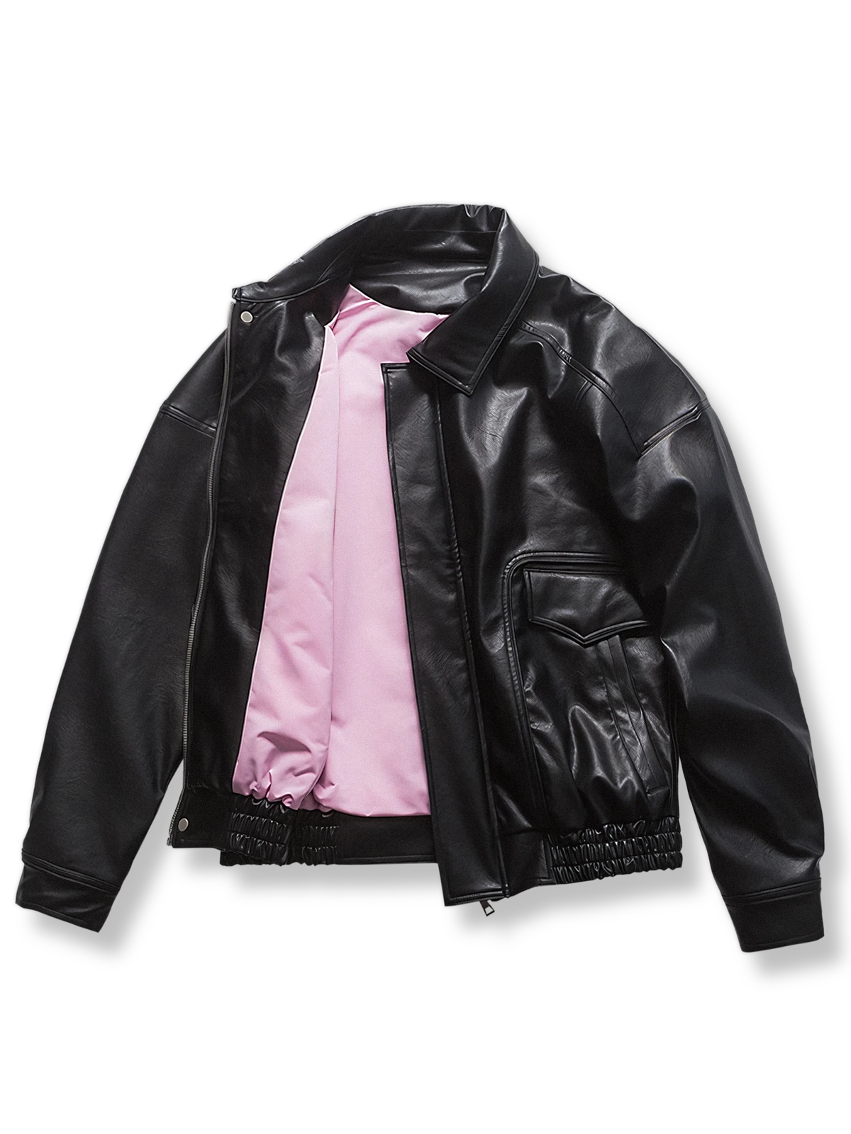 このレザージャケットは、ビンテージスタイルにインスパイアされた大きなポケットと厚めされたデザインが特徴です。ゆったりとしたPUレザーを採用し、フロントはプラクティカルなジッパーで閉じられます。内側のピンクの裏地が鮮やかなコントラストを与え、クラシックなブラックレザーのルックに華を添えています。