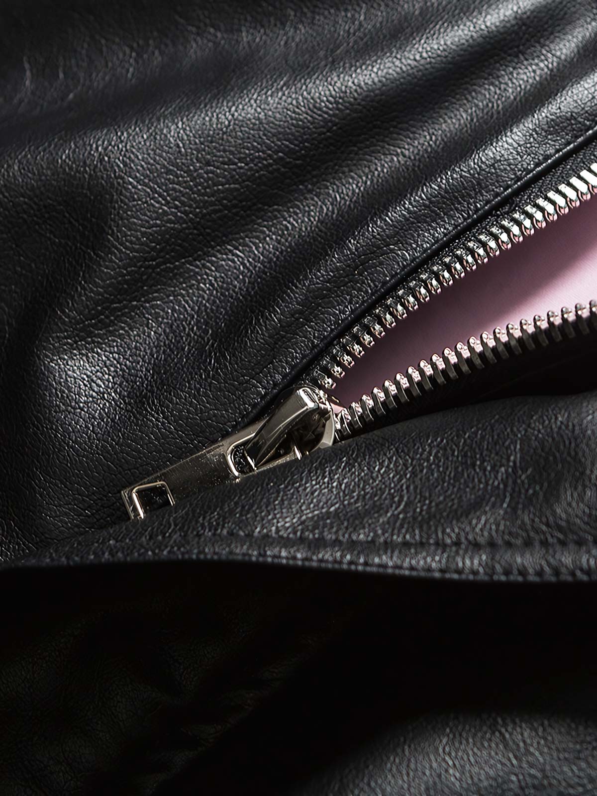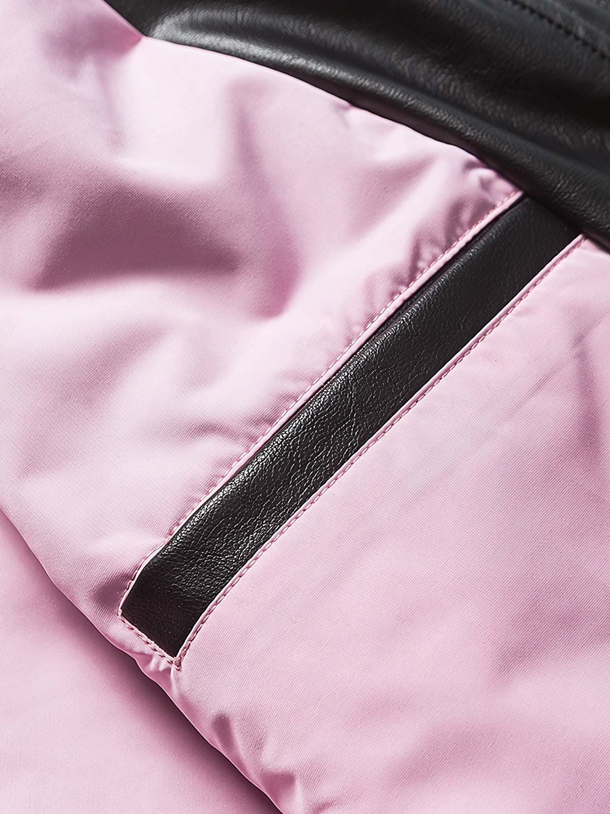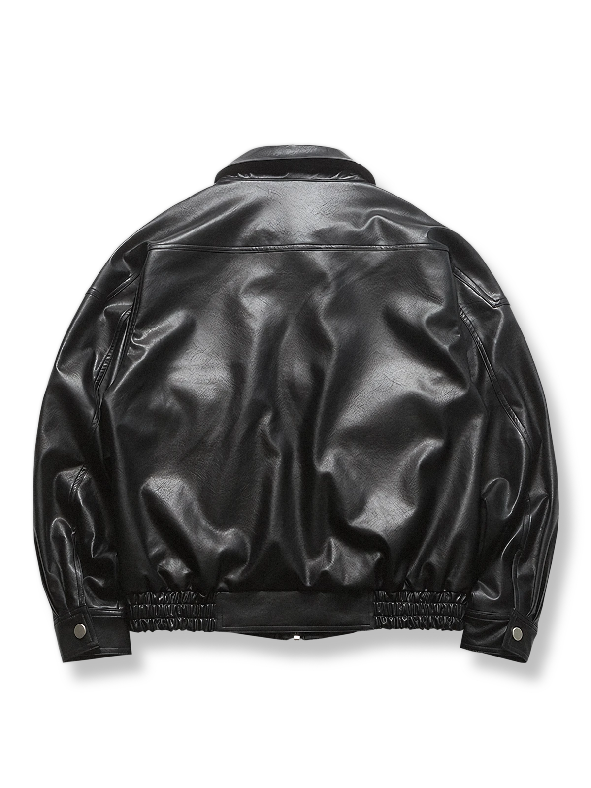 このレザージャケットは、ビンテージスタイルにインスパイアされた大きなポケットと厚めされたデザインが特徴です。ゆったりとしたPUレザーを採用し、フロントはプラクティカルなジッパーで閉じられます。内側のピンクの裏地が鮮やかなコントラストを与え、クラシックなブラックレザーのルックに華を添えています。