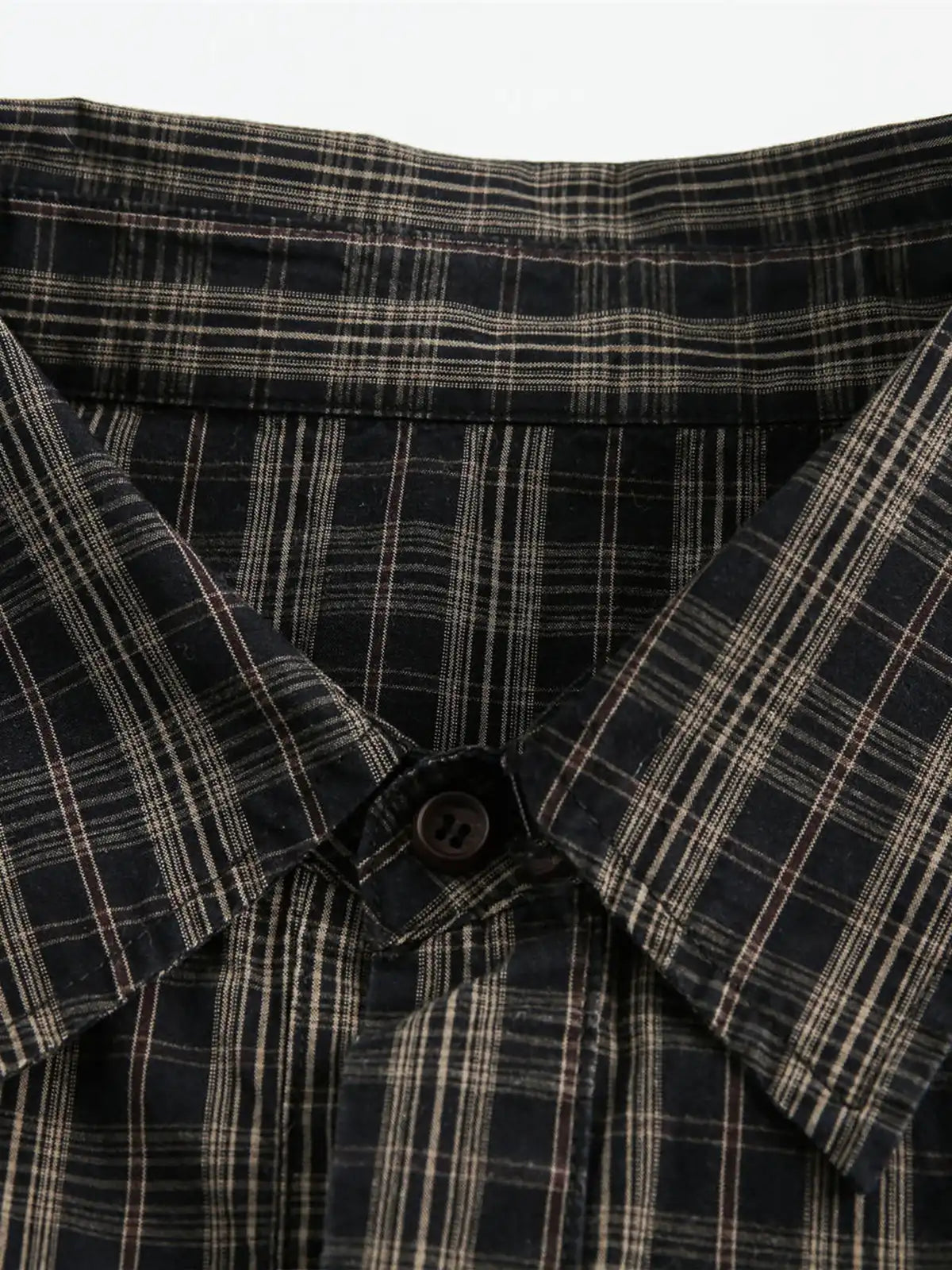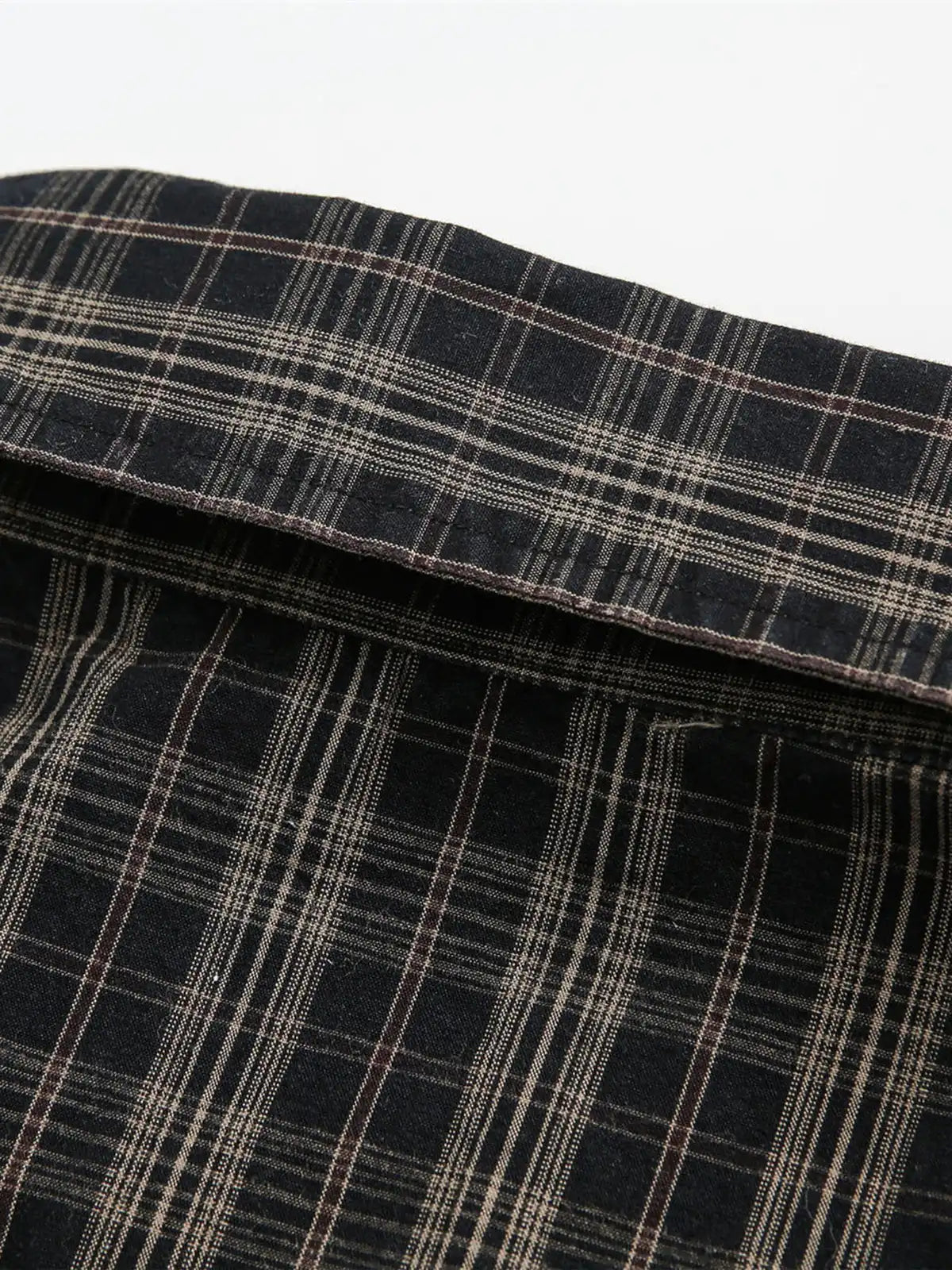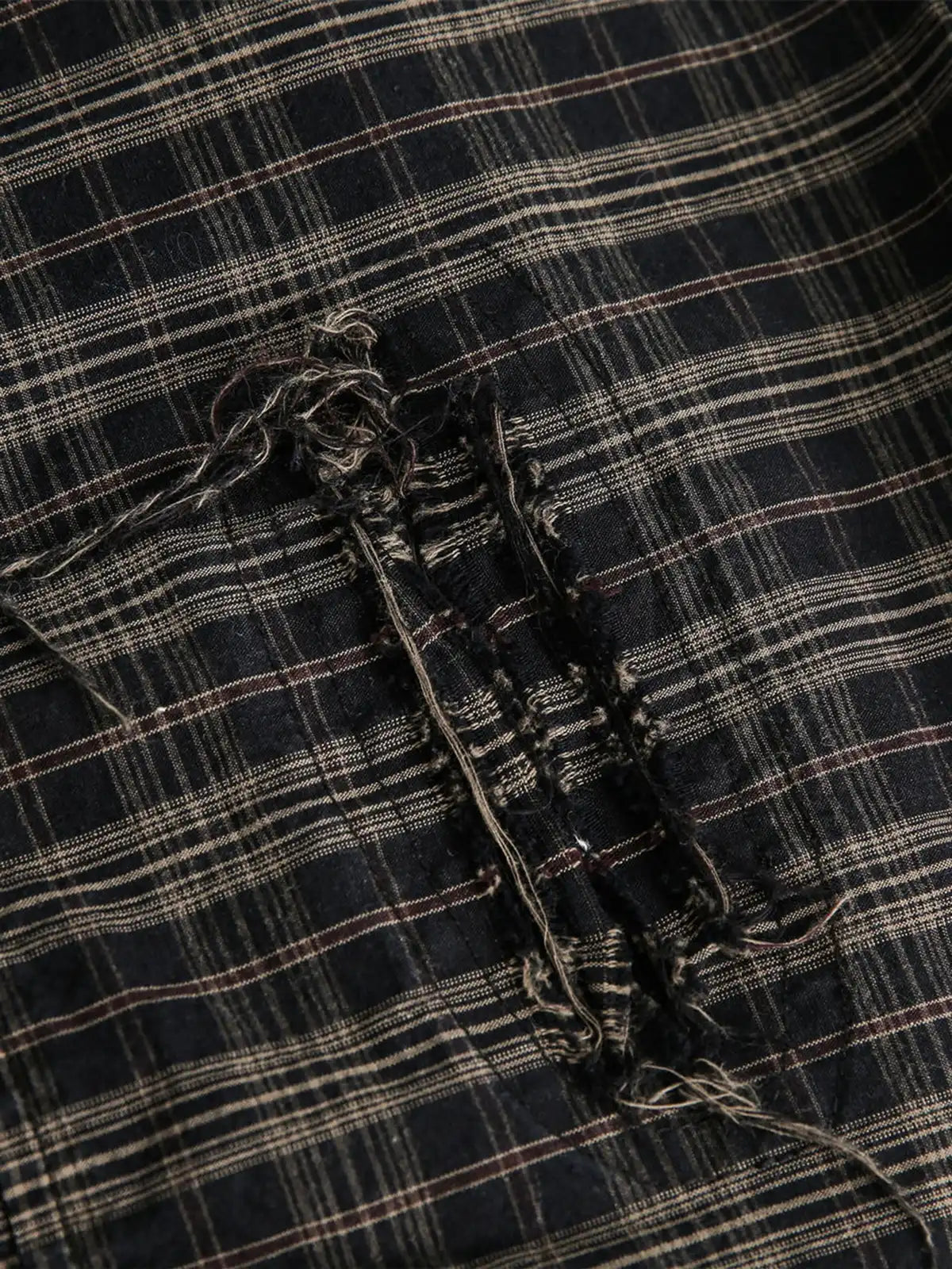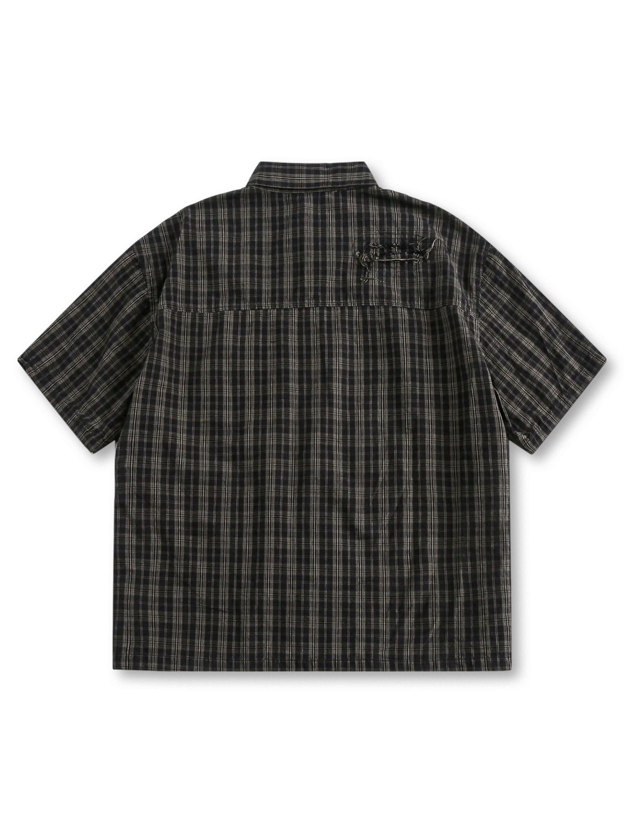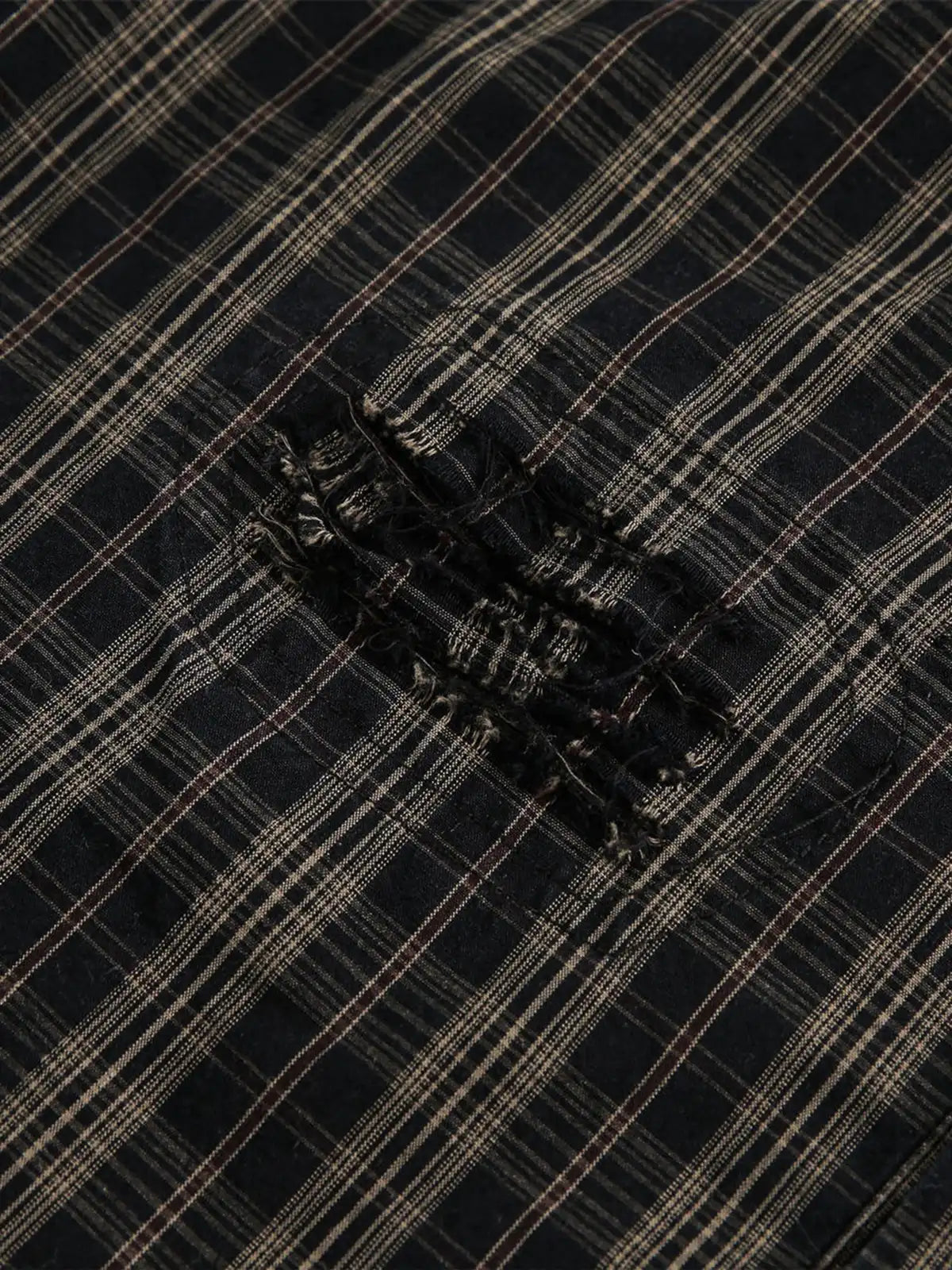大胆なダメージ加工と古典的なチェック柄が融合した、現代版ワークウェアスタイルの半袖シャツ。