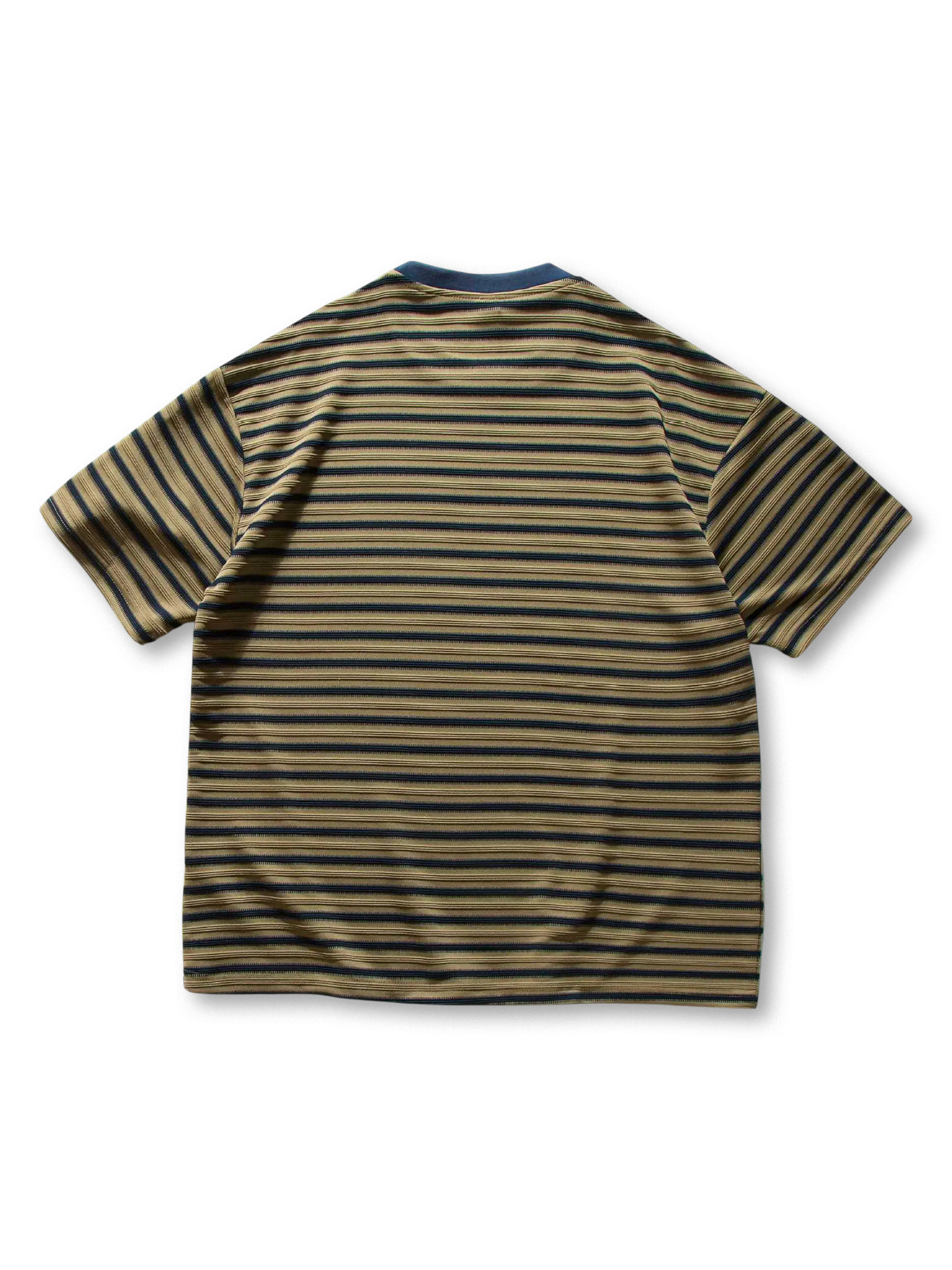 多色のボーダーを組み合わせた表情豊かなテキスタイルがコーディネートにアクセントを加え、クルーネックとドロップショルダーのリラックスフィットが快適な着心地を実現。厚みを抑えたポリエステル素材はシルキーな肌触りで夏でも涼しく、洗濯後も色落ちしにくいためデイリーに活躍します。