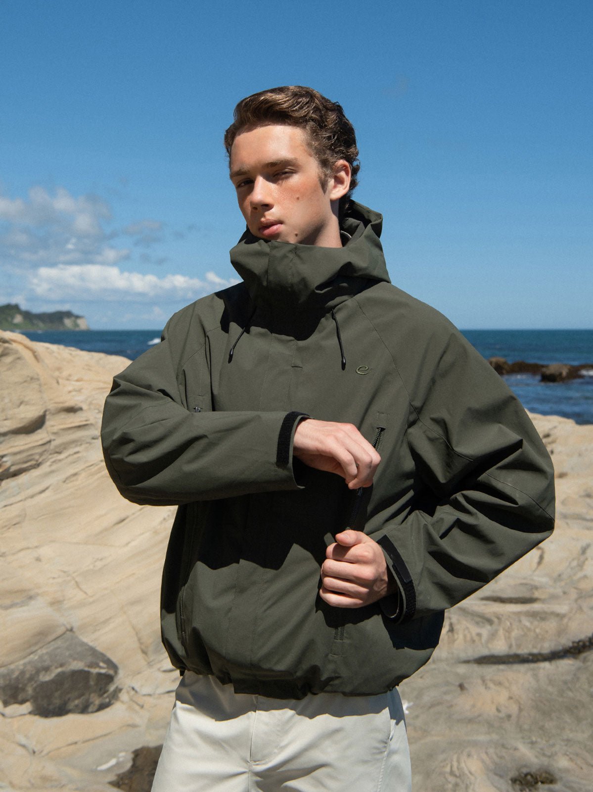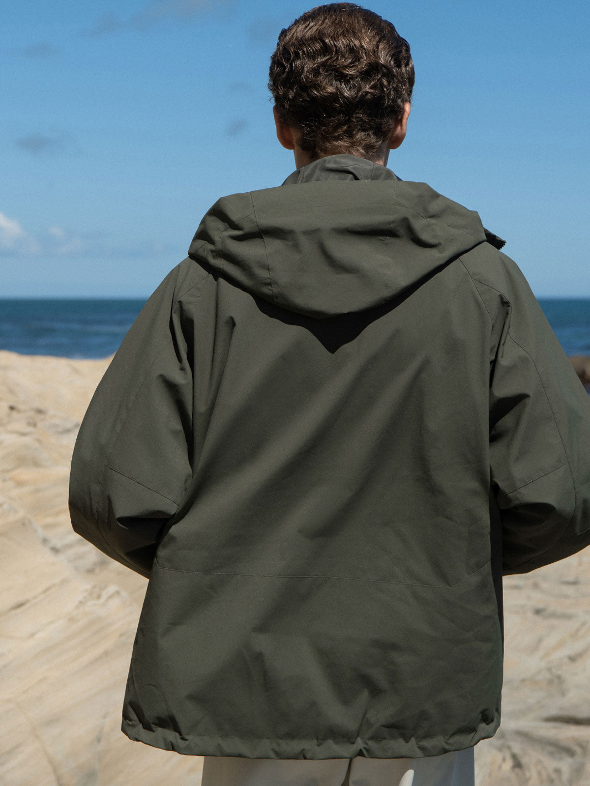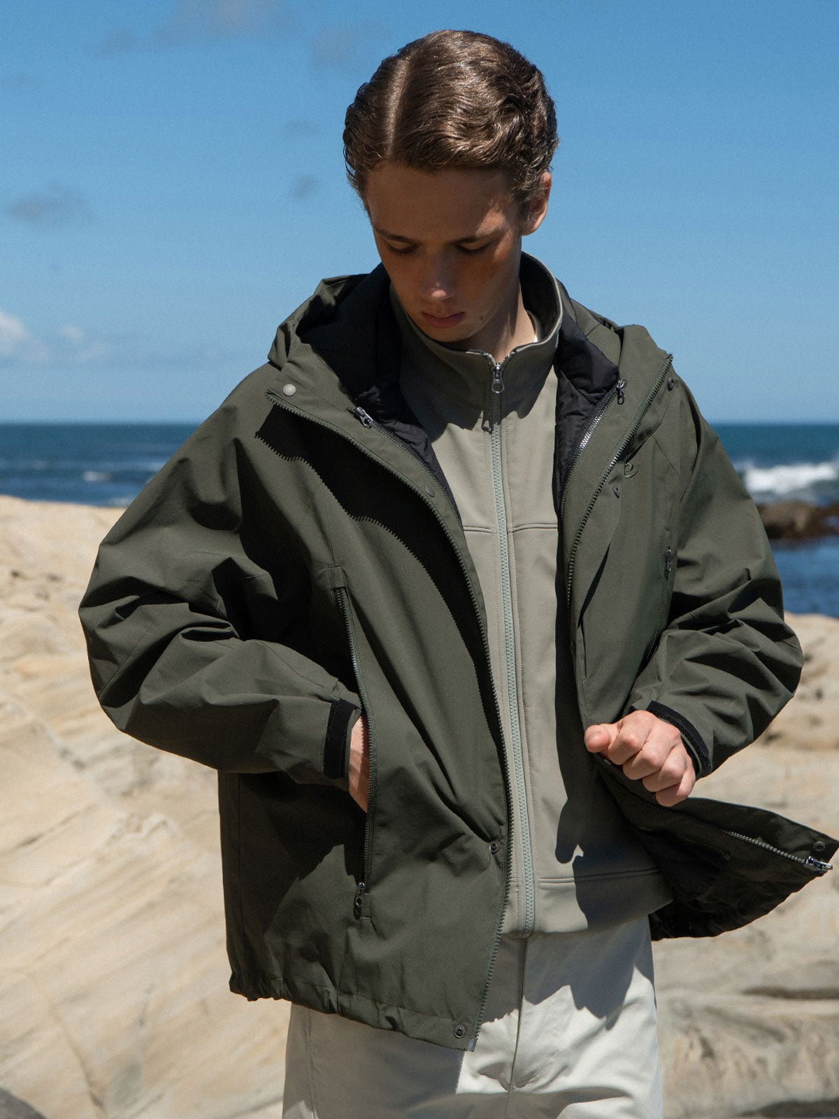 このアウトドア用の三防(防水、防風、防寒)ジャケットは、アウトドアウェアの実用性と多機能性の融合を象徴しています。取り外し可能なダウンライナーは、異なる気候への適応を考慮に入れ、現代技術とデザインの知恵の産物です。