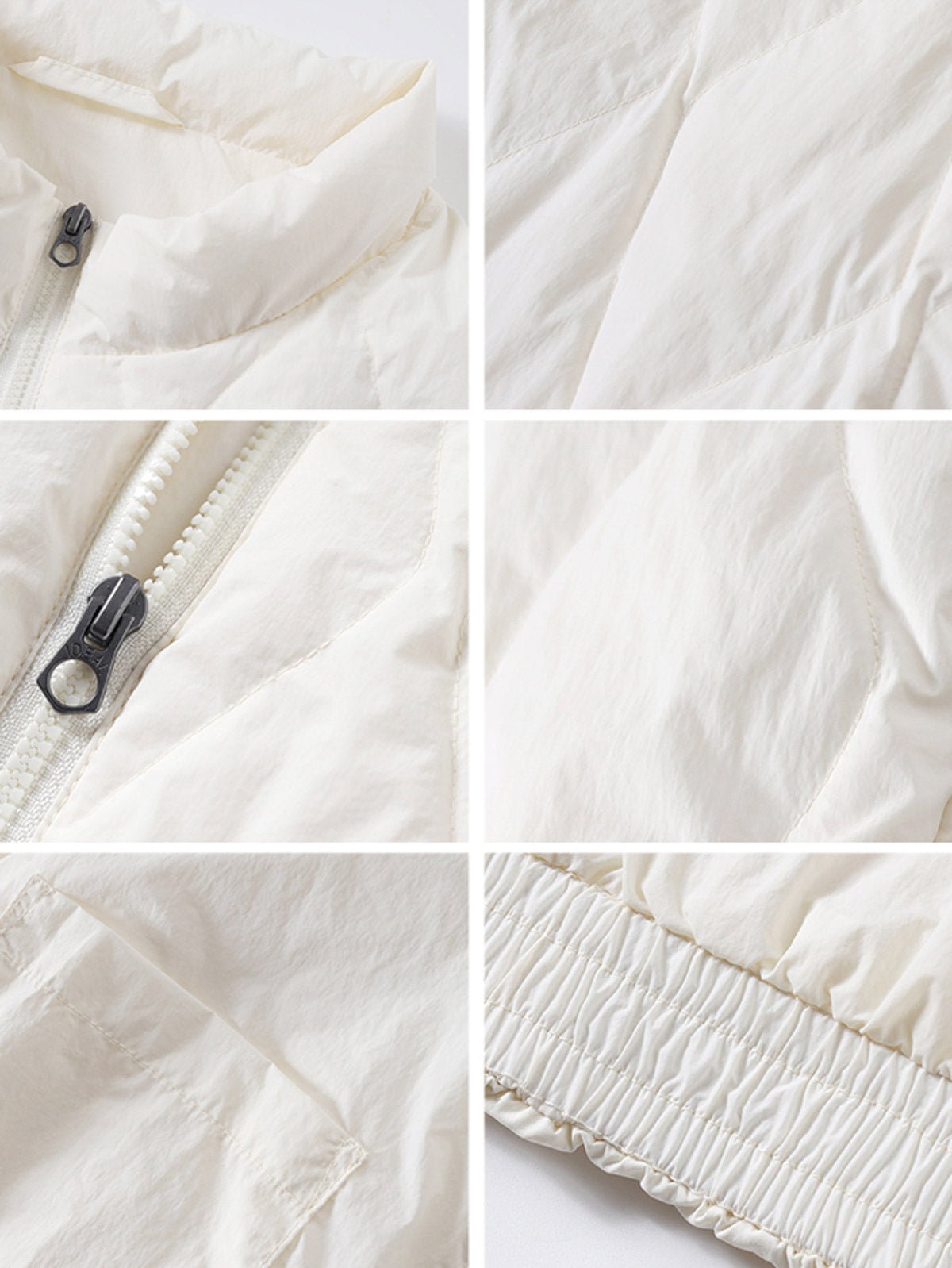 外層は高技術の防水素材を採用し、内側には保温性に優れたダウンを使用し、通気性も考慮しています。複数のジップポケットは小物を持ち運ぶのに便利であり、ジャケットの実用性も向上しています。