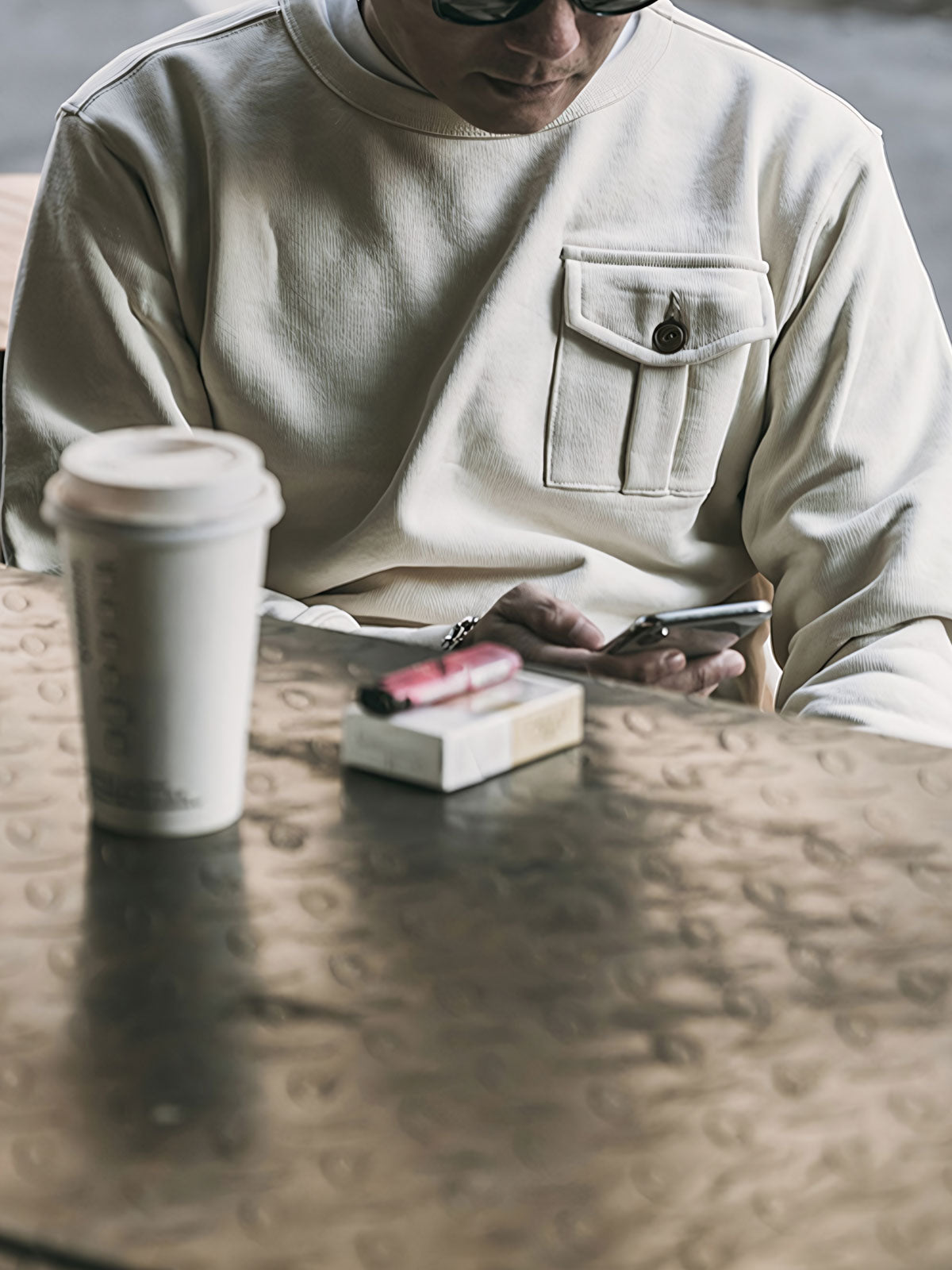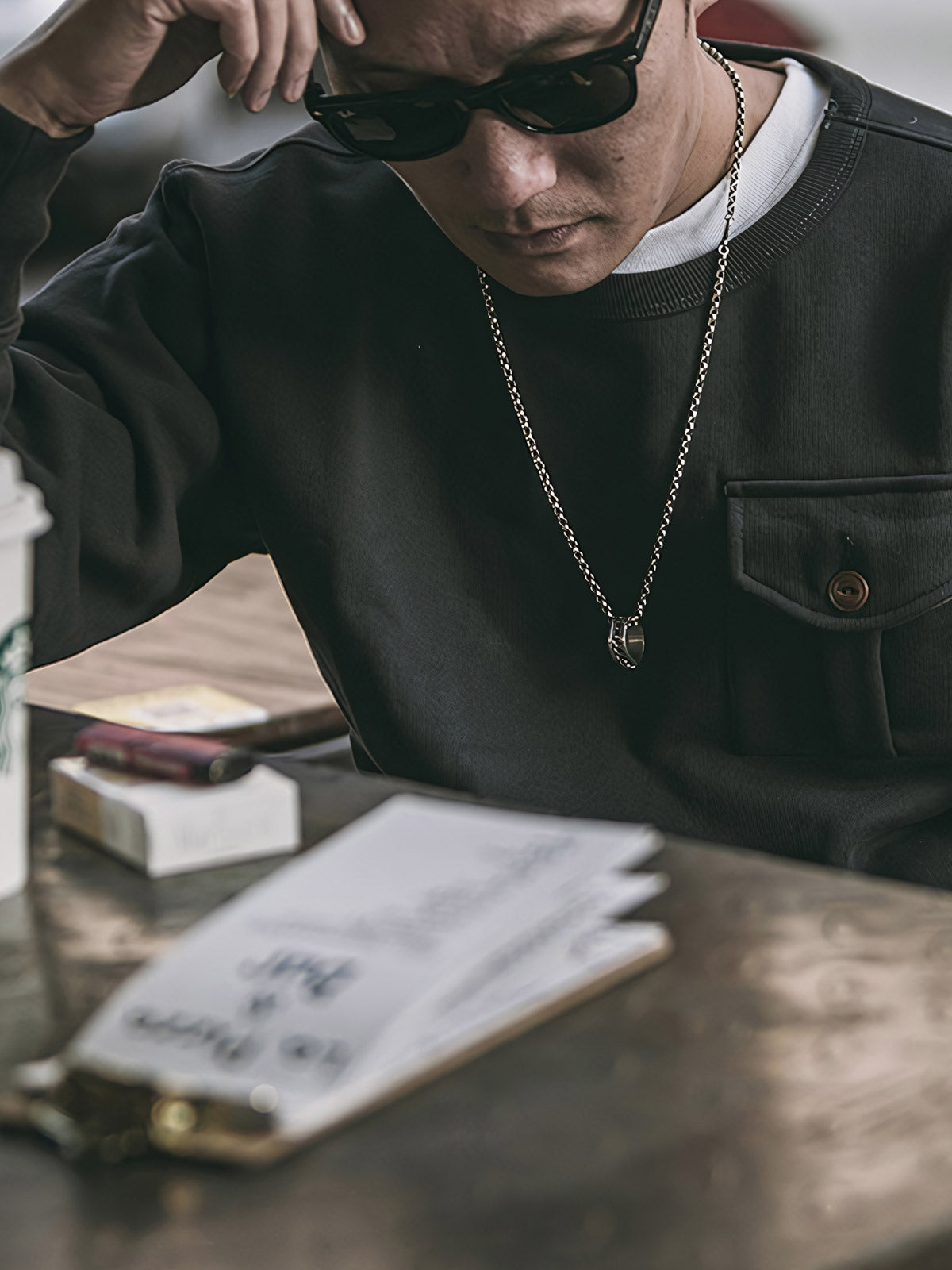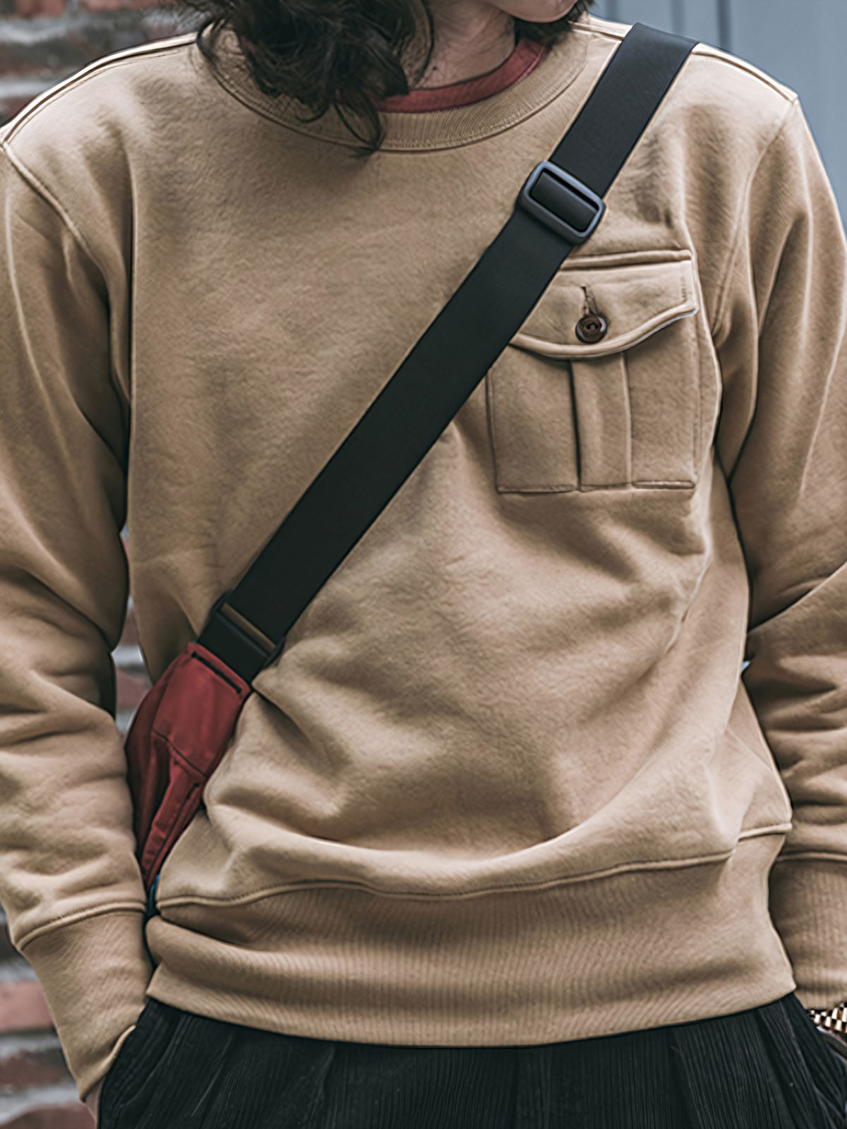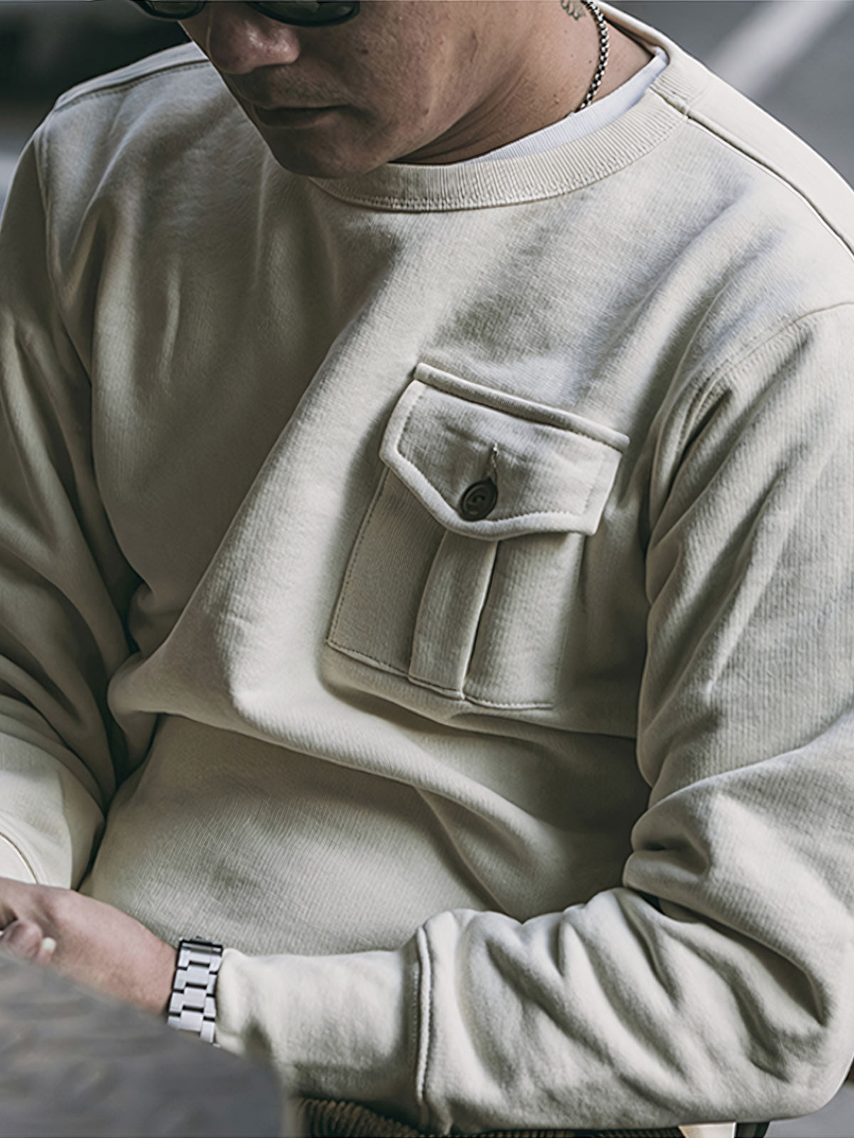 クラシカルなクルーネックスウェットにモダンなタッチを加えたこのアイテムは、機能性とスタイルを兼ね備えています。シンプルながらも特徴的な胸ポケットがアクセントになっており、カジュアルウェアに新しい息吹を吹き込んでいます。