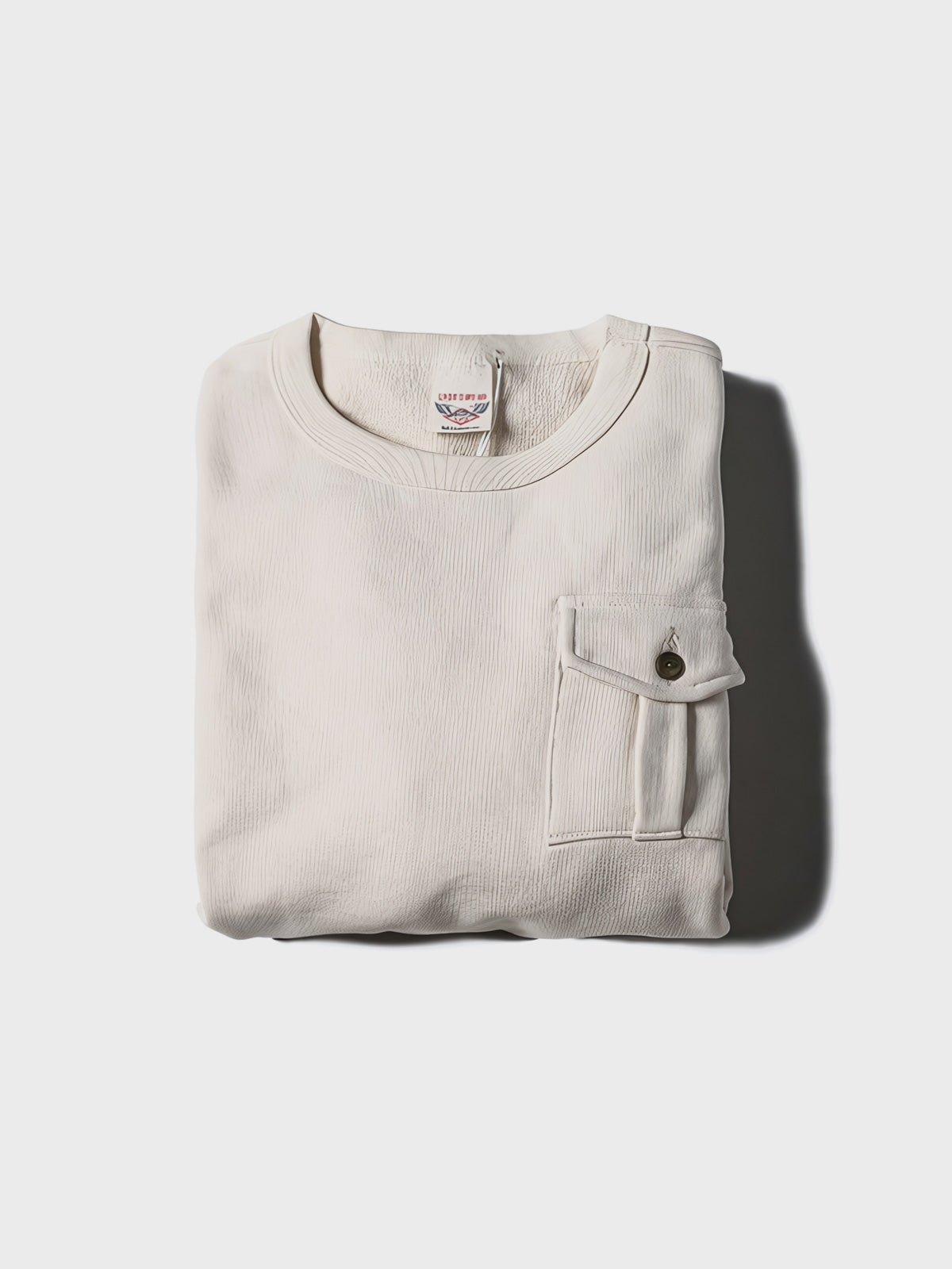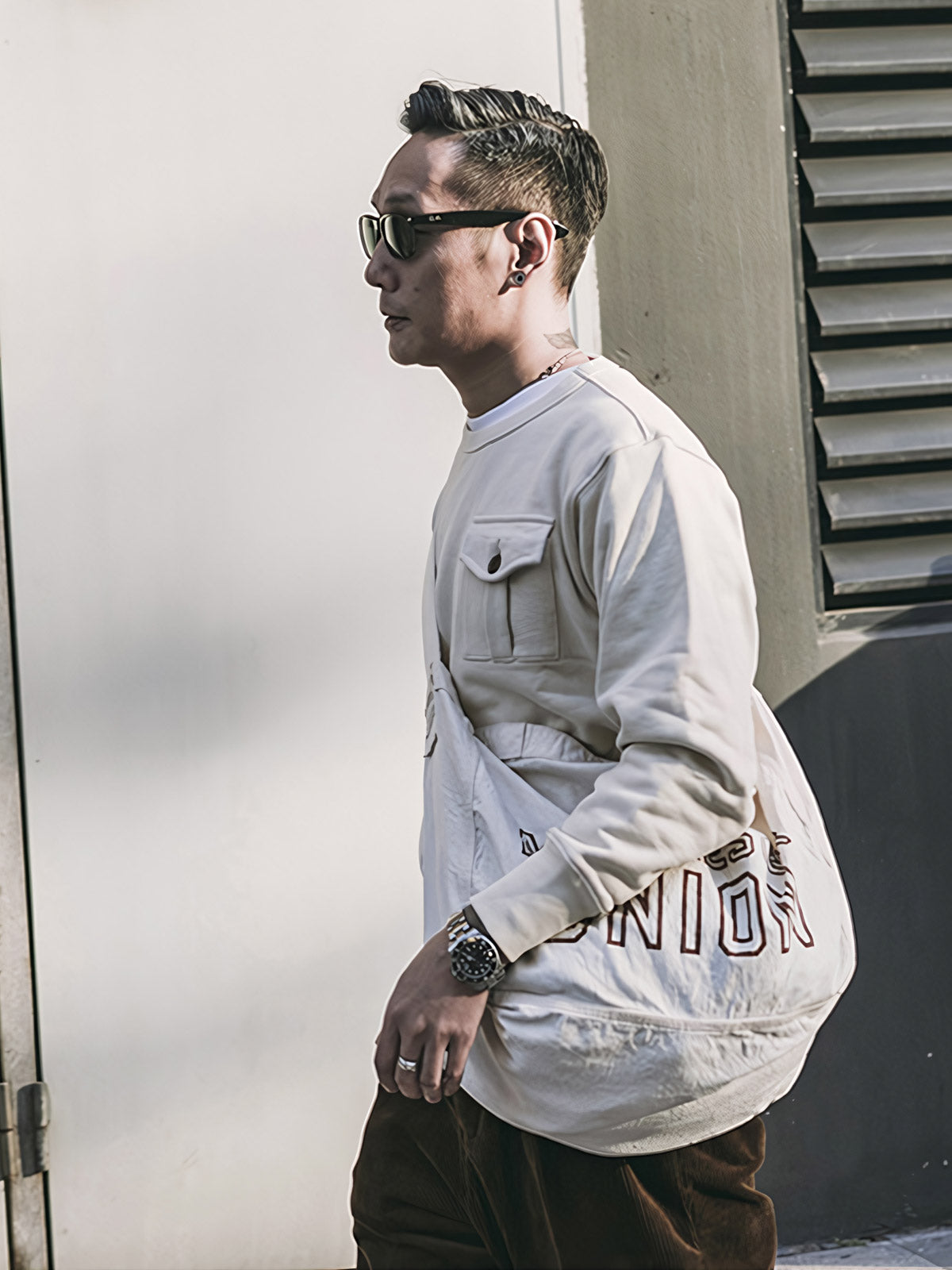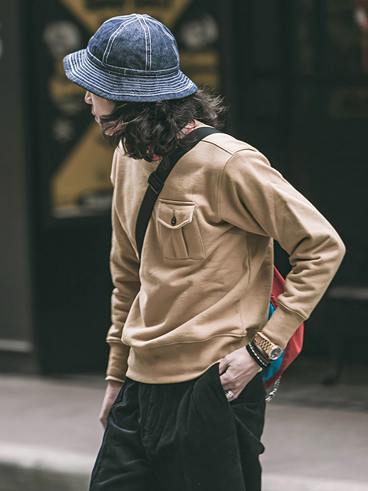 クラシカルなクルーネックスウェットにモダンなタッチを加えたこのアイテムは、機能性とスタイルを兼ね備えています。シンプルながらも特徴的な胸ポケットがアクセントになっており、カジュアルウェアに新しい息吹を吹き込んでいます。