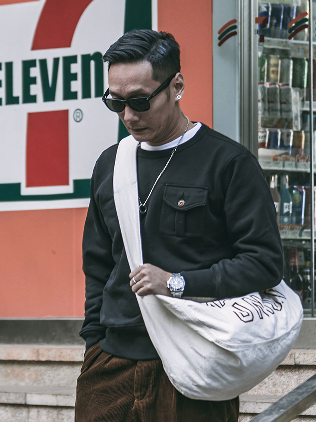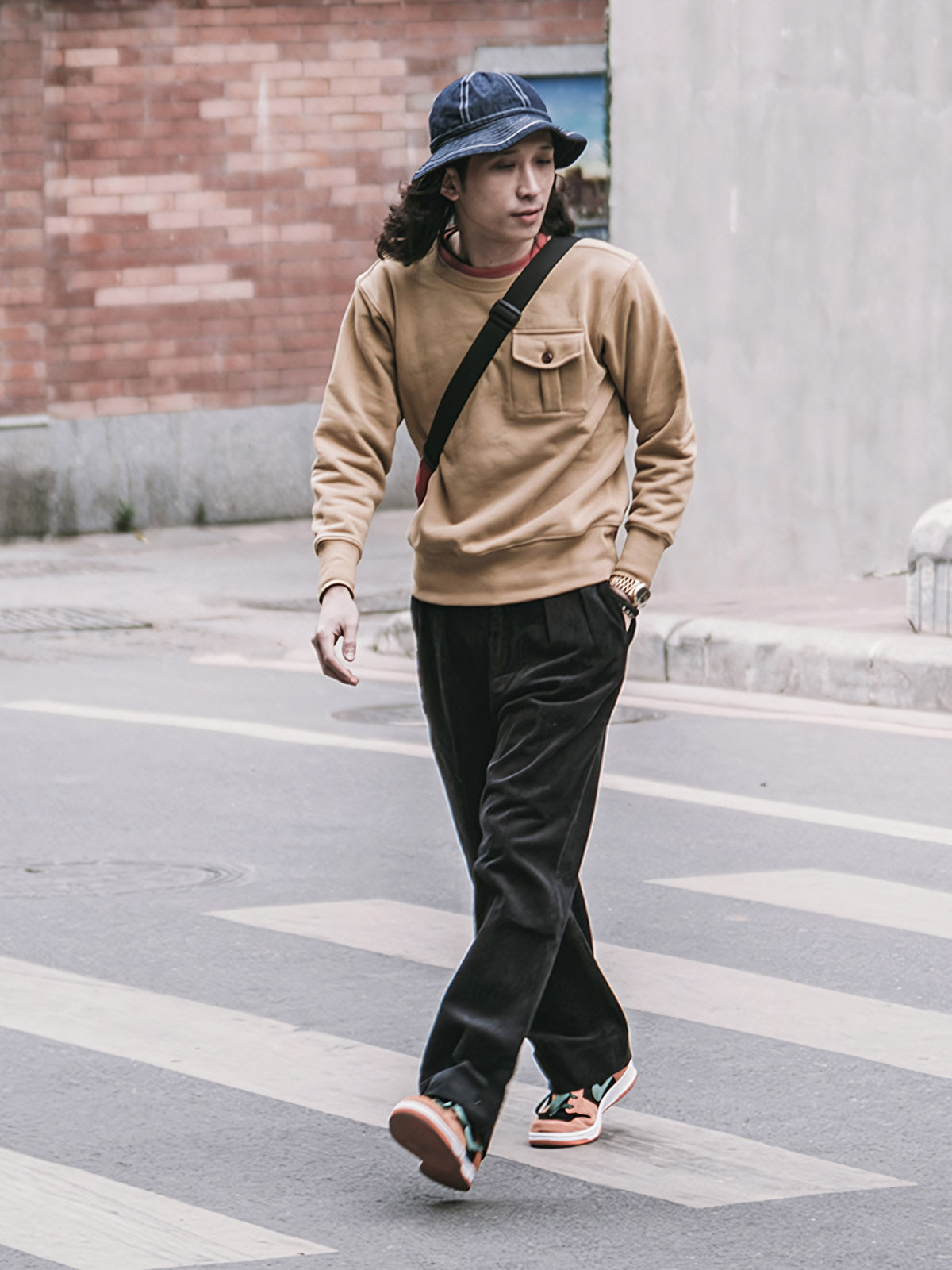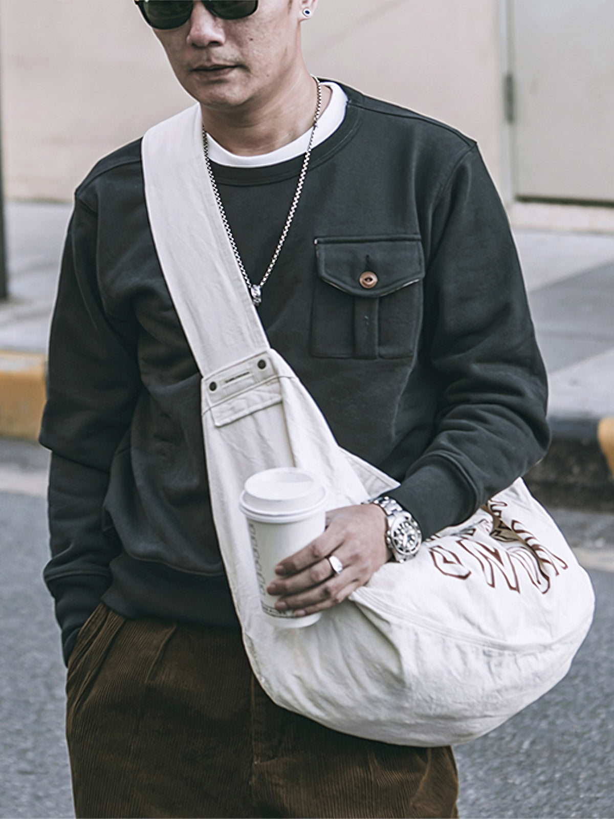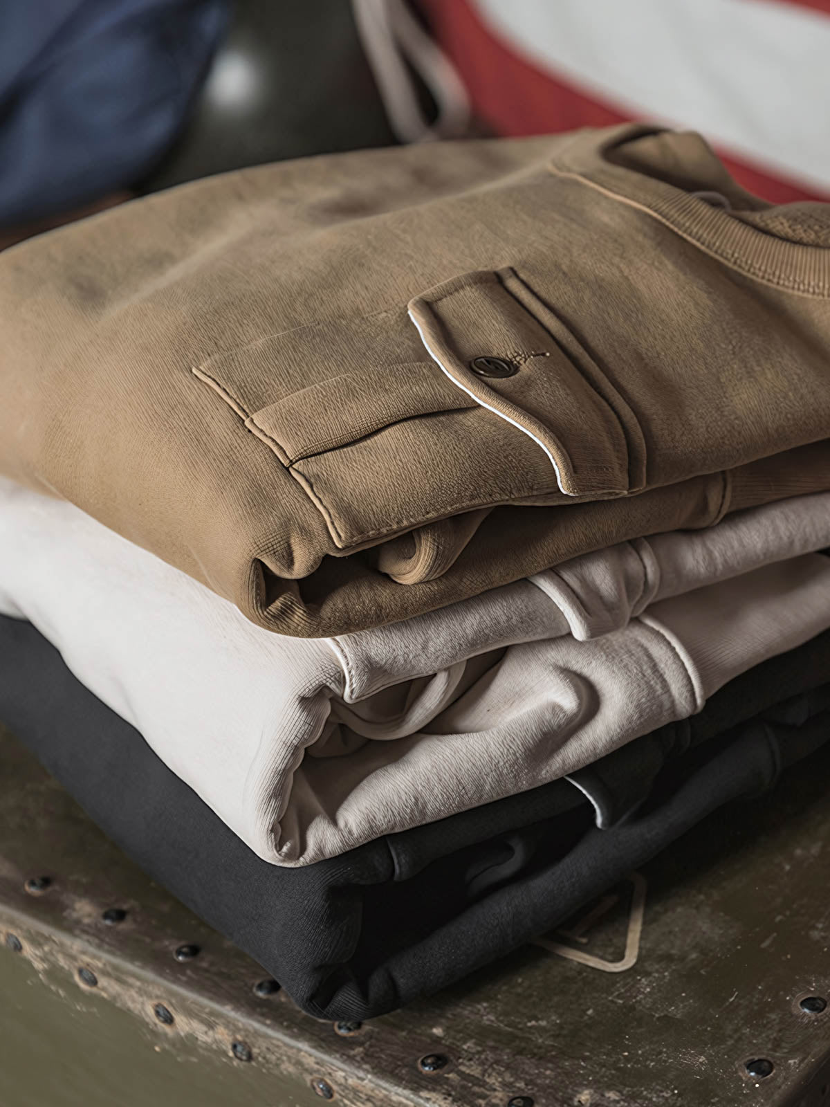 クラシカルなクルーネックスウェットにモダンなタッチを加えたこのアイテムは、機能性とスタイルを兼ね備えています。シンプルながらも特徴的な胸ポケットがアクセントになっており、カジュアルウェアに新しい息吹を吹き込んでいます。