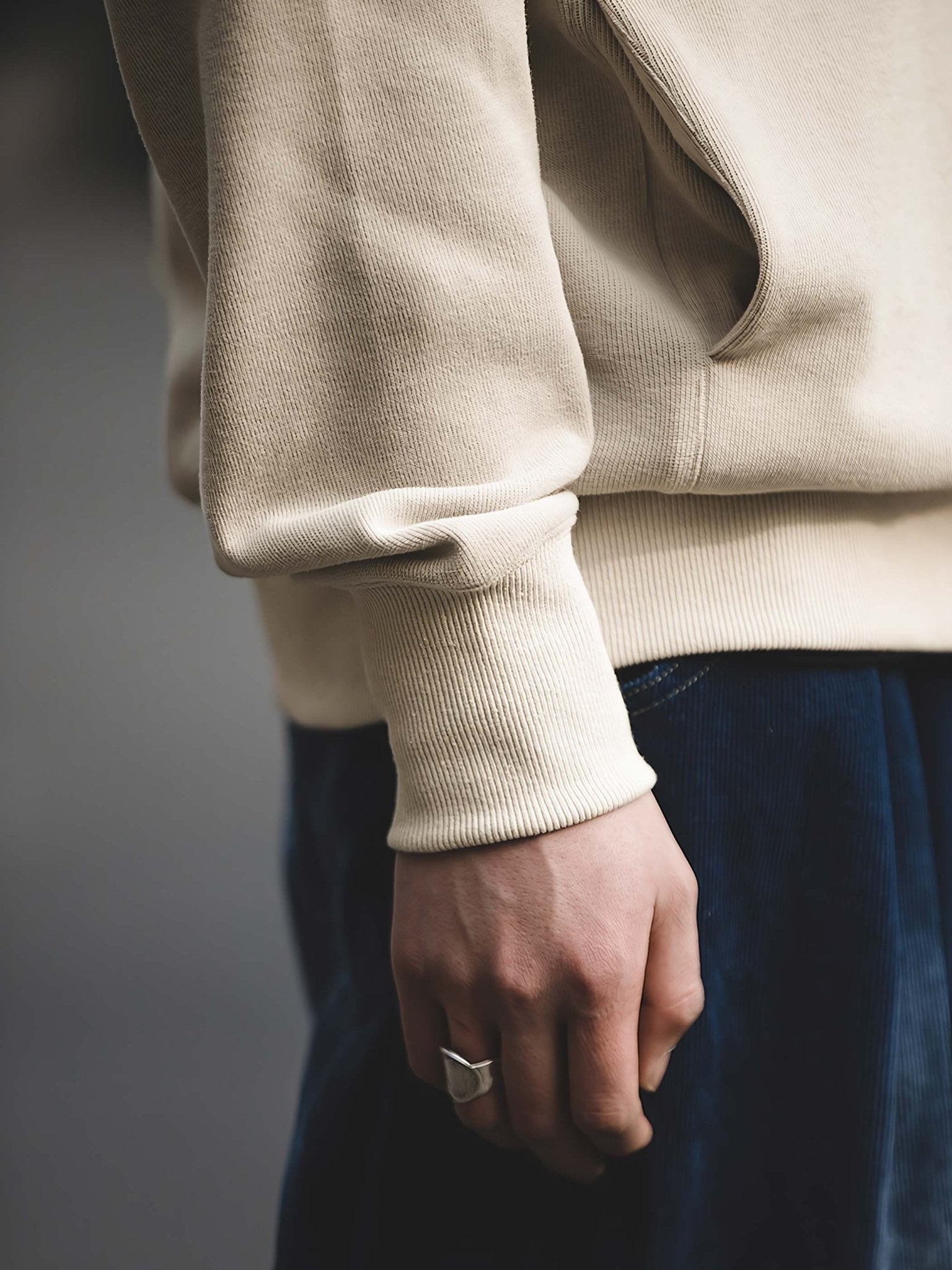 ルーズ過ぎずベーシックに作りこまれたシルエットのため、コートやブルゾンのインナーとしても合わせやすく、秋~冬~春と3シーズンご着用いただける、幅広い季節に対応可能な汎用性の高さも備えたアイテムです。