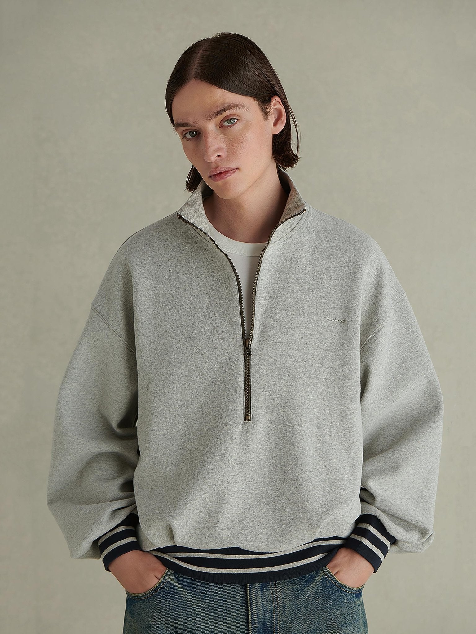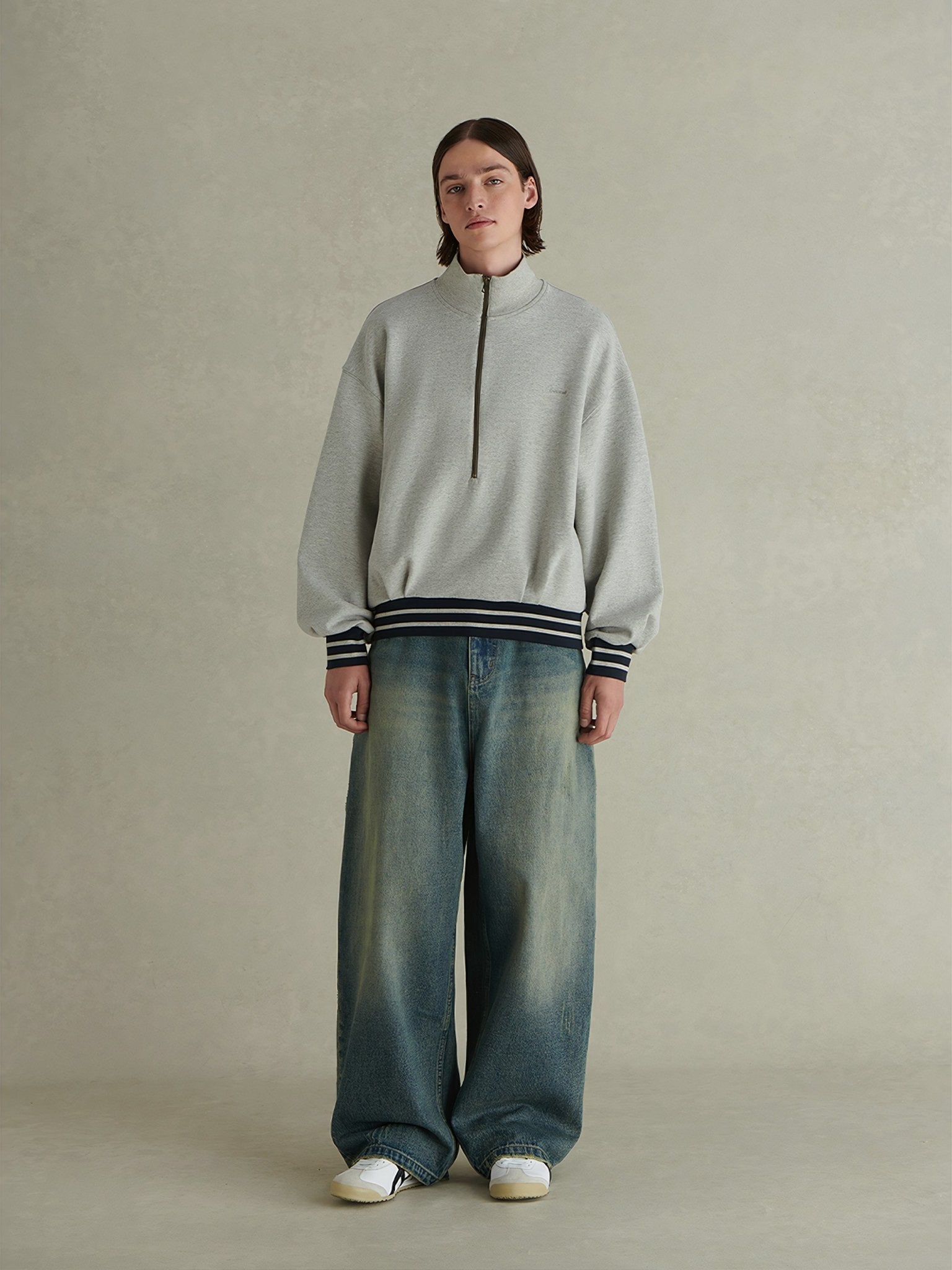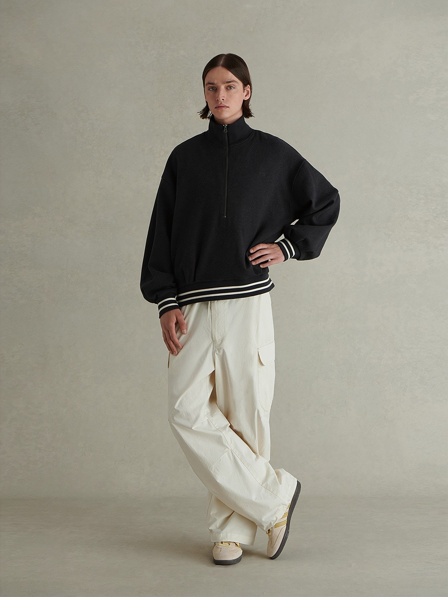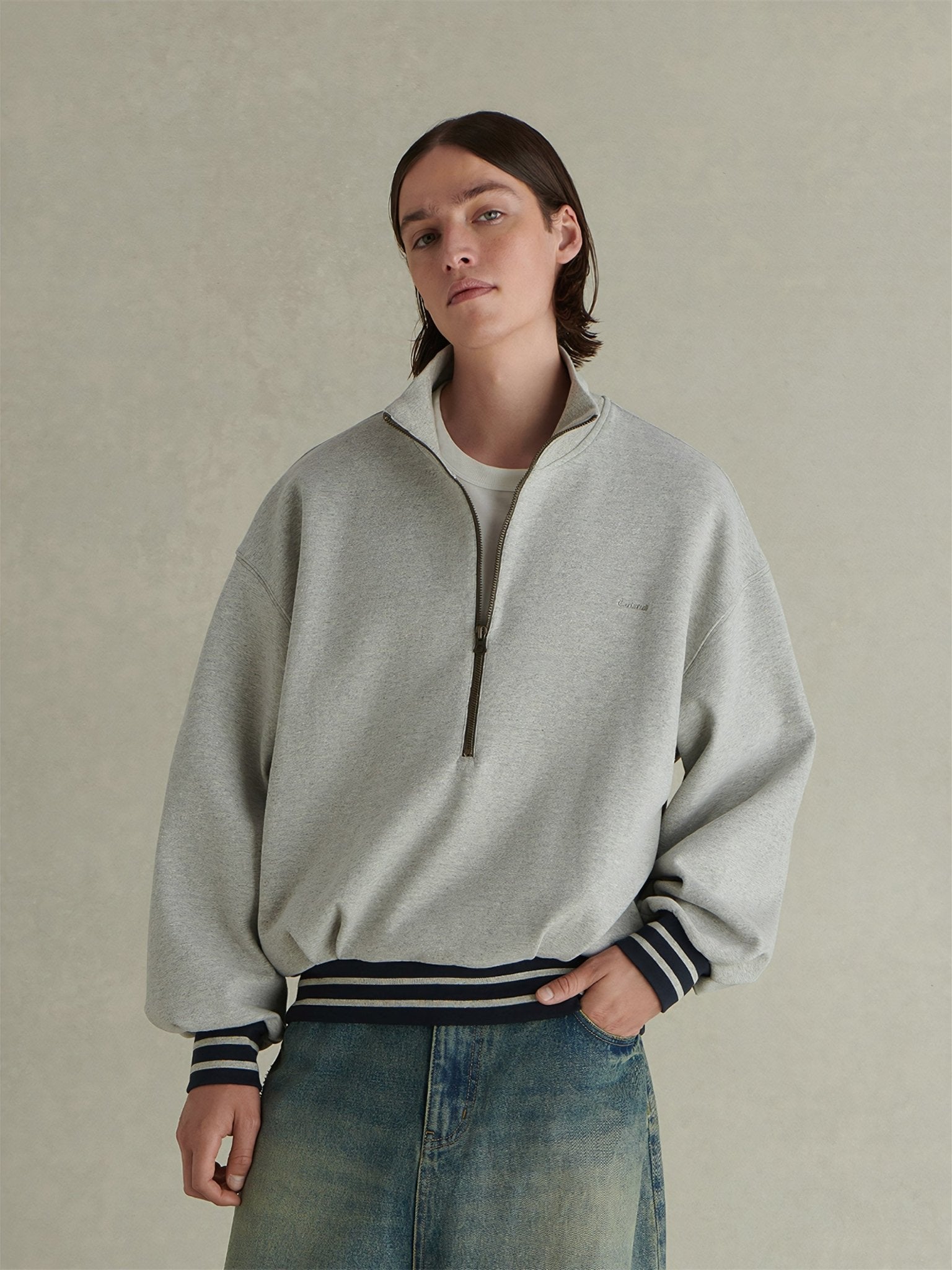 ハーフジップのスタンドカラーはスタイリッシュで、カスタムのIDEAL銅ファスナーが付いています。袖口と裾にはコントラストのあるハイデンシティローンリブを使用し、ジョイント部分には4針2本糸の縫製プロセスが使用されます。