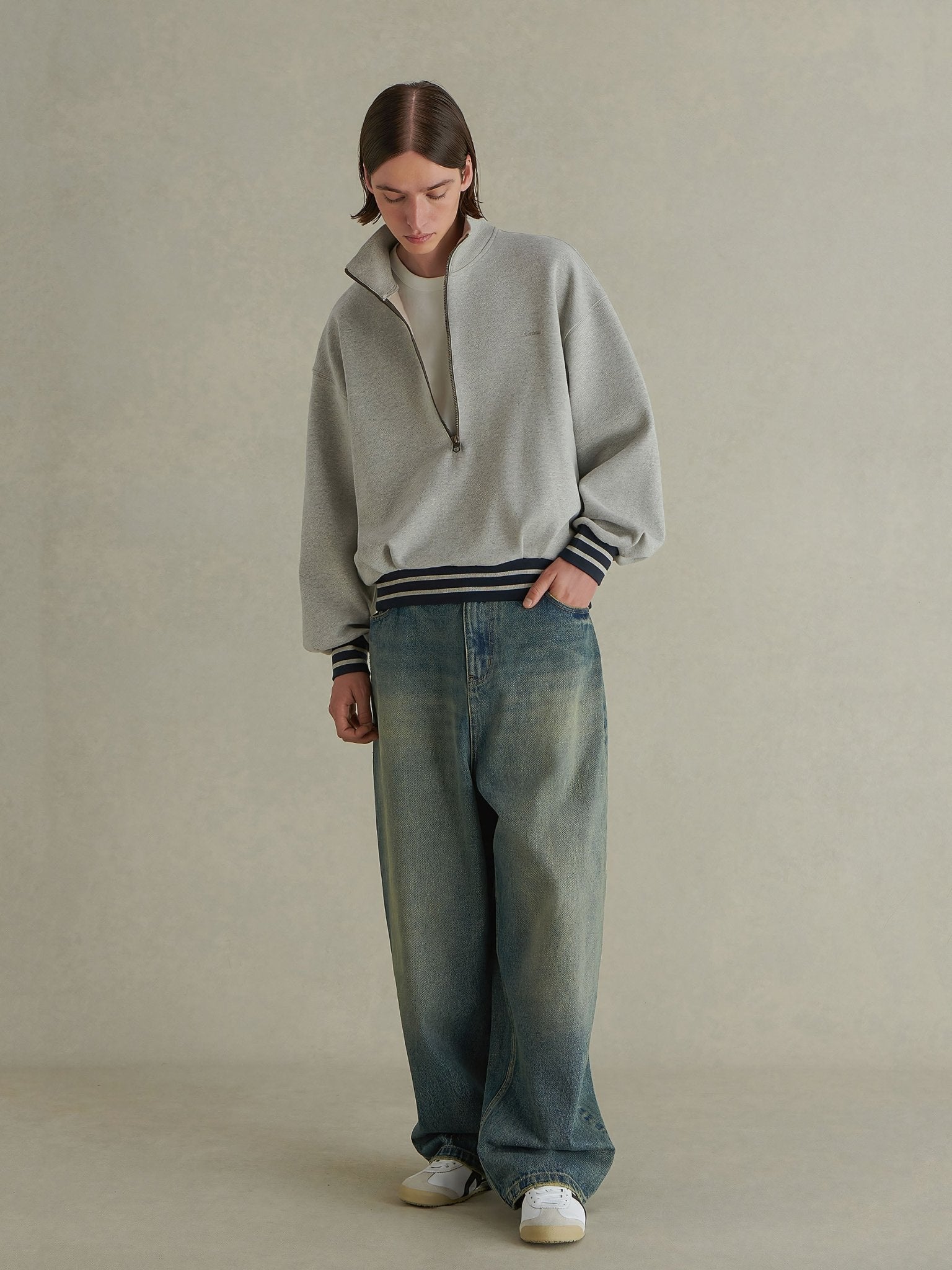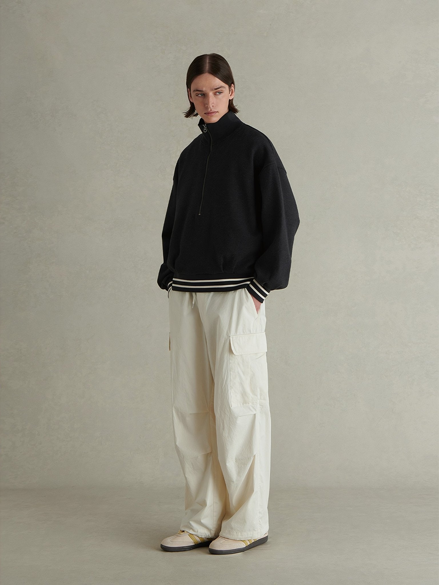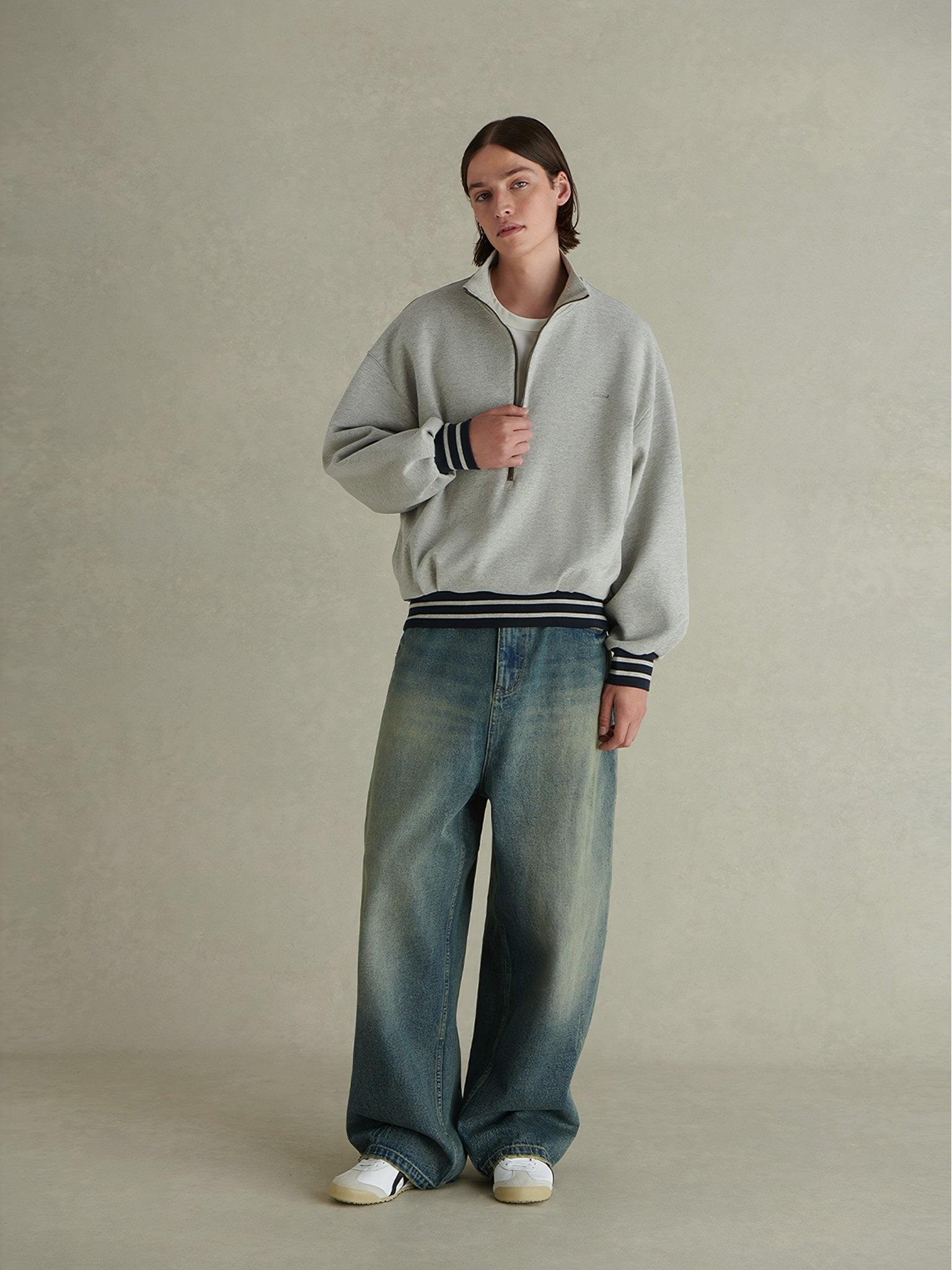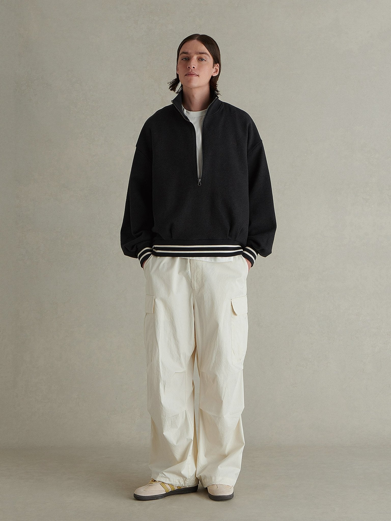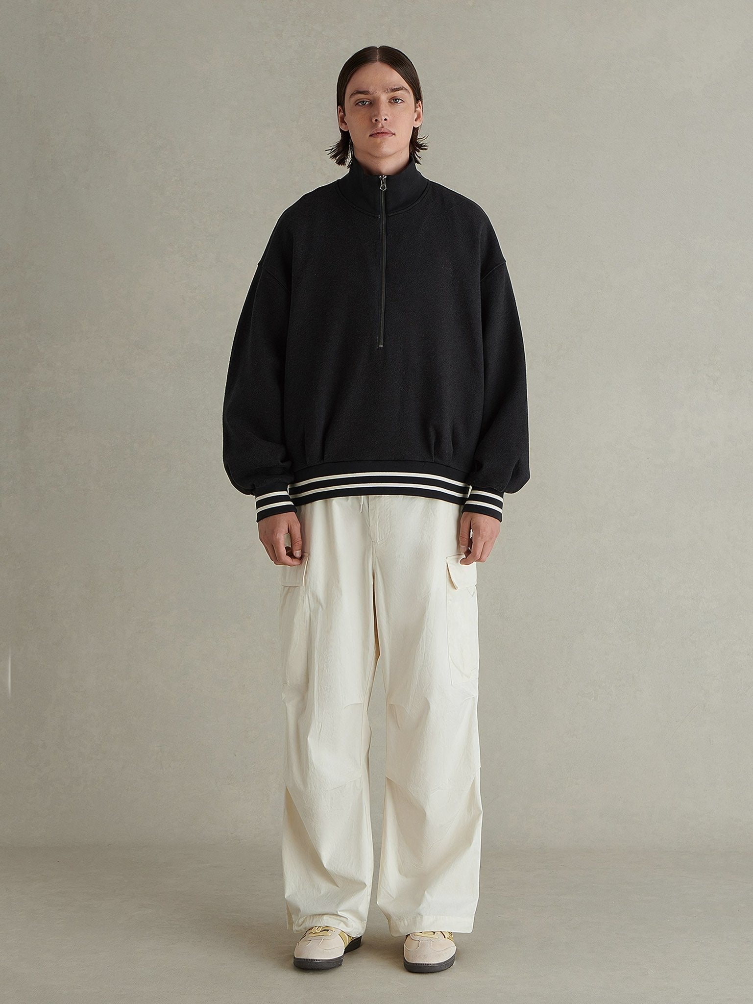 ハーフジップのスタンドカラーはスタイリッシュで、カスタムのIDEAL銅ファスナーが付いています。袖口と裾にはコントラストのあるハイデンシティローンリブを使用し、ジョイント部分には4針2本糸の縫製プロセスが使用されます。