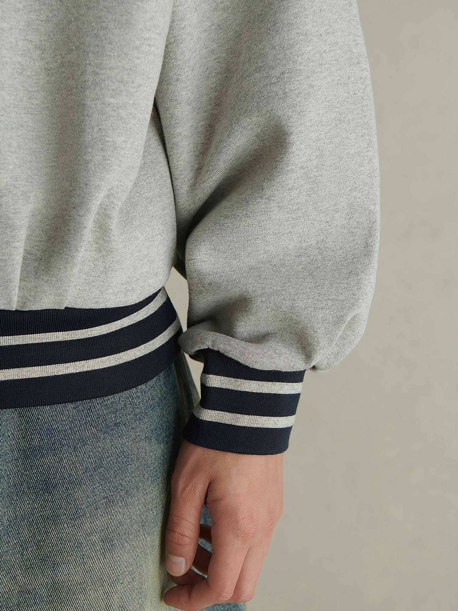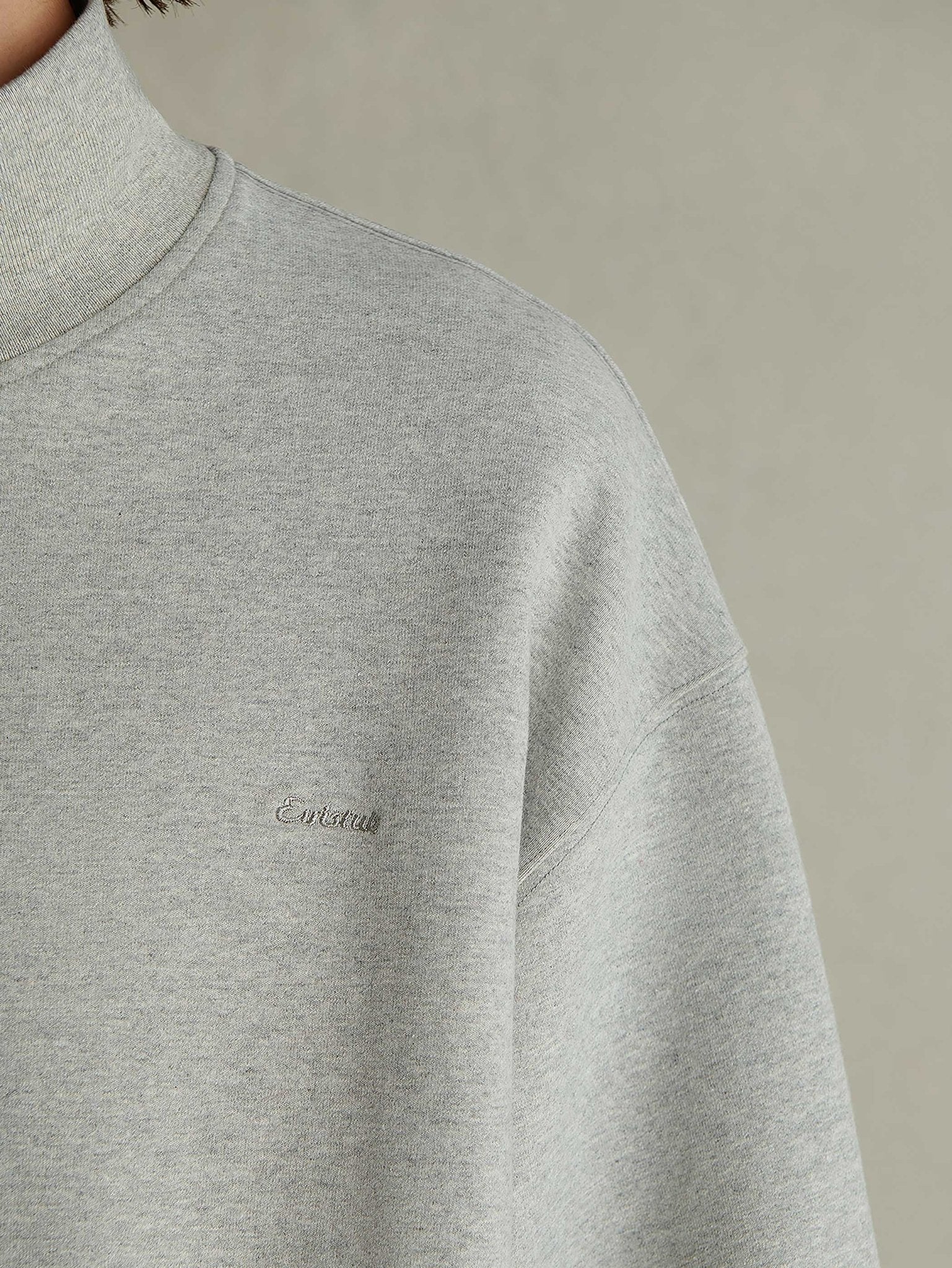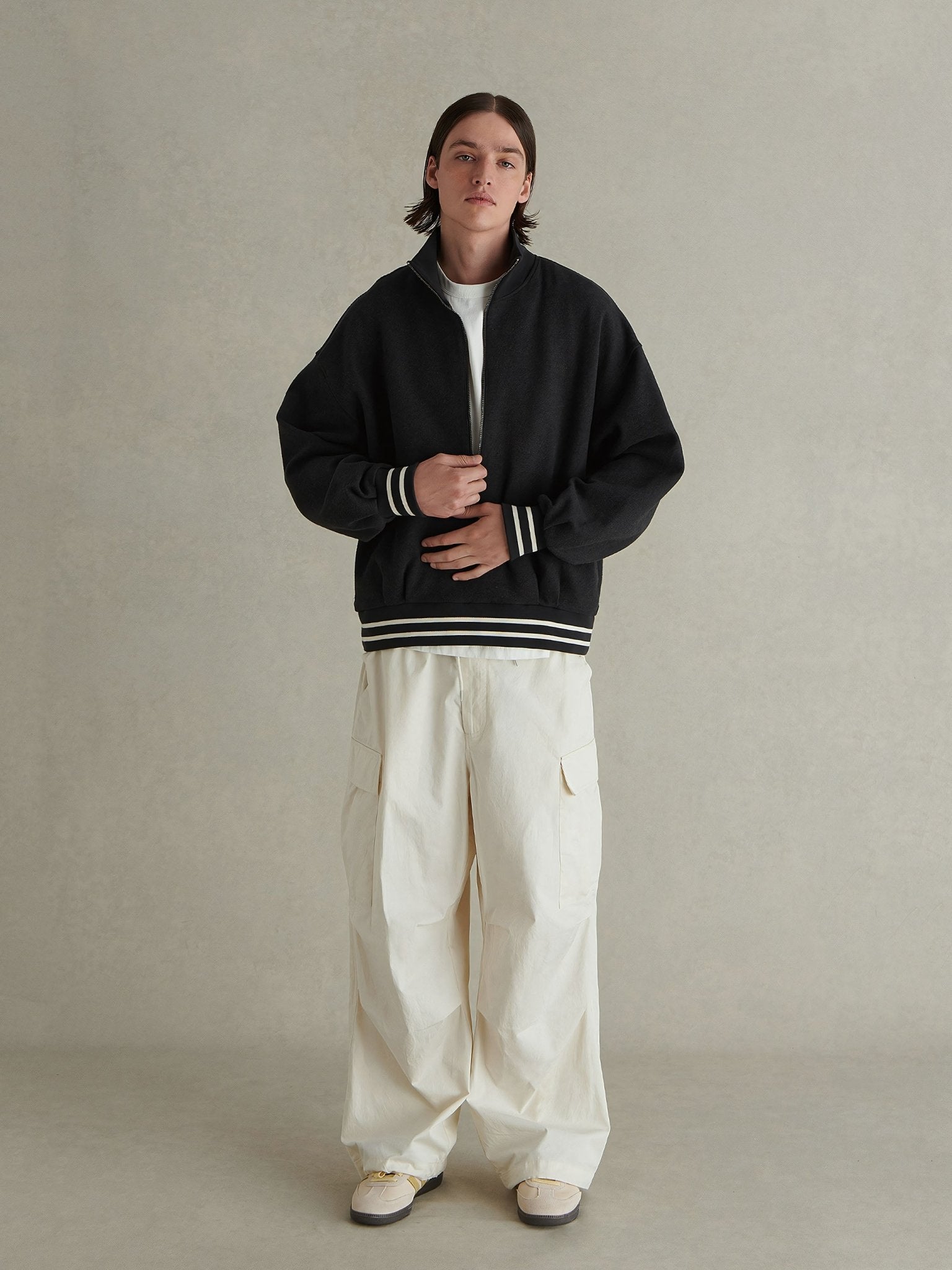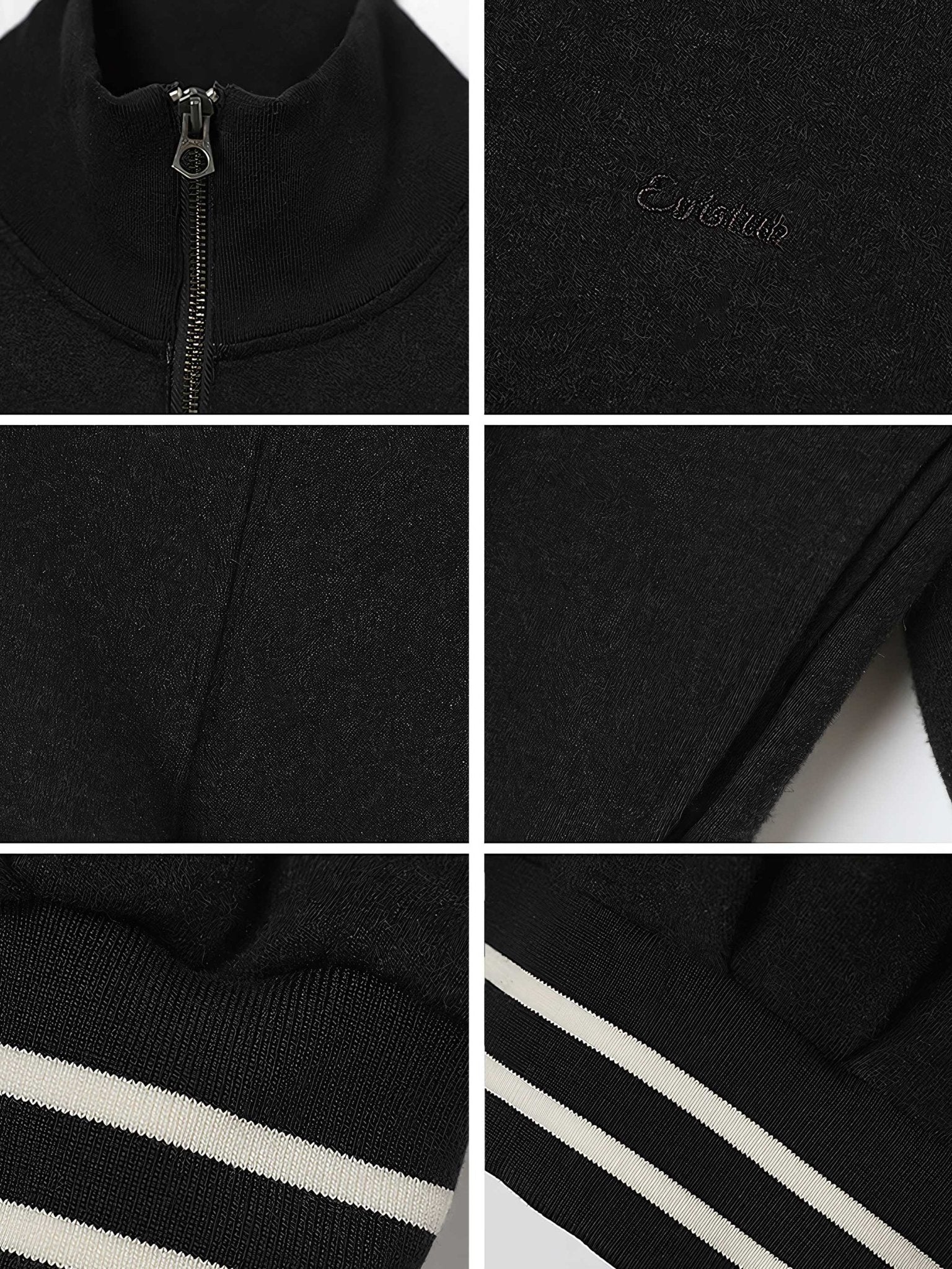 ハーフジップのスタンドカラーはスタイリッシュで、カスタムのIDEAL銅ファスナーが付いています。袖口と裾にはコントラストのあるハイデンシティローンリブを使用し、ジョイント部分には4針2本糸の縫製プロセスが使用されます。