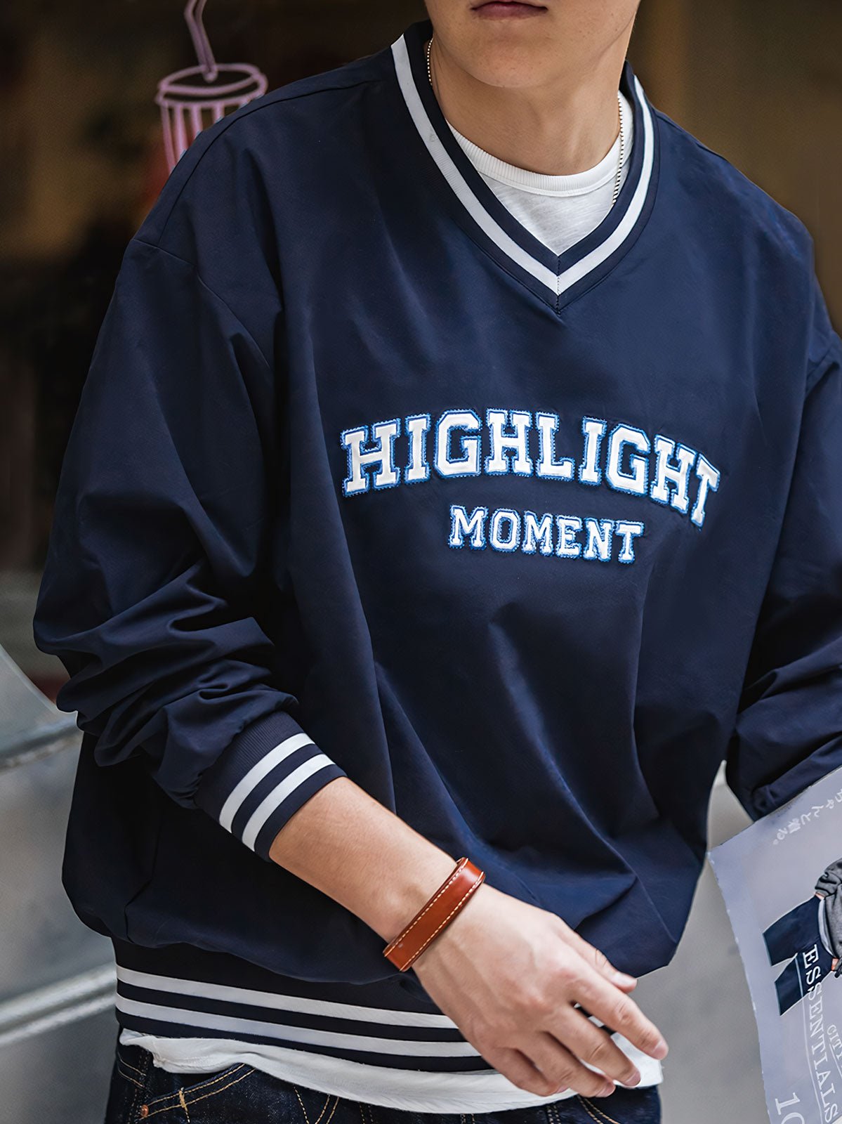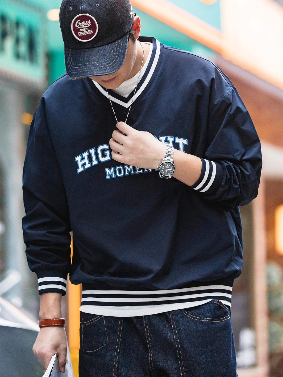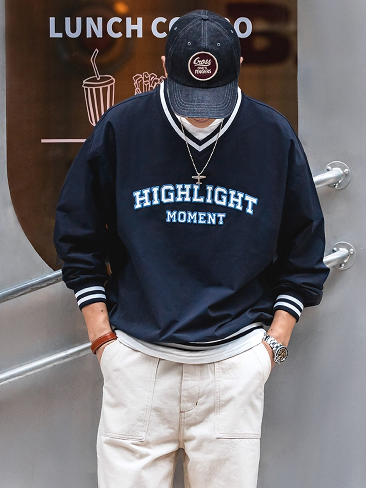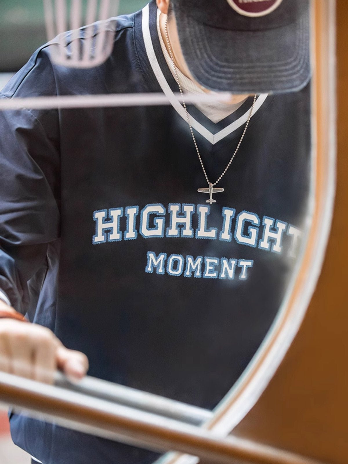20世紀初頭から現代にかけて、アイビースタイルは常に優雅さと学問の伝統の象徴でした。スウェットに刺繍された「HIGHLIGHT MOMENT」という言葉と伝統的なフォントデザインは、その時代の学術的成就とスポーツ競技精神への重視を反映しています。刺繍の技術は視覚効果を高めるとともに、伝統的な手工芸への敬意と継承を示しています。