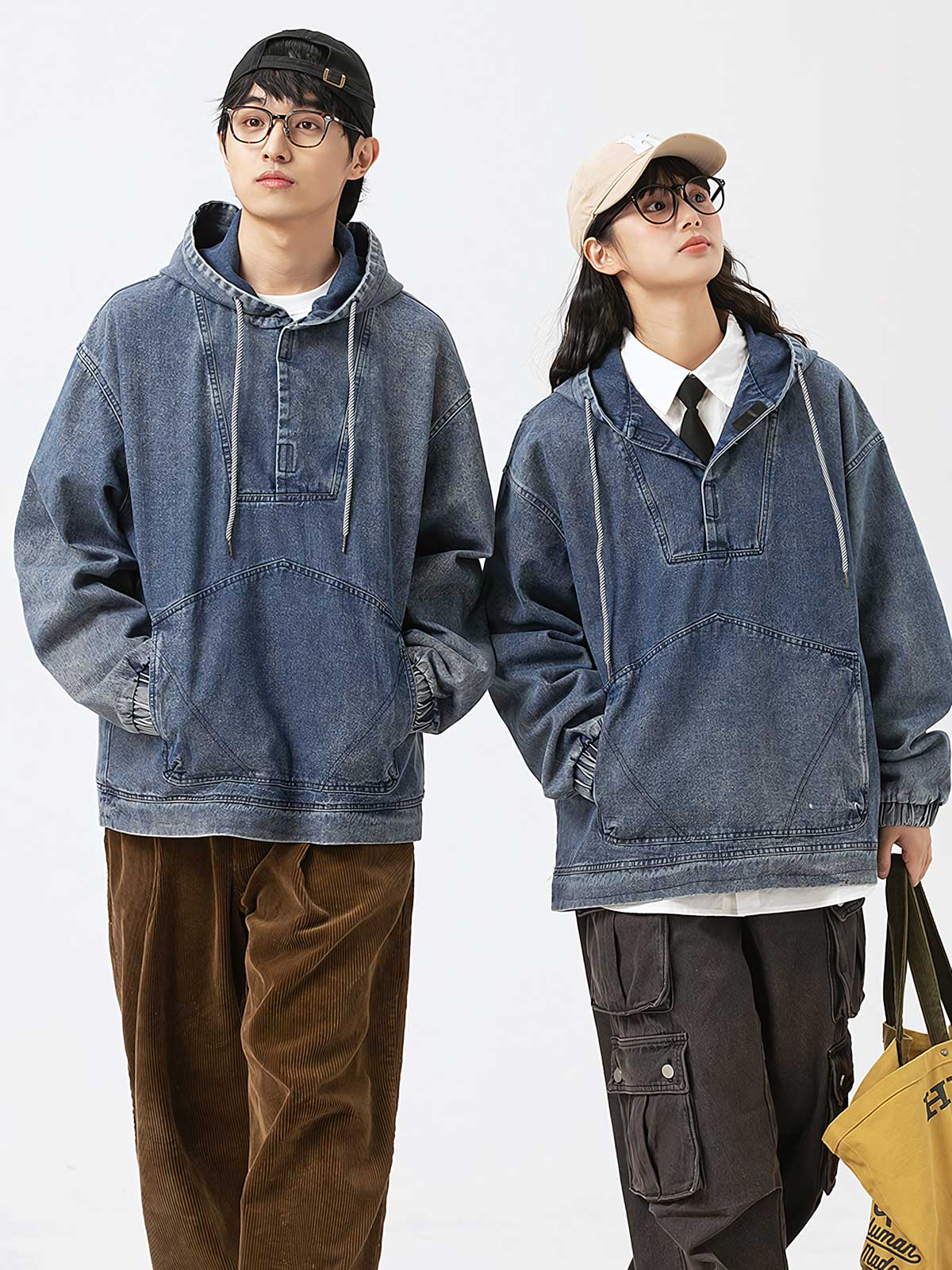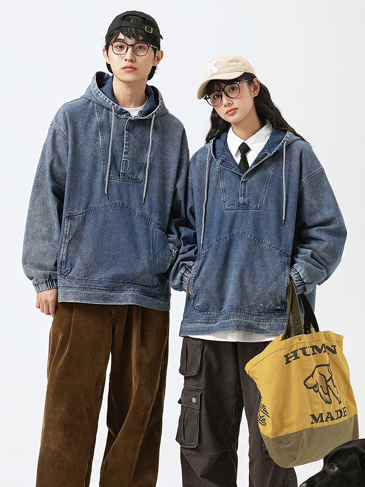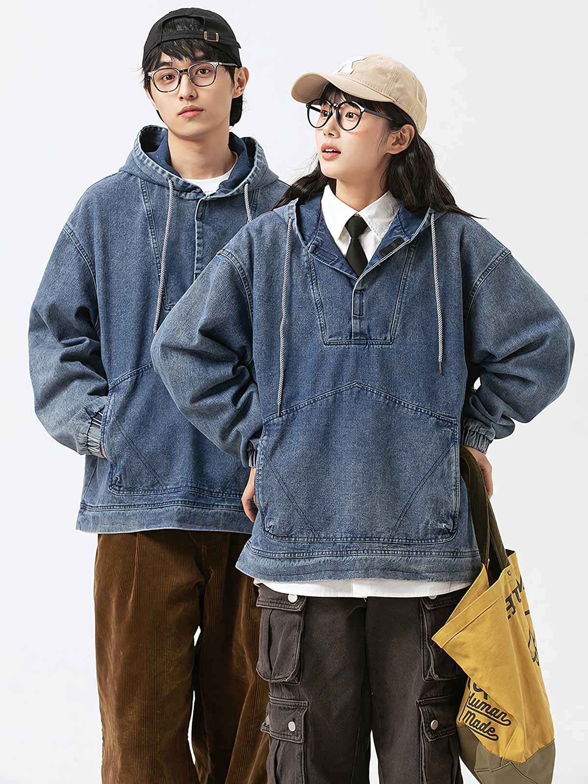 このスウェットはブルーを基調とし、デニムの粗野な質感を保持しつつ、都会的なカジュアルなファッションセンスを表現しています。内側には柔らかい裏地が付いており、保温性を高めています。フード付きのデザインは、変わりやすい屋外の気候に対応し、秋冬の理想的な選択肢となっています。