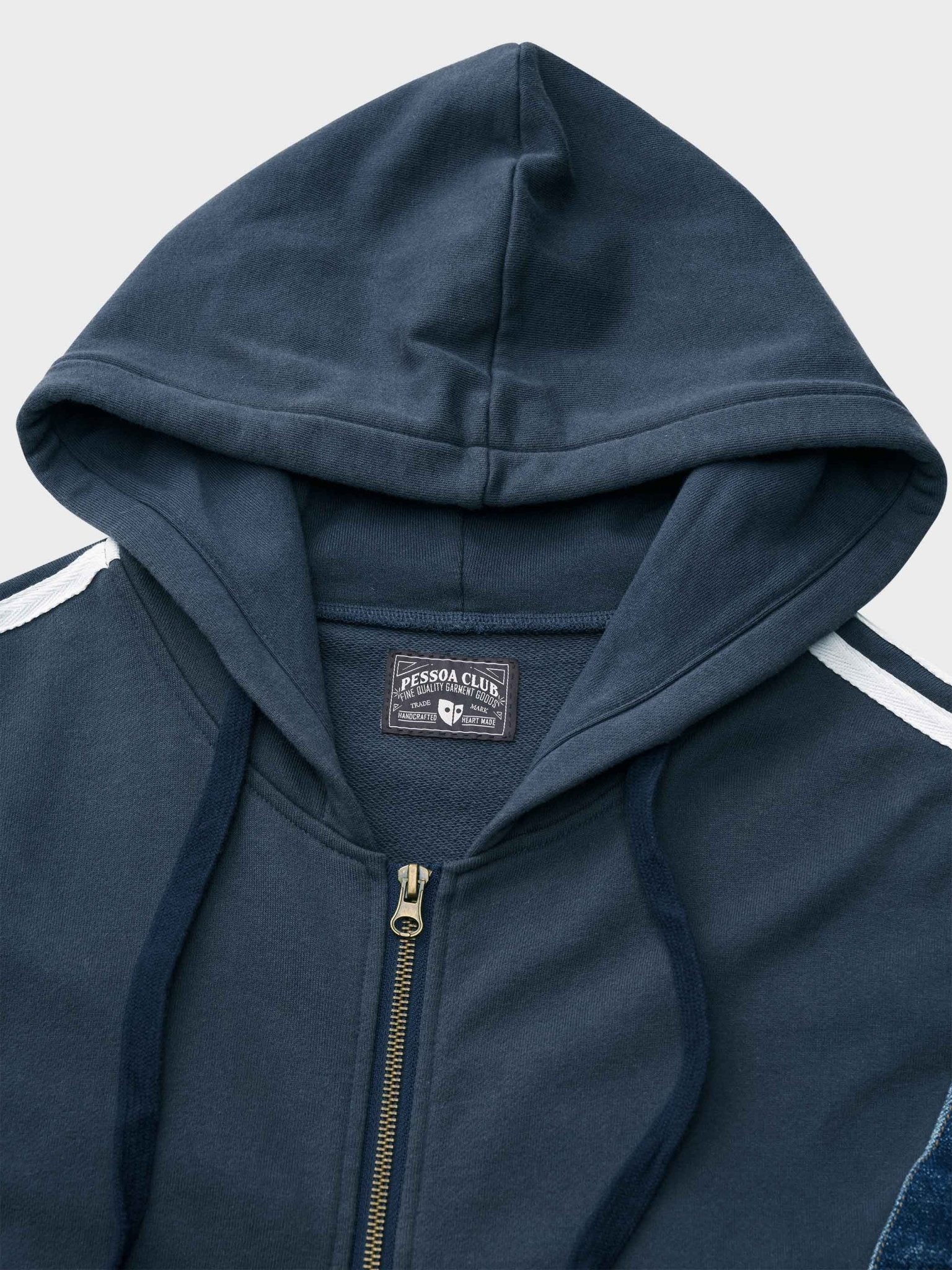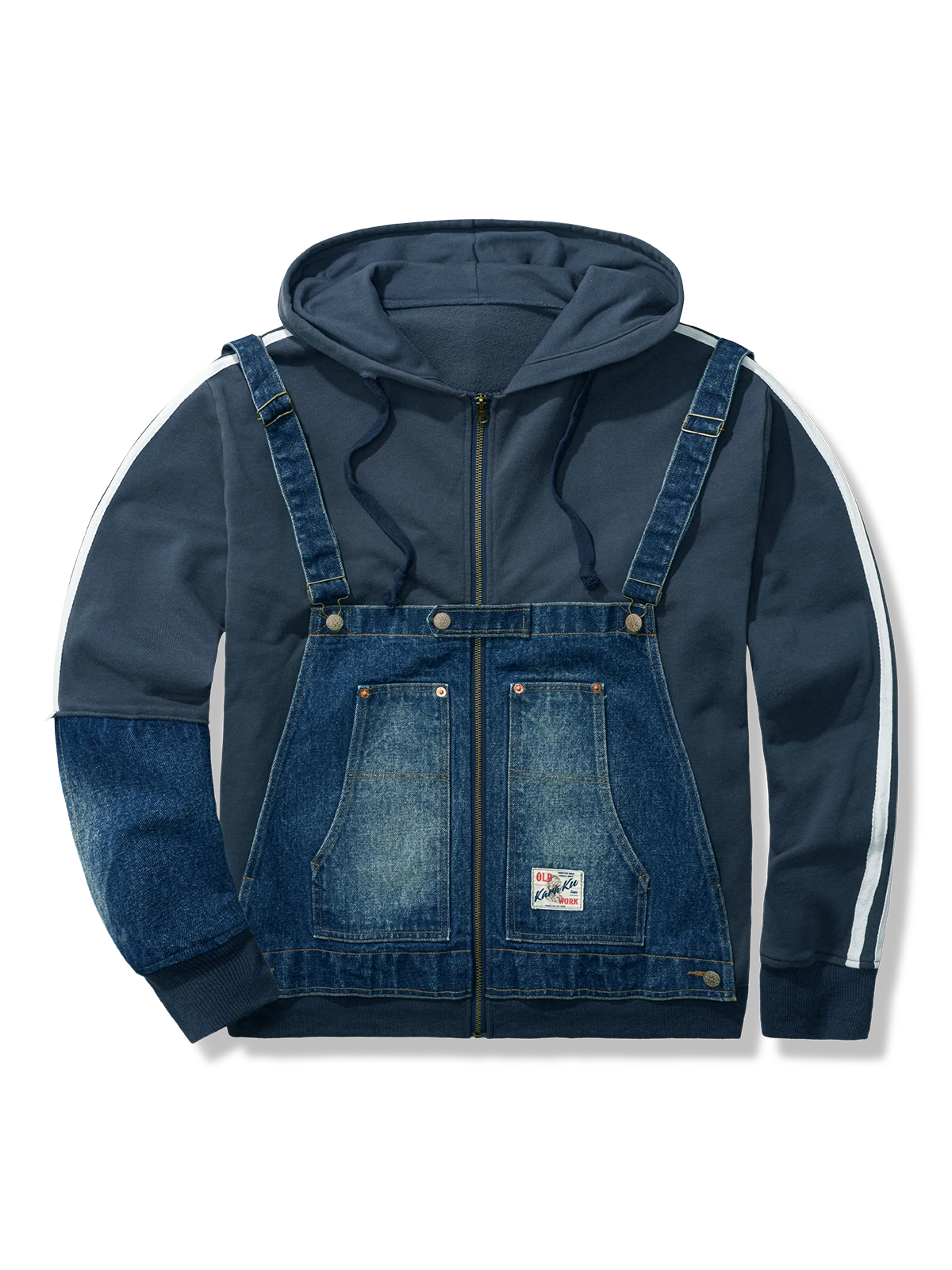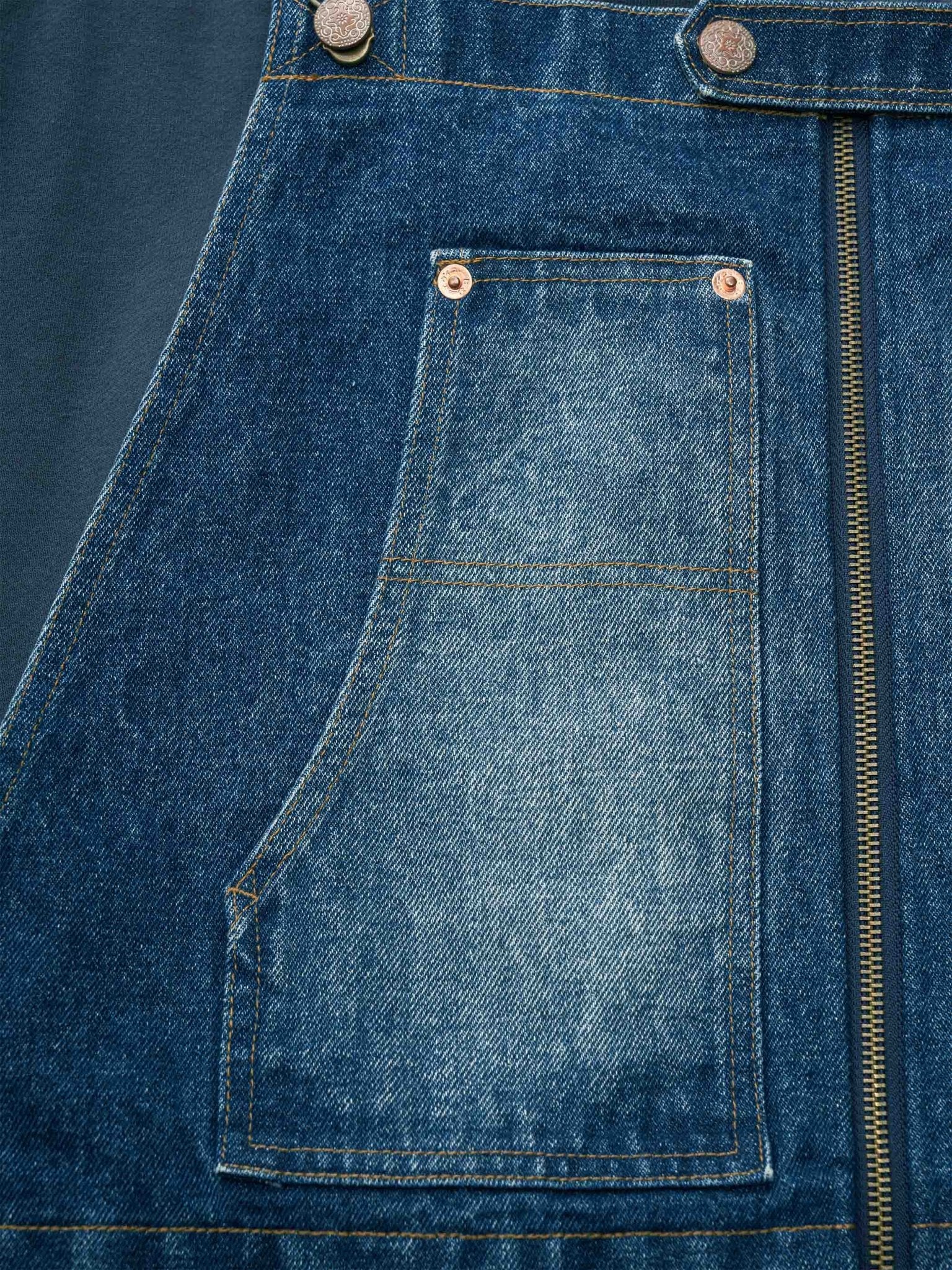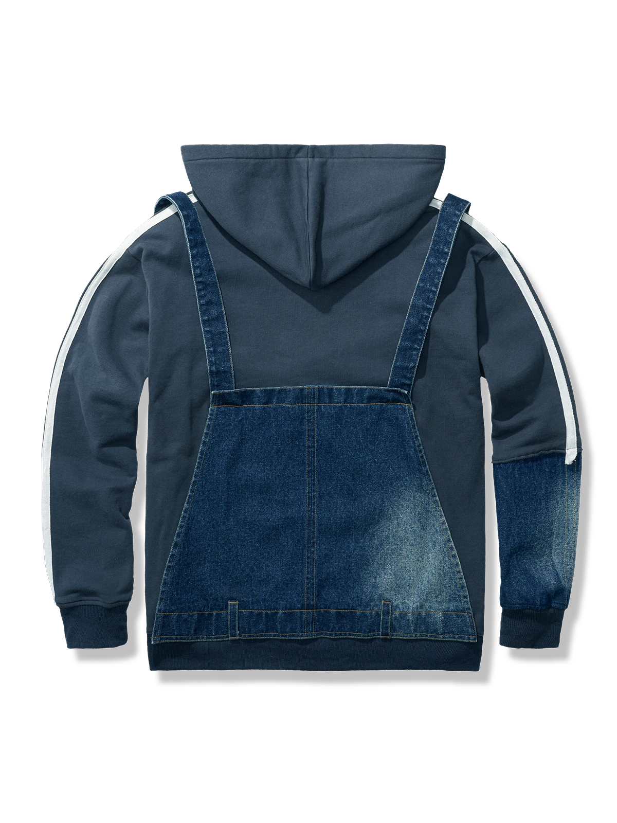 パーカーとデニムステッチを完璧に合わせ、サスペンダー付きでスペシャル感を演出しています。フロントには大容量のカンガルーポケットとオリジナルのファスナーが付いており、サスペンダーのボタンは装飾用です。また、左袖のデニム切替がテックならではの雰囲気を醸し出しています。