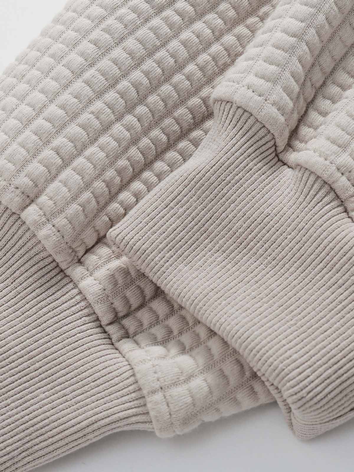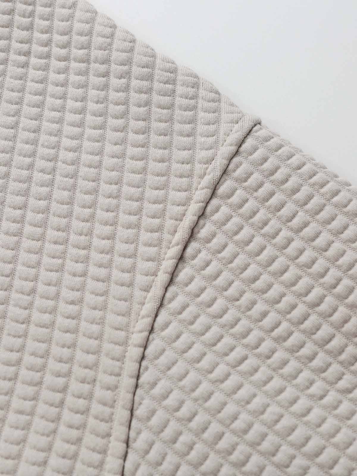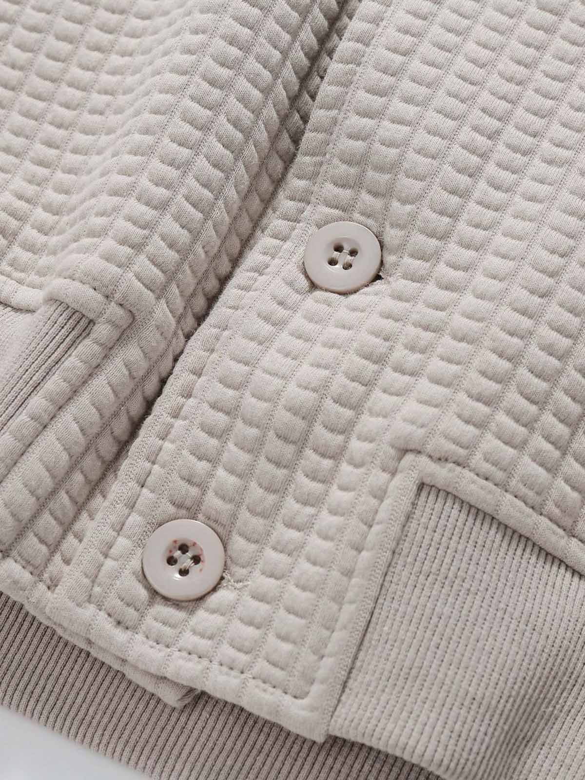 本ジャケットは、クラシックなアメリカンスポーツウェアにインスパイアされたデザインで、ゆったりとしたシルエットを採用しています。ワッフルチェックの立体織り加工により、優れた保温性と通気性を実現。前面はスナップボタン仕様で、実用性と装飾性を両立し、適切な位置に配置されたポケットが日常の収納力を向上させます。さらに、シンプルながら層のあるデザインは、単体でもレイヤードでも多彩なスタイルを楽しめる点が魅力です。これにより、ヴィンテージスポーツウェアの味わいと、現代的な都会カジュアルスタイルを絶妙に融合させています。