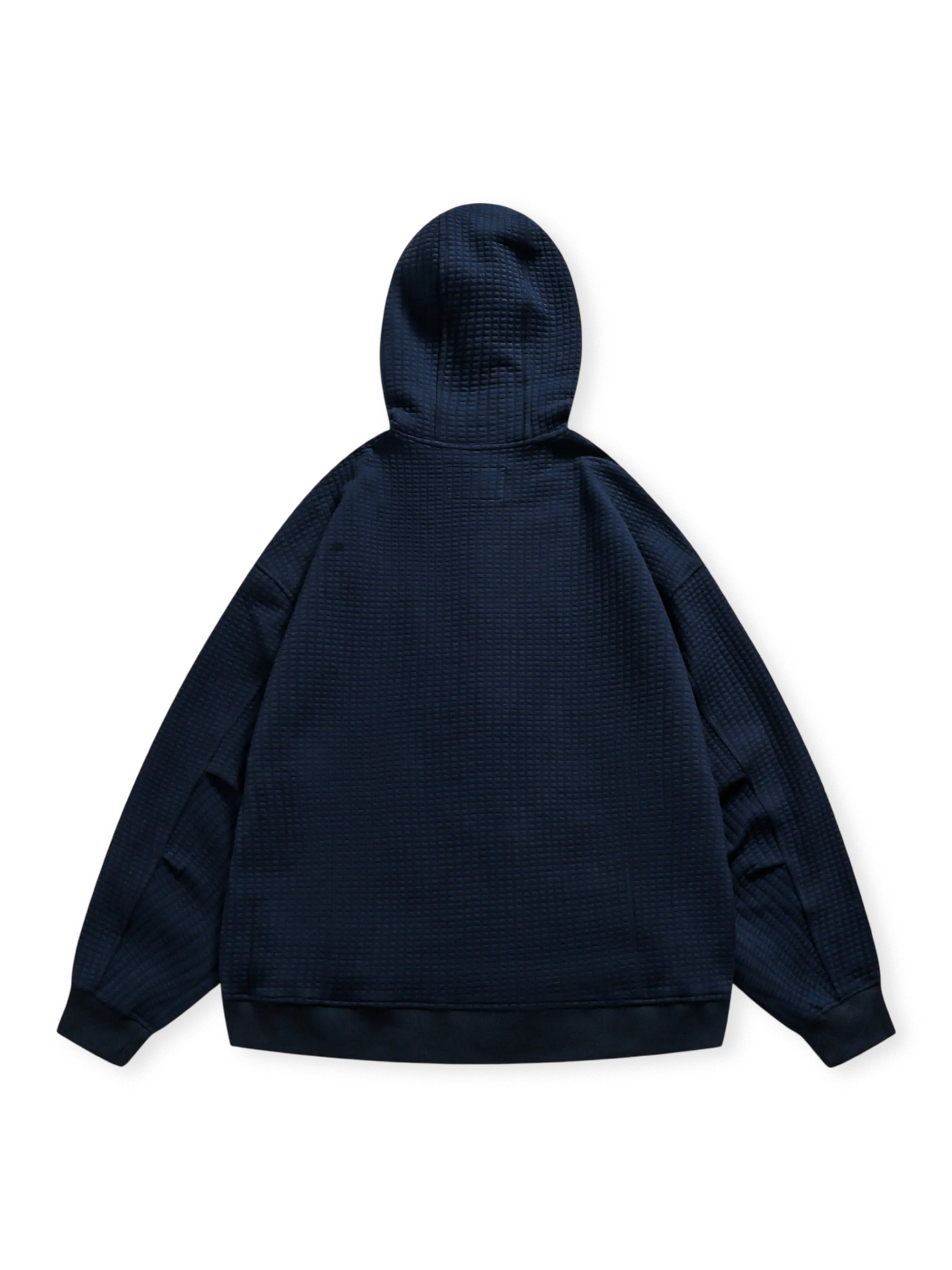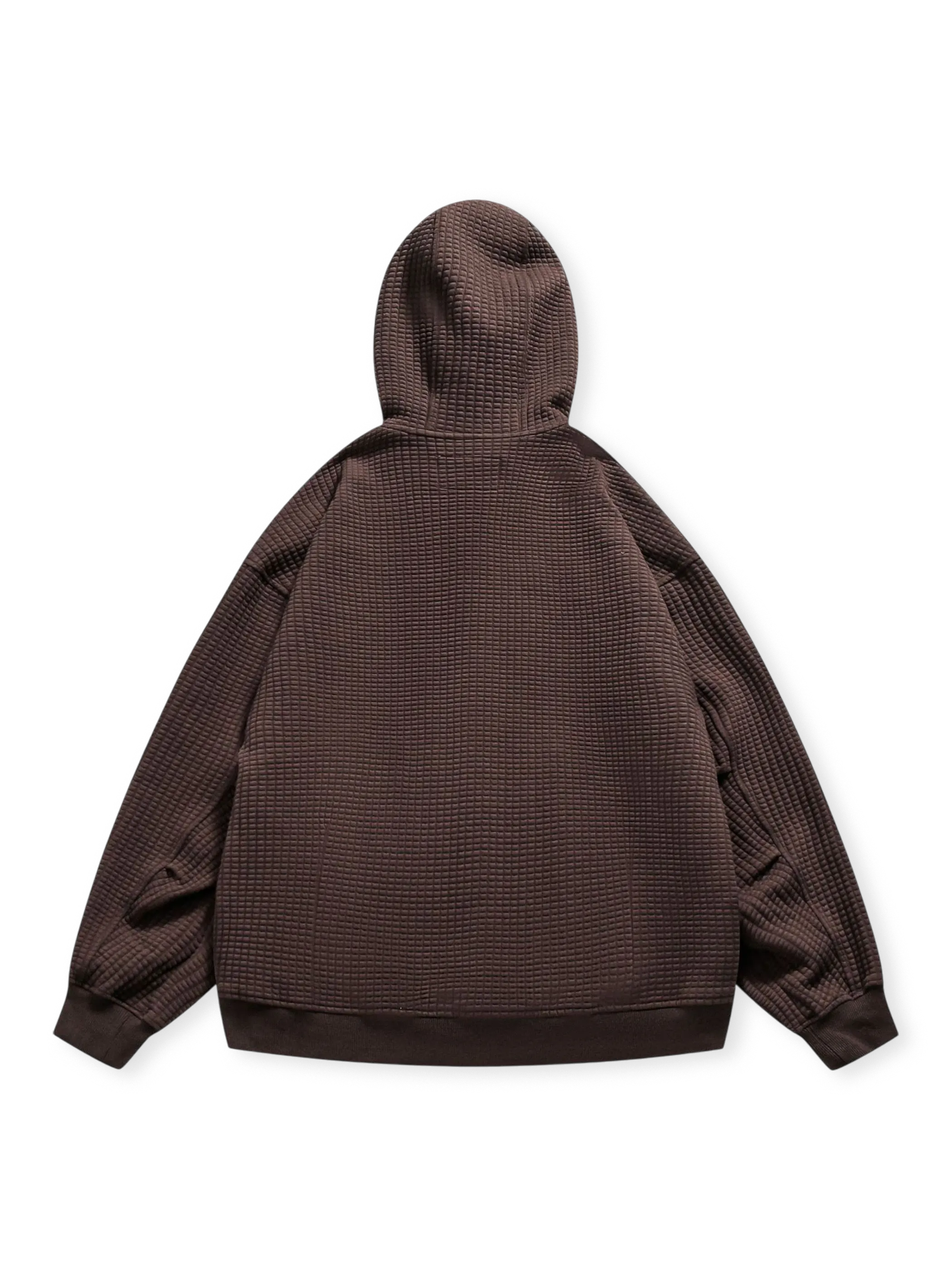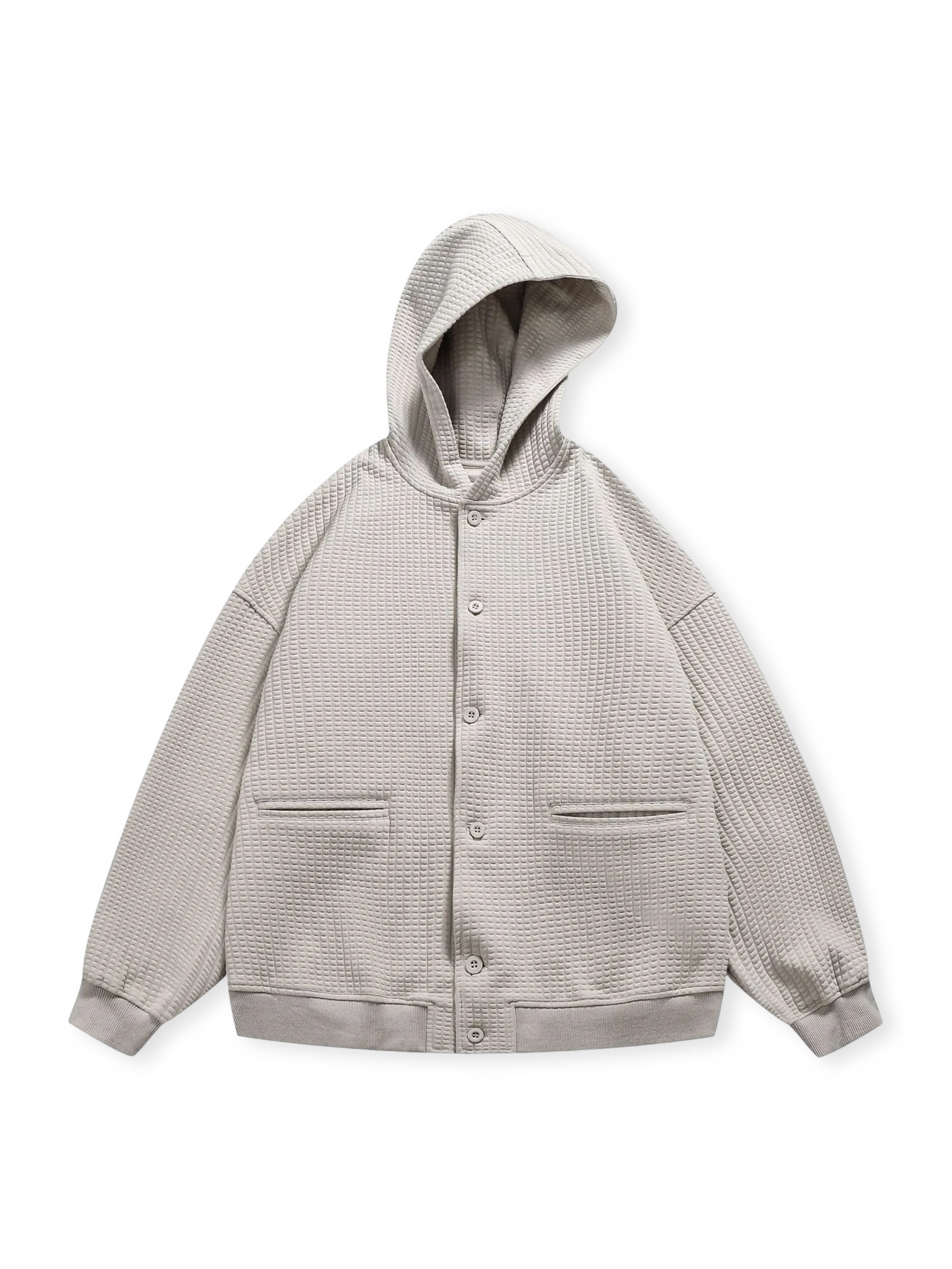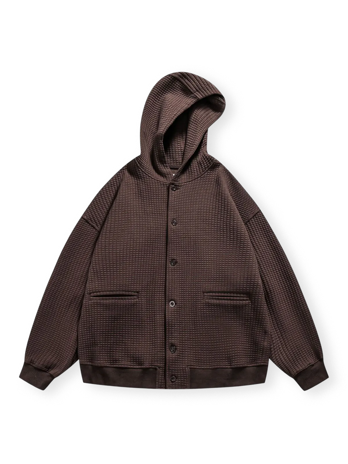 ワッフルチェック柄とフードデザインが融合し、スポーティーかつカジュアルな印象を与える、快適で保温性に優れたオールラウンドジャケットです。
