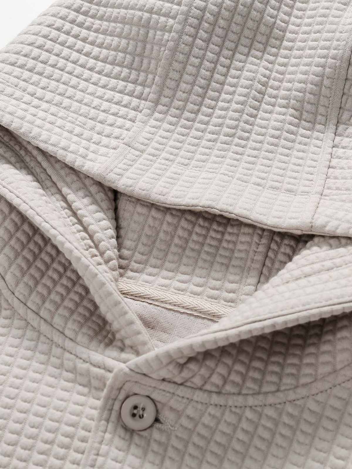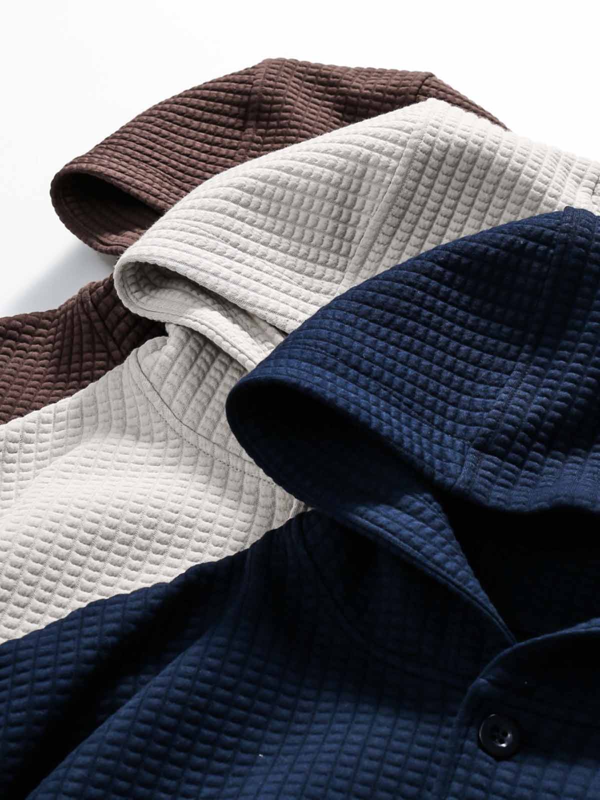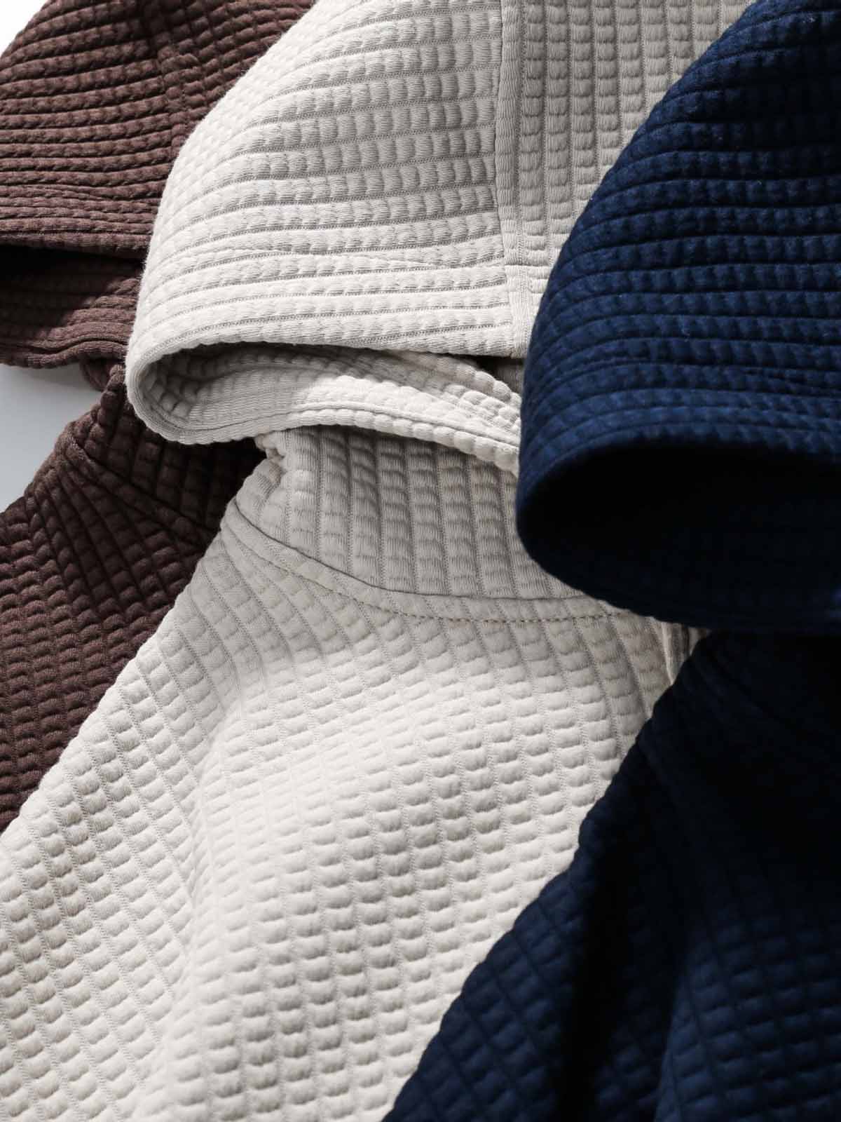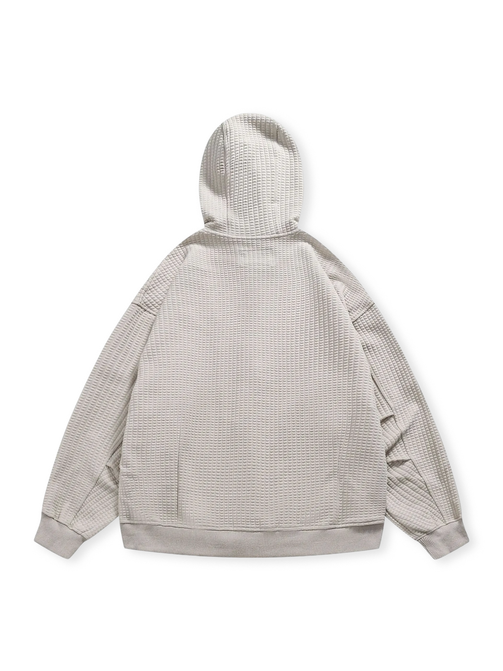ワッフルチェック柄とフードデザインが融合し、スポーティーかつカジュアルな印象を与える、快適で保温性に優れたオールラウンドジャケットです。