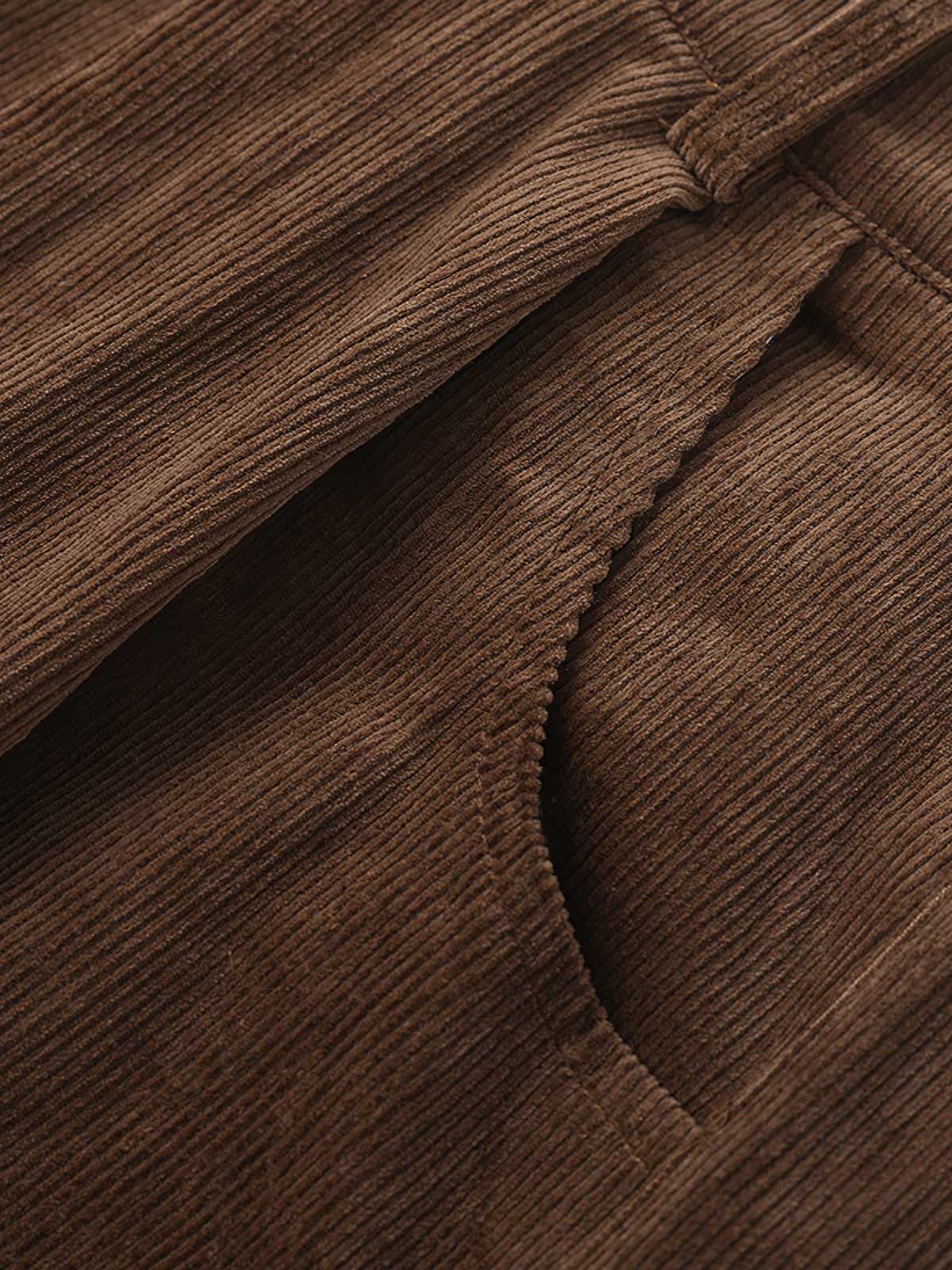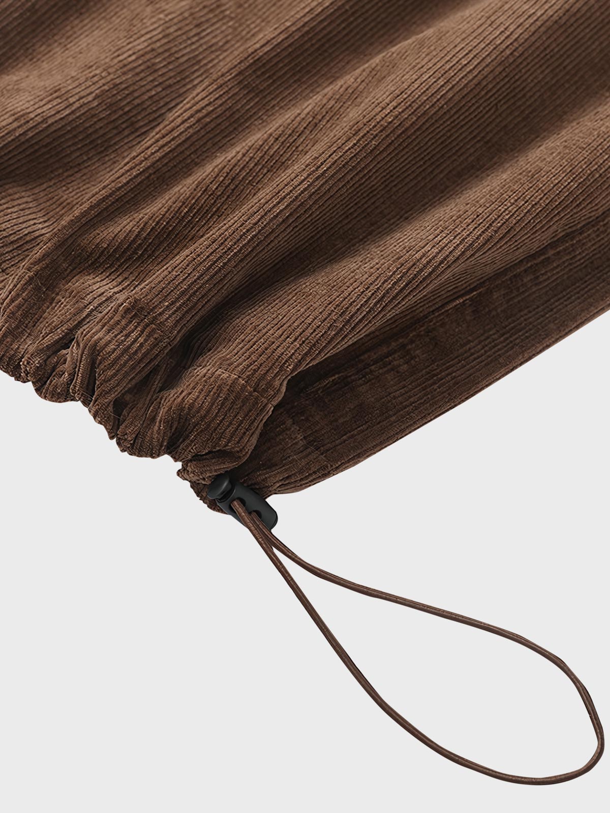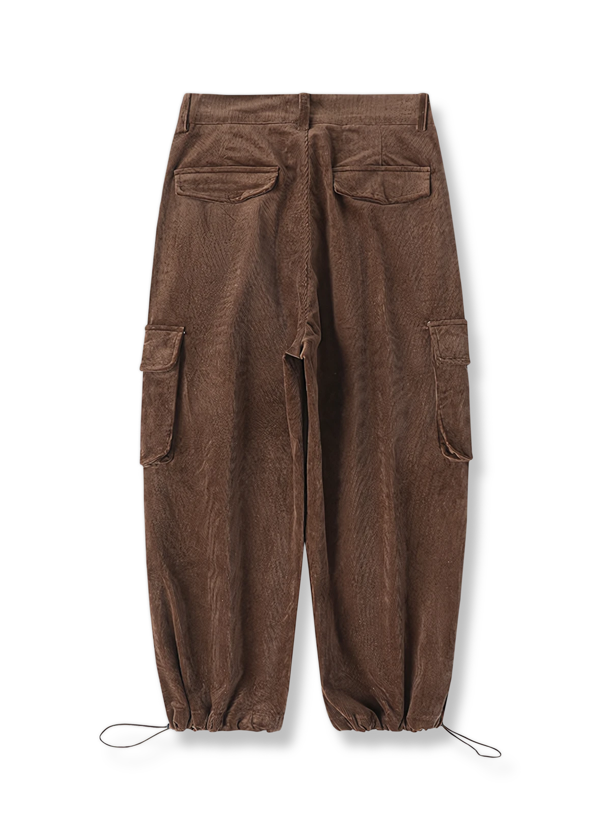 このコーデュロイパンツは、日本のレトロスタイルをデザインのインスピレーションとして、伝統的な要素と現代のカジュアルスタイルを融合しています。パンツの製造は細部にまでこだわり、大きなポケットのデザインは実用性を高めるとともに、レトロなワークウェアスタイルの典型的な要素です。裾のドローストリングデザインは、必要に応じてパンツの足首のフィット感を調整でき、着用の柔軟性を向上させます。