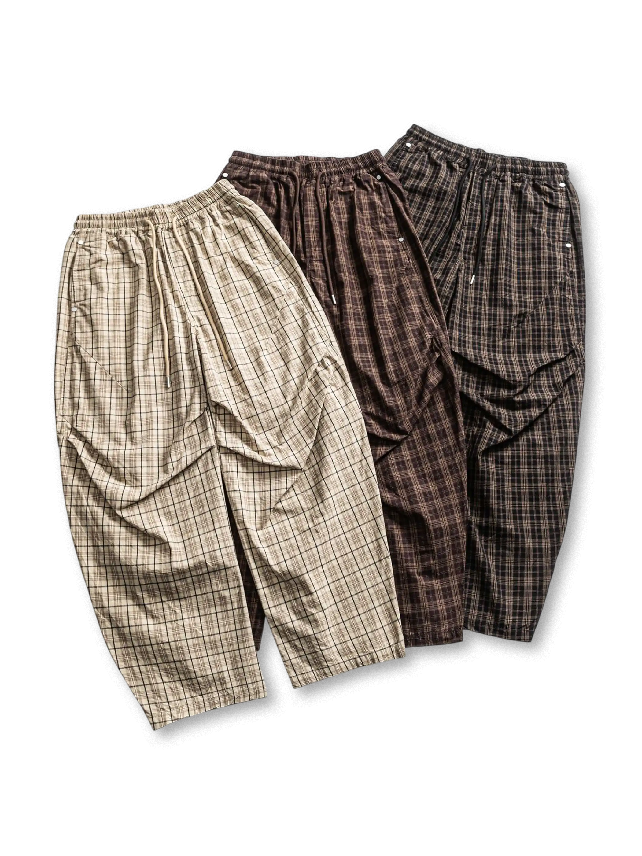 クラシックなチェック柄をベースに、腰回りから裾にかけてゆったりとしたワイドシルエットを採用。コットン100%の生地は通気性と肌触りが良く、季節を問わず快適に着用できる。ウエストはゴム仕様で、ラクな履き心地とサイズ調整のしやすさを両立。ワークからカジュアルまで幅広いコーディネートにマッチし、色展開も豊富で着回しの幅が広い一本。