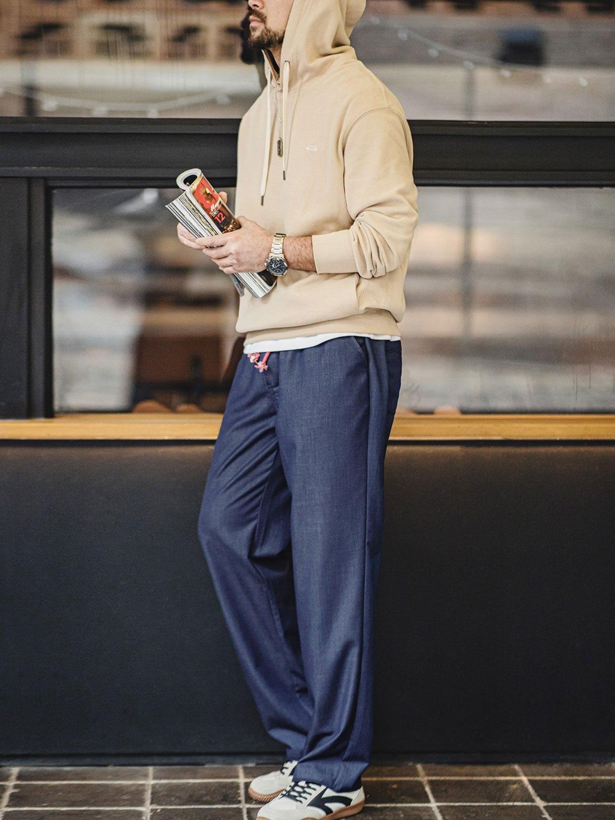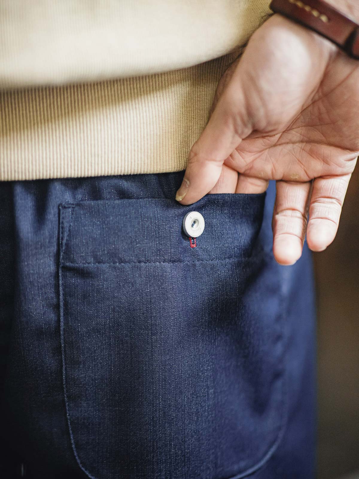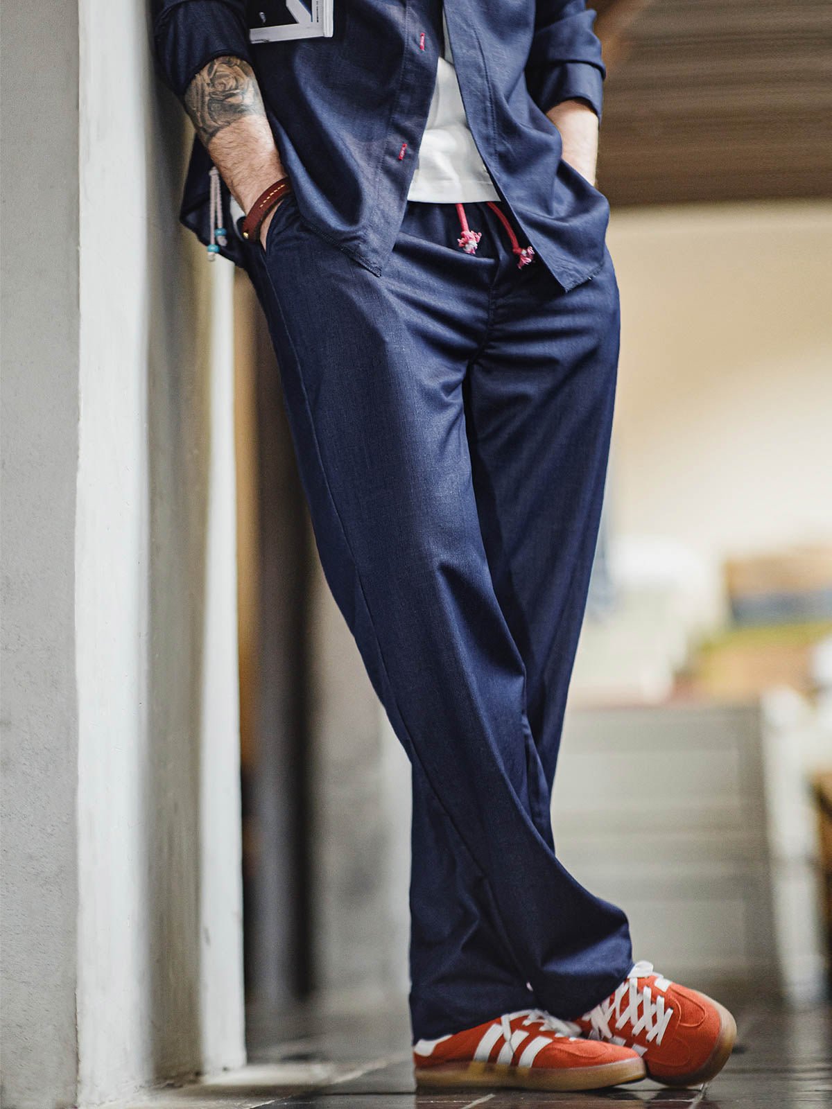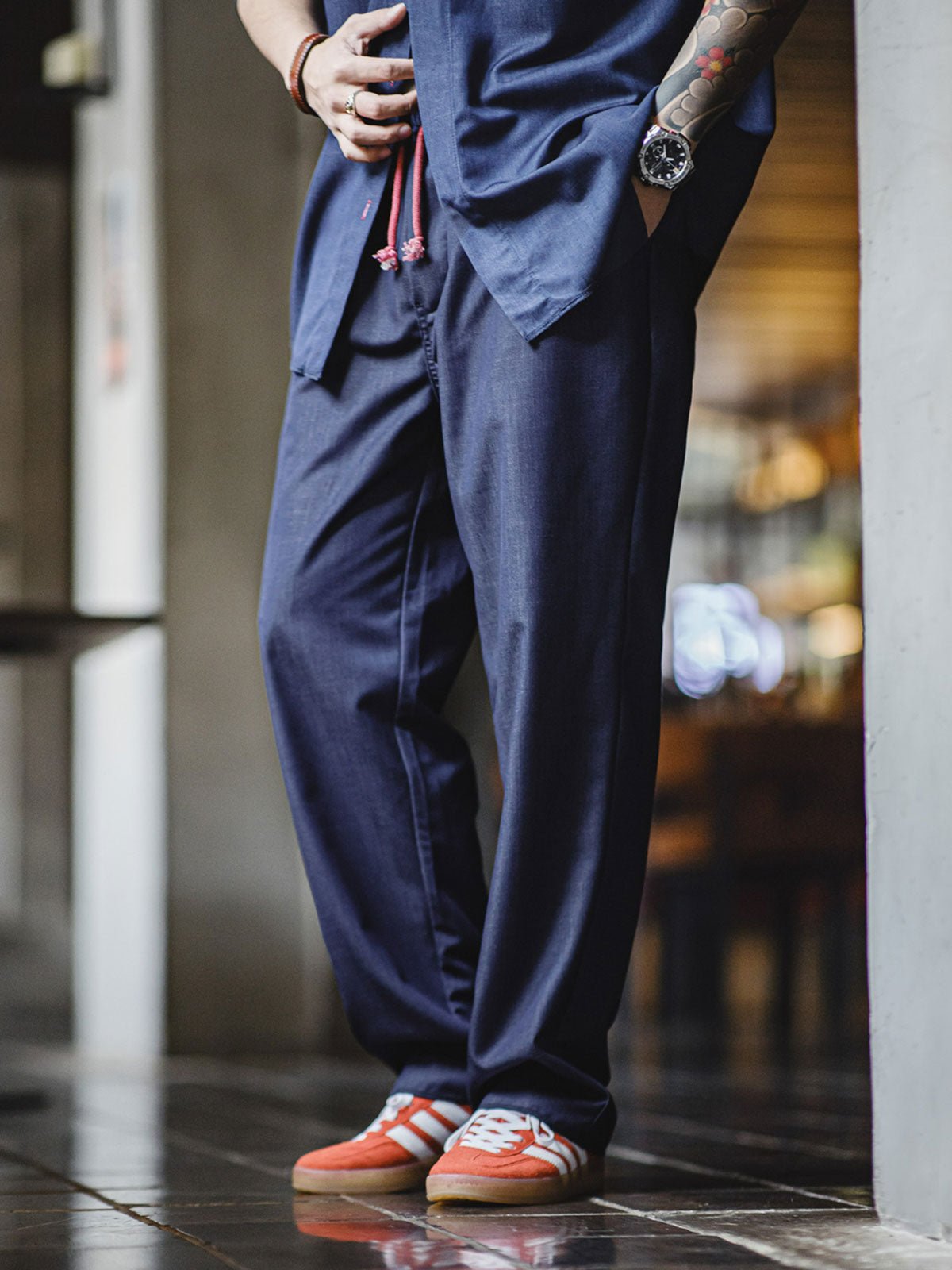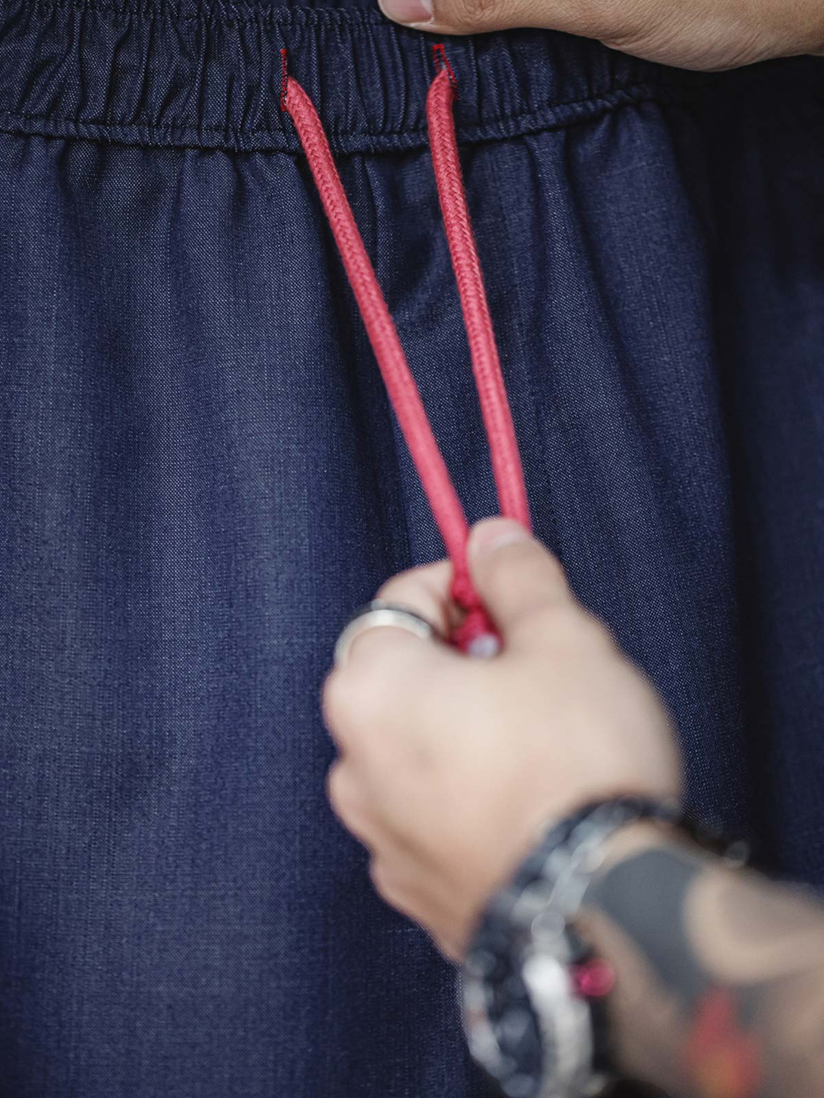 機能性とスタイルを融合させた撞色のドローストリングとエンボスボタンは、時折見え隠れすることで、パンツのディテールへの注意を促します。クールブルーの色合いはデニムのようなカジュアルさを漂わせながらも、優れたドレープ感を提供します。