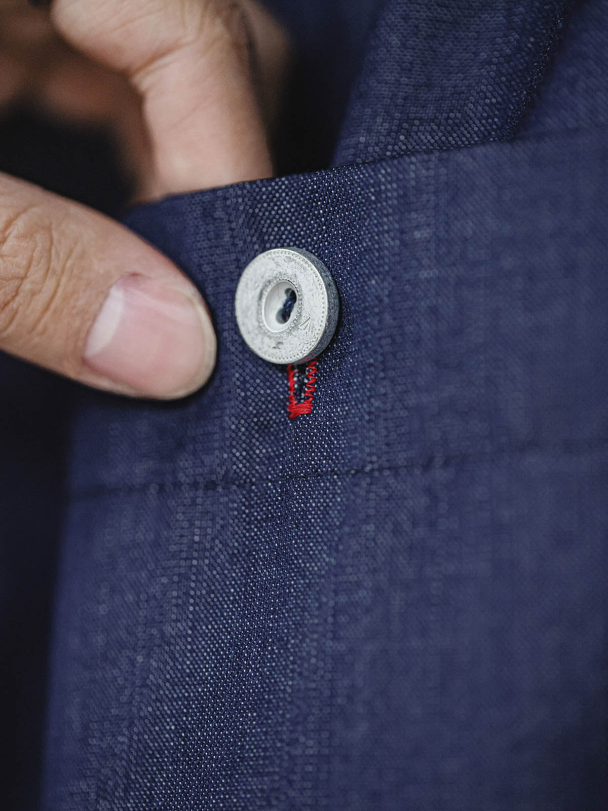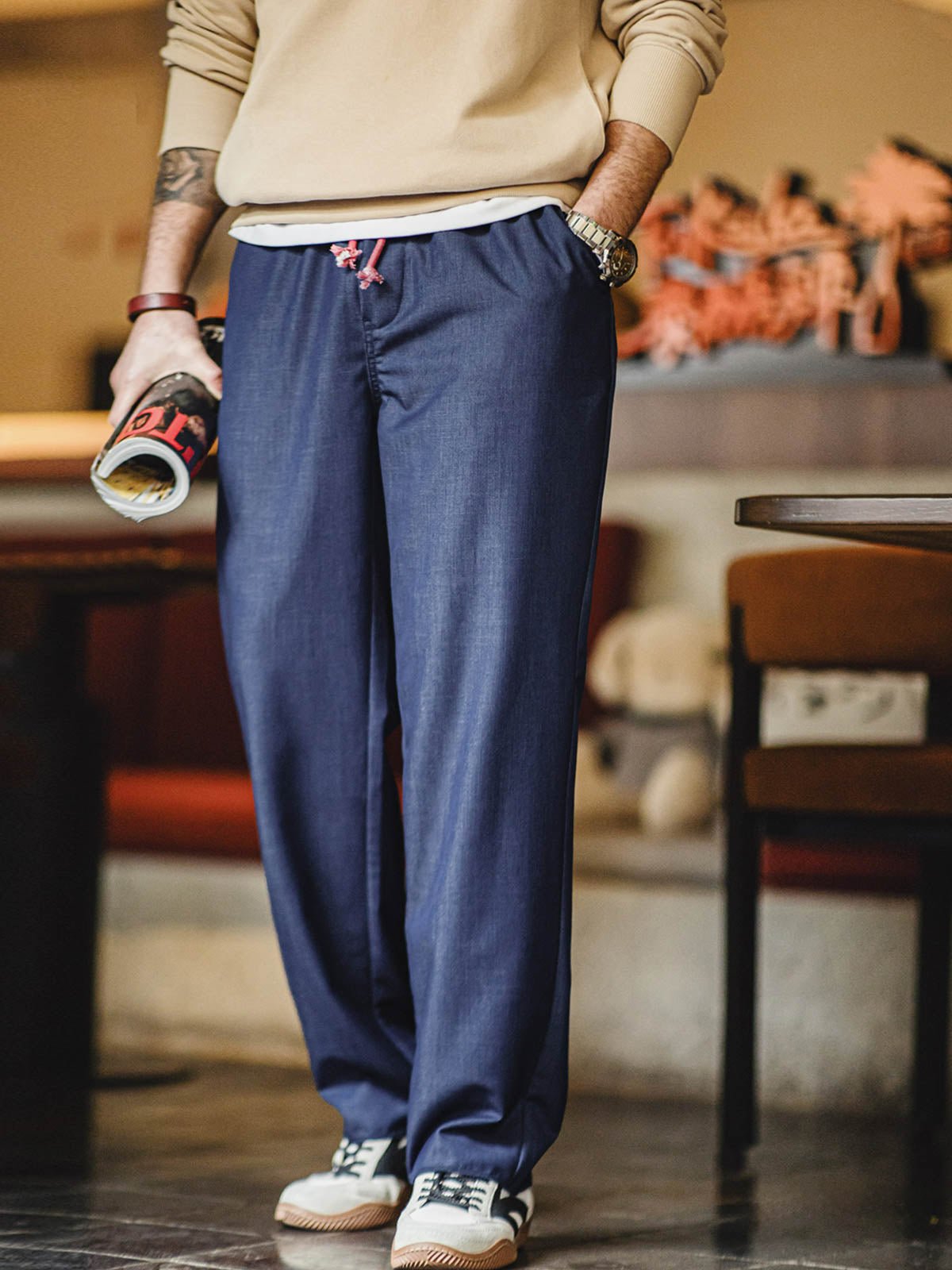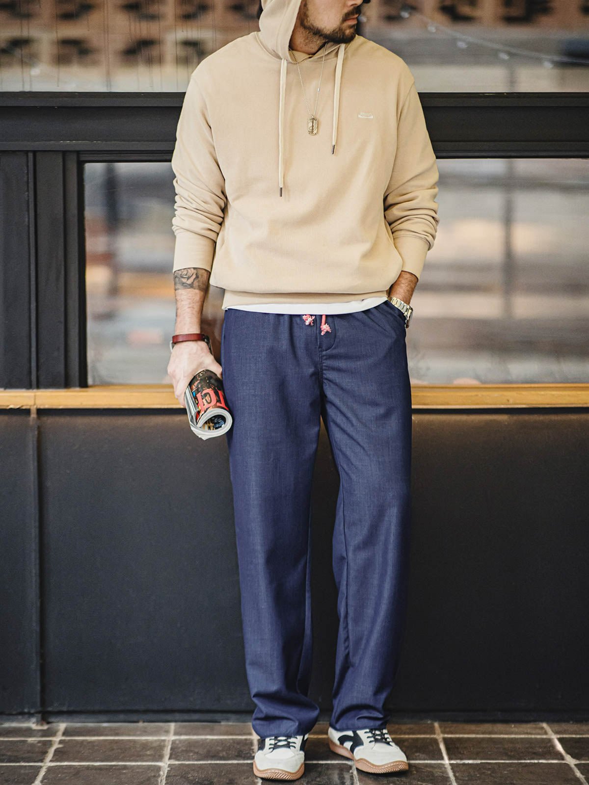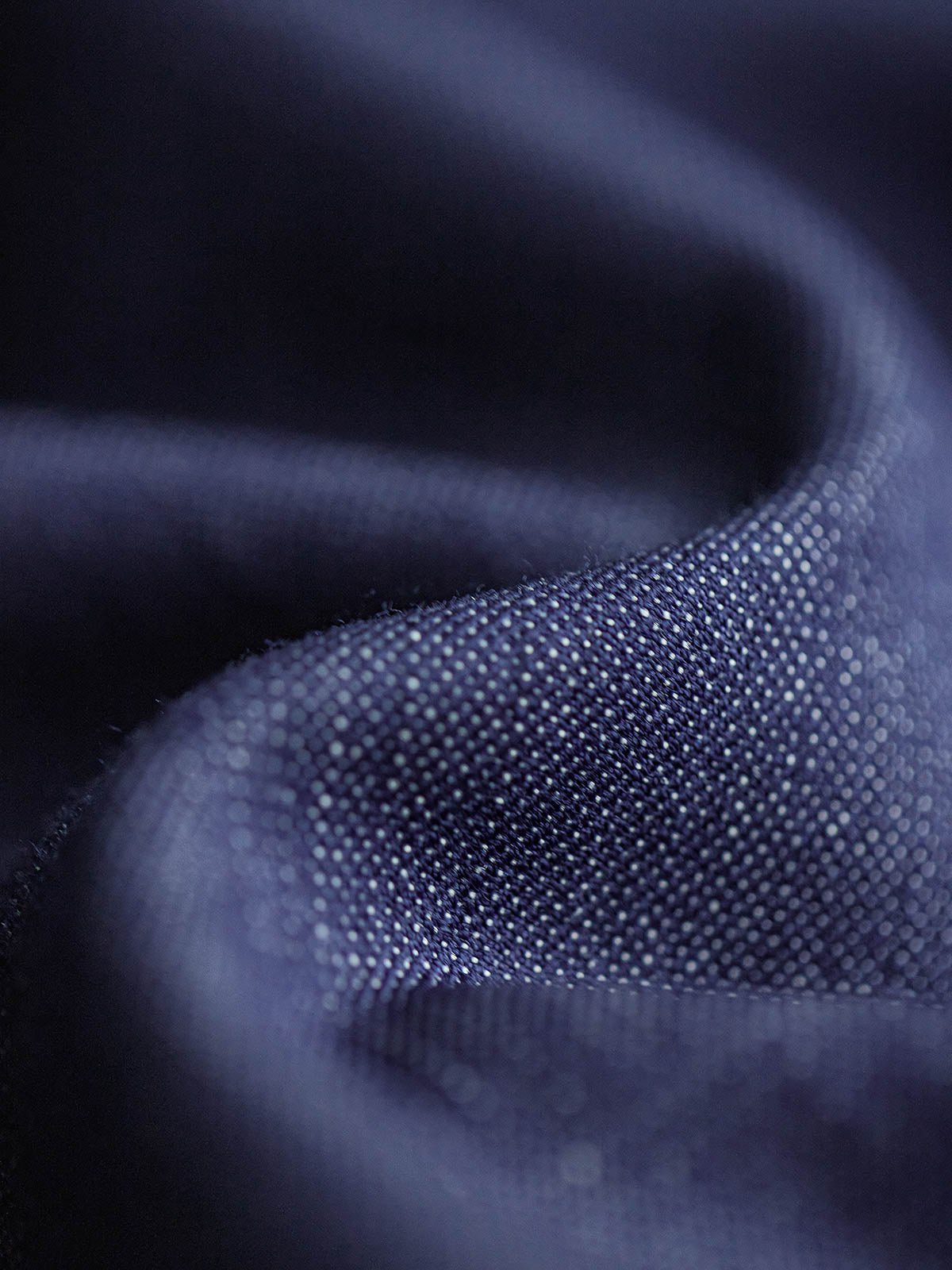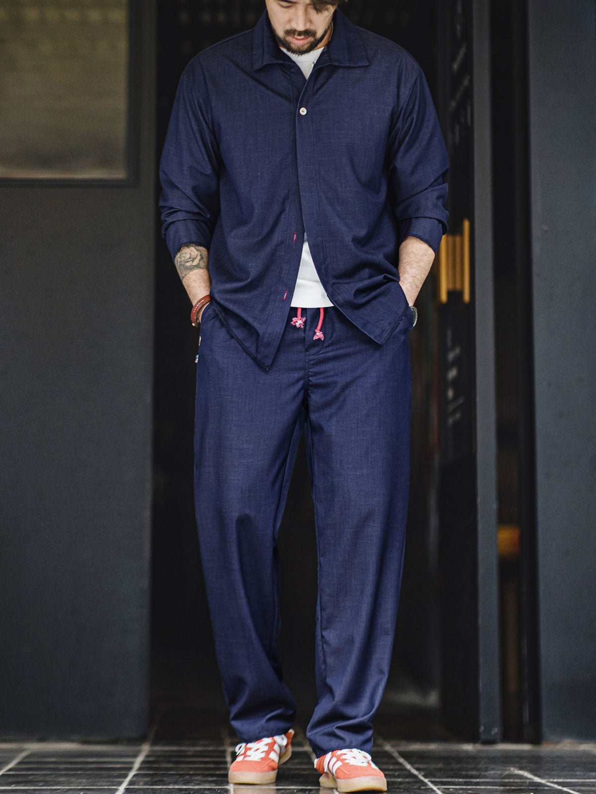 機能性とスタイルを融合させた撞色のドローストリングとエンボスボタンは、時折見え隠れすることで、パンツのディテールへの注意を促します。クールブルーの色合いはデニムのようなカジュアルさを漂わせながらも、優れたドレープ感を提供します。